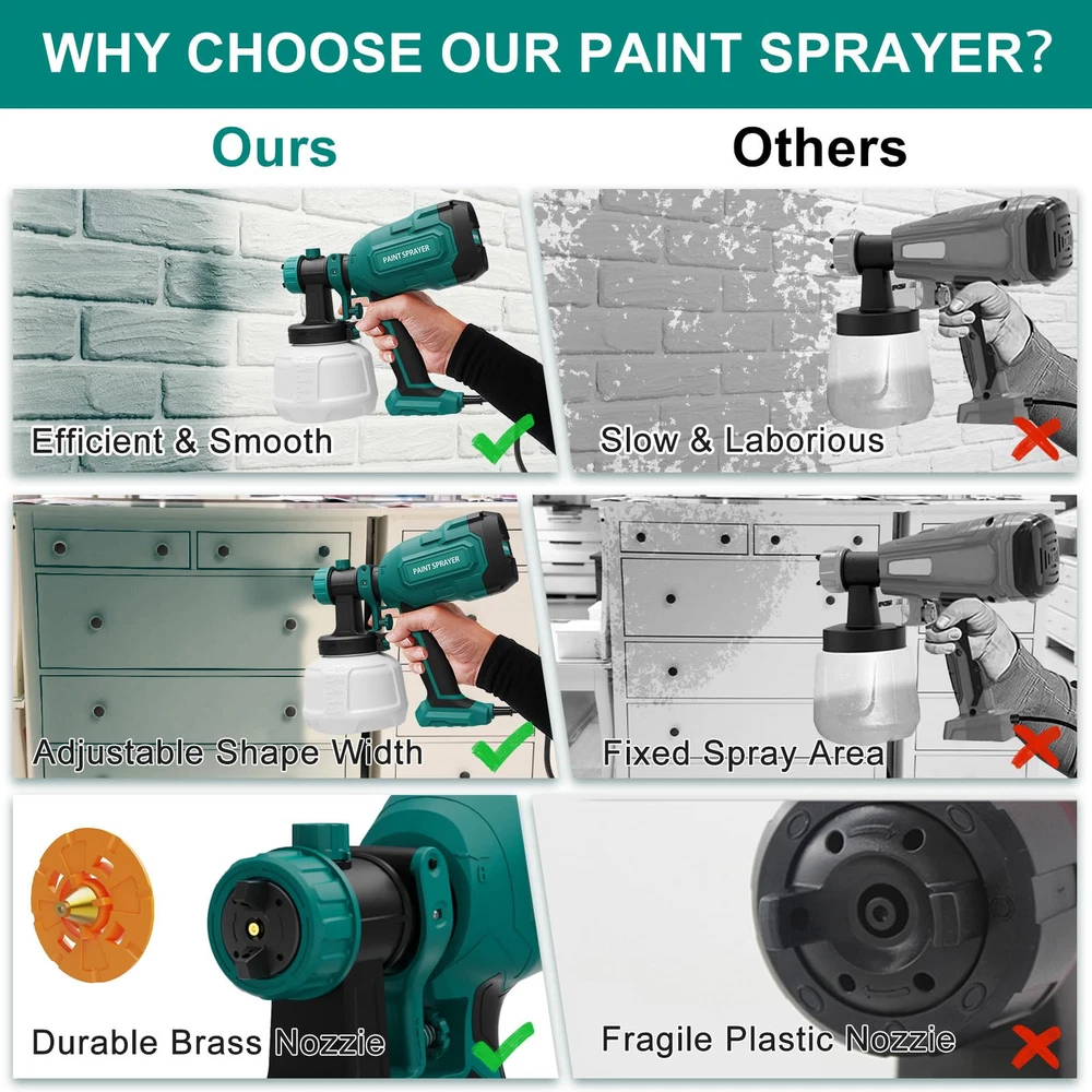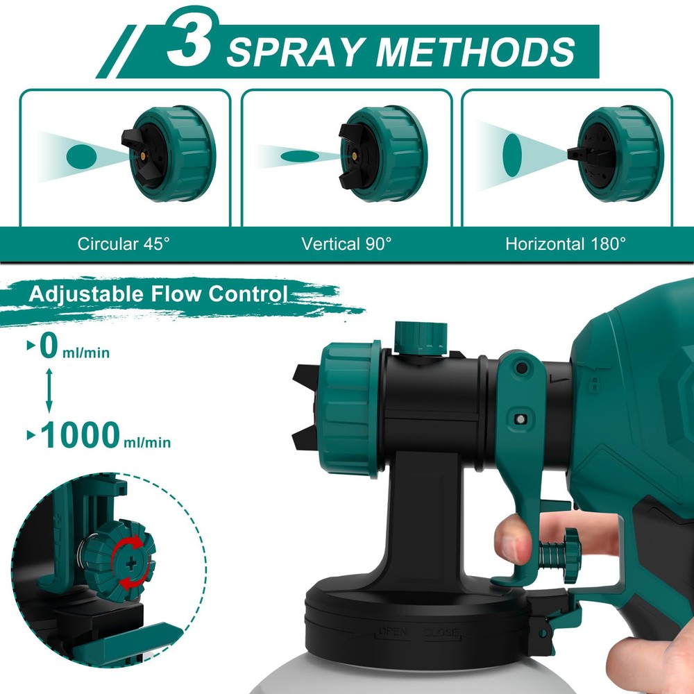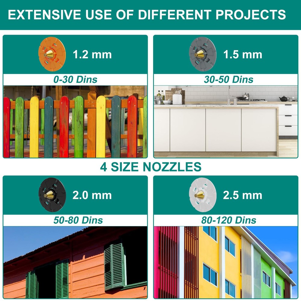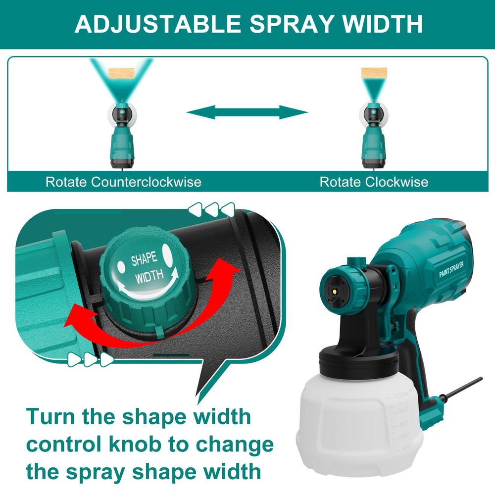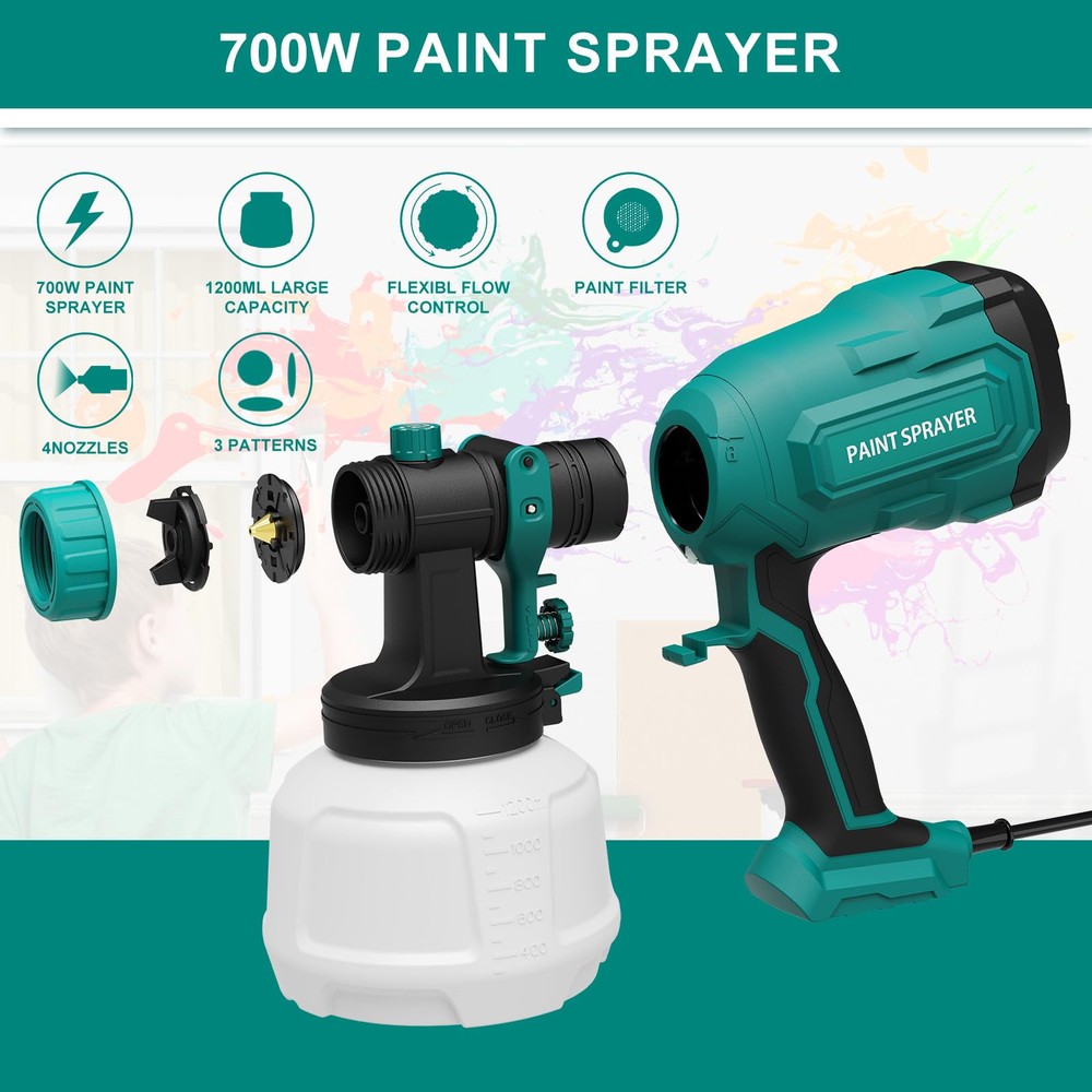 【4 Nozzle Sizes and 3 Spray Patterns】700W paint sprayer can be adjusted to 3 different spray patterns: horizontal, vertical and circular, and is equipped with 4 sizes of nozzles (1.2mm, 1.5mm, 2.0mm, 2.5mm ), suitable for a variety of spraying projects, such as furniture, cabinets, doors, walls, garden chairs, etc 【Adjustable spray width and flow control】Say goodbye to overspray and paint waste. The portable paint sprayer features an adjustable spray width knob that allows you to precisely manage the spraying area and optimize paint usage for various projects. In addition, the flow control knob allows you to easily adjust the paint flow to meet a variety of spraying needs, achieve better spraying results, and have greater flexibility 【Package Contents】1 X Paint Sprayer, 1 X 1200ml Container, 4 X Brass Nozzles, 1 X Cleaning Needle, 1 X Cleaning Brush, 1 X Viscosity Cup, 1 X Lid Pot, 1 X Filter, 5X Paper Funnel, 1 X User Manual 【Easy to Use & Clean】This paint sprayer can be assembled effortlessly without the need for any tools. Even if you're a beginner, you can start using it with ease after reading the manual. It comes with a cleaning brush and a needle to remove any hardened paint left in the nozzle, making it convenient and efficient for you to clean 【Upgraded Material】Brass nozzles exhibit remarkable advantages over plastic nozzles in terms of resilience to falls or compression, resistance to clogging, and ease of cleaning. The application of double-layered insulation materials guarantees a worry-free operation regarding safety concerns