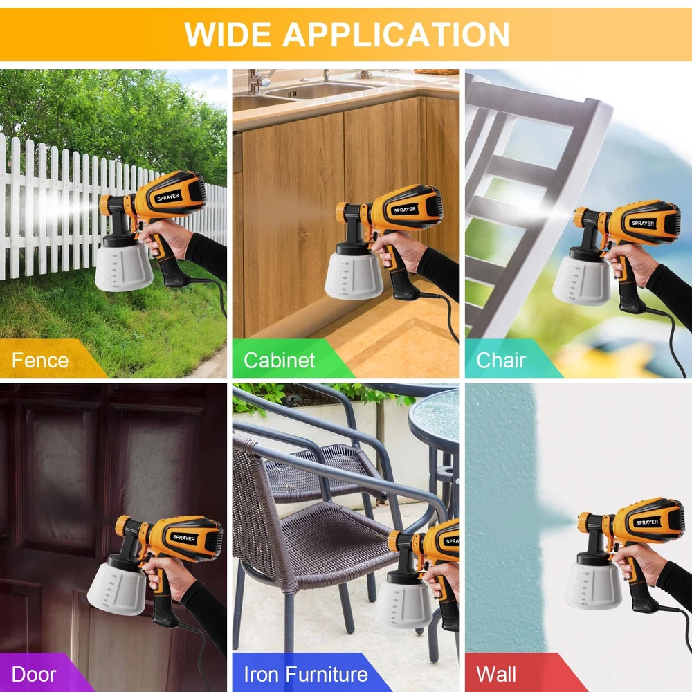 Please check the manual before use, if you have any questions about the product, please feel free to contact us, we will serve you within 48 hours. 【4 Nozzles & 3 Spray Patterns】700W paint sprayer equipped with 4 size nozzles(1mm,1.5mm,2mm, 3.0mm) for most painting projects, such as furniture, pickup, walls, doors, garden tables and chairs etc. Can be adjusted to 3 different spray patterns: horizontal, vertical and circular, so that it can be applied to a wide range of application scenarios 【Unique Blowing & Cleaning Functions】Before spraying, you can use the dust blowing joint with the paint sprayer to blow away the dust/debris on the surface to get a better surface spraying effect. After spraying, connect the cleaning connector to the faucet to clean the residual paint inside the pipe for easy cleaning 【Easy to Use & Clean】The paint sprayer can be easily assembled with no tools, even if you are a beginner, you can easily get started after reading the manual. It is very important to clean the paint sprayer thoroughly after use, it comes with a cleaning brush and a needle to clean paint left in the nozzle part 【Adjustable Flow Control】The amount of paint output can be controlled by adjusting the flow control knob to suit a wide variety of projects. According to different spraying effect requirements, reasonable control of paint flow can achieve better effect and avoid paint waste 【What You Will Get】1X Paint Sprayer, 4X Size Nozzles, 5 X Paint Filters, 1X Viscosity Cup , 1X Nozzle Cleaning Needle, 1X Cleaning Brush, 1X Dust blowing joint, 1X Clean connector, 1X Pot lid,1X User Manual. If you have any questions, please contact us via your order, you will get a reply in 18 hours, our technical team and after-sales team are always behind you