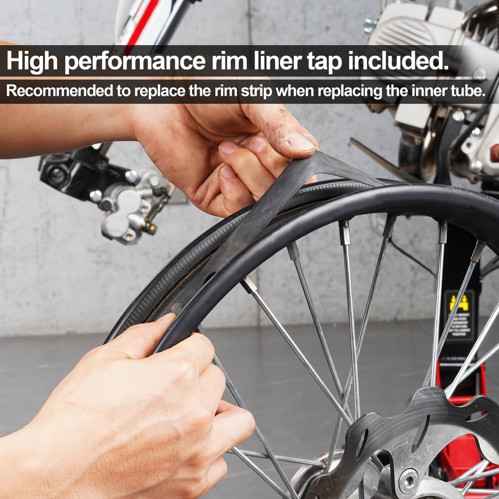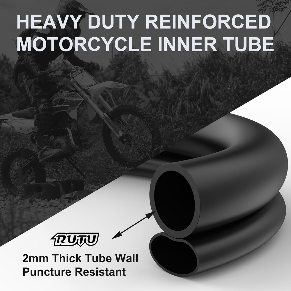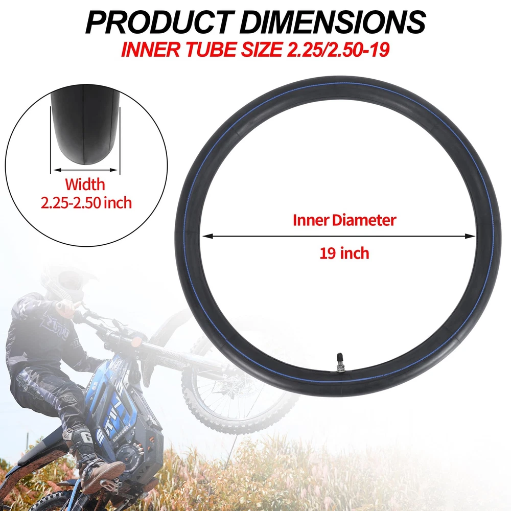 70/100-19 2.25/2.50-19 Dirt Bike Inner Tube,Heavy Duty 2 mm Reinforced Thickness Dirtbike Tubes 19 Inch with Rim Strip Copper Dust Caps for Surron Light Bee Talaria Sting PUNCTURE RESISTANT:super heavy duty 2mm thick inner tube is built to withstand the rigors of motocross and enduro use.Made from puncture proof butyl rubber, this dirt bike inner tube can better handle rough terrain as well as provide increased performance and durability. WIDE COMPATIBILITY:Our reinforced 2.25/2.50-19 inch inner tube fits 2.25-19,2.50-19,70/100-19 tires.19 inch inner tube is a perfect fit for Surron light bee Talaria dirt bikes. PROFESSIONAL : Set includes a dirtbike rim strip made from high-quality rubber material that can effectively protect the inner tube from spoke end punctures. HIGHER PERFOMANCE:High butyl content rubber provides better air retenion to prevent air leakage and offers better shock and vibration absorption performance for a smoother ride. PACKAGE INCLUDES:1×2.25/2.50-19 inner tube with TR4 valve stem,1 x plastic dust cap, 1×rim strip,1×spare copper dust cap.Please feel free to us with any questions.