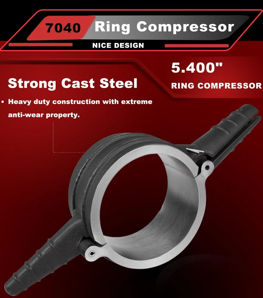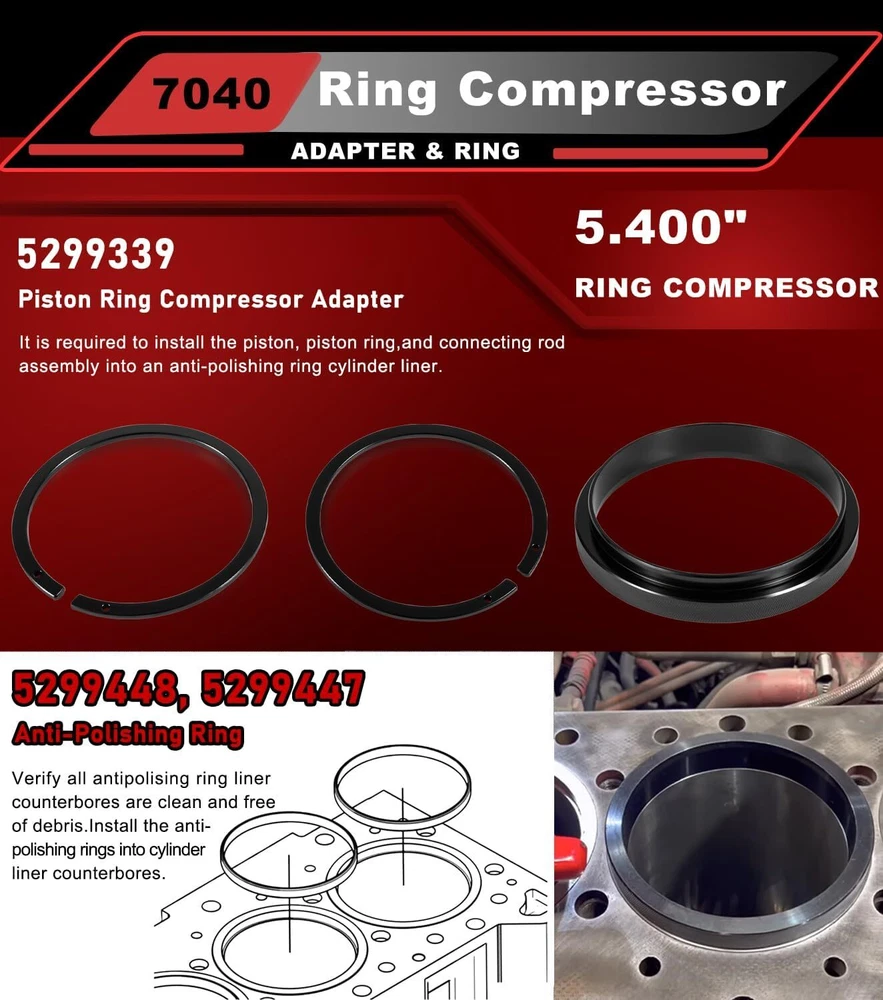 7040 For Cummins ISX QSX 15, Caterpillar 3400, 3406 Piston Ring Compressor Tool APPLICATION -- Suiltable for Cummins ISX QSX 15 & Caterpillar 3400, 3406, 3408, C15 -- 5.4" Bore. REPLACE OEM -- [Set of 4] 7040 Piston Ring Compressor Tool alternative to the PT-7040. Piston Ring Compressor Adapter Alternative to 5299339. Anti-Polishing Ring Alternative to 5299448, 5299447. FUNCTION -- Ring Compressor help for piston installation. Assures proper piston installation, reducing the possibility of broken rings. The Adapter Kit is required to install the piston, piston ring,and connecting rod assembly into an anti-polishing ring cylinder liner. Used in conjunction with 7040 piston ring compressor to install piston rings into antipolishing cylinder liners. QUALITY -- Manufactured from Strong Cast Steel. Powder-Coated to ensure Corrosion-Resistant. Using top of the line machining and measuring equipment to ensure each part is manufactured to OEM quality standards and specifications. PACKAGE INCLUDED -- [Set of 4] 7040 Piston Ring Compressor Tool For CAT 3406, 3408, C15 &CUMMINS ISX QSX 7040 Piston Ring Compressor For CATERPILLAR 3400, 3406, 3408, C15 & CUMMINS ISX QSX 15 -- 5.4" Bore Piston Ring. REPLACE OEM 7040 5.4" Bore Design with connecting rod. Assures proper piston installation, reducing the possibility of broken rings. For CAT 3406, 3408, C15 &CUMMINS ISX QSX Piston Ring Compressor Adapter & Anti-Polishing Ring For CATERPILLAR 3400, 3406, 3408, C15 & CUMMINS ISX QSX 15 -- 5.4" Bore Piston Ring. Piston Ring Compressor Adapter Alternative to 5299339. Anti-Polishing Ring Alternative to 5299448, 5299447. Used in conjunction with an existing piston ring compressor to install piston rings into antipolishing cylinder liners. How To Install Piston For Cummins ISX ? Step 1 Prepare the piston. Flip the compressor over. Install the Ring Compressor. Step 2 Just squeeze and then put in the connecting rod to hold the whole part in place. Step 3 Install the Piston Ring Compressor Adapter. Hold the whole assembly in place, drop it down into cylinder. Step 4 Push the piston until the top ring is completely in the cylinder liner. Complete Kit (1) 7040 Piston Ring Compressor 5.4" Bore - PT-7040 (1) Piston Ring Compressor Adapter - 5299339 (1) Anti-Polishing Ring - 5299448 (1) Anti-Polishing Ring - 5299447 For Caterpillar 3400, 3406, 3408, C15 & Cummins ISX QSX -- 5.4" Bore Piston Ring Special Design Help you to easily flip the compressor over. 5.4" Bore For CATERPILLAR 3400, 3406, 3408, C15 & CUMMINS ISX QSX 15 -- 5.4" Bore Piston Ring. Connecting Rod Install the pin will help you squeeze the compressor and hold the whole part in place. Top Quality Strong Cast Steel. Ring Compressor help for piston installation. Time & Money saver! Payment Delivery details Terms of sales Contact us Payment Orders will be ship out within 1-3 business days after payment has cleared. Delivery details Orders from Saturdays, Sundays or holidays will process on next business day and will be ship within 24 hours. Some shipments could take longer subject to your local customs authorities. We only ship to confirmed ebay addresses. Your ebay address MUST MATCH your Shipping address Terms of sales We accept 60 days return guarantee for all Items If you are unsatisfied with something you bought from us, you may send it back within 60 days of receipt, and we shall be happy to exchange or refund. Contact us If you have any question, please email contact me, we can solve all the problem. Brand Carparts_89 Manufacturer Part Number 7040 Type Piston Ring Fitment Type Direct Replacement Warranty 1 Year Items Included Piston Rings OE/OEM Part Number 7040 Manufacturer Warranty 1 Year Material Steel Interchange Part Number PT-7040,, 5299448, 5299447 and 5299339, Application For Cummins ISX QSX, Caterpillar (CAT) 3400 Color Black Piston Diameter See the detail