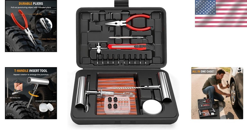 Tire Repair Kit 70 PCS Heavy Duty Flat Patch Plug Tool Set for Car Motorcycle ‹ › ‹ › ‹ › ‹ › ‹ › ‹ › ‹ › ‹ › ‹ › ‹ › ‹ › Heavy Duty Tire Repair Kit - 70 PCS Experience peace of mind on the road with our comprehensive 70-in-1 Tire Repair Kit . Ideal for cars and motorcycles alike, this kit ensures you're prepared for any tire mishap. Features: Complete Set: Includes tire repair plugs, repair strings, lubricant, insert tool replacement, handle insert tool, nose pliers, knife, and more! Sturdy & Durable: Crafted from high-quality steel and zinc alloy that is less prone to rust. Flexible Tire Strips: Made of butyl rubber and natural rubber vulcanization to stay flexible and resist aging. Easy to Use: Designed for simplicity, you can get back on the road quickly in case of a puncture. Portable Case: All tools come neatly packed in a compact suitcase for easy storage in your vehicle. Powerful Function: Works with any tubeless tire - suitable for trucks, bikes, lawn mowers, sedans, and more. 24/7 Customer Support: Trust in our dedicated customer service for any product inquiries or concerns. Why Choose Our Tire Repair Kit? Driving should be a joy, not a worry. Our Heavy Duty Tire Repair Kit provides an all-in-one solution for unexpected tire emergencies. You'll never have to scramble for tools again; everything you need is included in this carefully curated set. Built for durability and ease of use, you can tackle any tire issue confidently. Don't leave your safety to chance—invest in our Heavy Duty Tire Repair Kit today and drive with the assurance that you're prepared for anything! Shipping Free & Fast Shipping - We offer free shipping to most of the USA with a normal delivery time of 3-7 days. However, due to the current situation, additional delivery time (up to 3 weeks) may be required for some items. Alternative Carriers - We may use alternative carriers (e.g. USPS, FedEx, UPS, etc.) to ensure your package arrives safely and on time. Due to the use of multiple carriers, we are unable to provide a tracking number automatically. Handling Time - Orders are processed and shipped within 1-2 business days of receiving cleared payment. Shipping Restrictions - Shipping to Alaska, Hawaii, Puerto Rico, Guam, and other US territories may incur shipping charges or delivery restrictions. Please contact us before ordering, or your order can be refunded/cancelled. State Restrictions - There may be restrictions based on your state of purchase. For example, certain items may not be shipped to California due to state regulations. Contact for Tracking Updates - If you require tracking updates or have any concerns about the delivery of your order, please feel free to contact us, and we will be happy to assist you. Return 30-Day Hassle-Free Returns - We want you to be completely satisfied with your purchase. If you are not, you can return the item within 30 days of receiving it for a full refund or exchange. Easy Return Process - To start a return, simply contact us and we will provide you with a prepaid return shipping label and detailed instructions. Restocking Fee - There are no restocking fees for returns. However, the buyer is responsible for return shipping costs if the return is not due to a seller's error. Refund Processing Time - Refunds will be processed within 5 business days of receiving the returned item in its condition. Payment We accept all major credit cards, PayPal, and Apple Pay for your convenience. Your payment information is secure and encrypted to ensure a safe and seamless transaction. Please complete your payment within 3 days of purchase to avoid any delays in shipping. Feedback Your feedback is extremely important to us. We strive to provide the best products and customer service possible. If you are satisfied with your purchase, please take a moment to leave us a positive review. If you have any concerns or issues with your order, please contact us before leaving negative feedback. We are committed to resolving any problems and ensuring your satisfaction. Contact Us If you have any questions or concerns, please feel free to out to our customer support team. You can contact us through the eBay messaging system. We are available Monday to Friday, 9:00 am to 5:00 pm EST, and we will do our best to respond to your inquiry within 24 hours. Buy it now and enjoy a pleasant shopping experience! Placement on Vehicle: None Material: Steel,Zinc Alloy,Butyl Rubber,Natural Rubber Finish: Uncoated Type: Tire Repair Kit