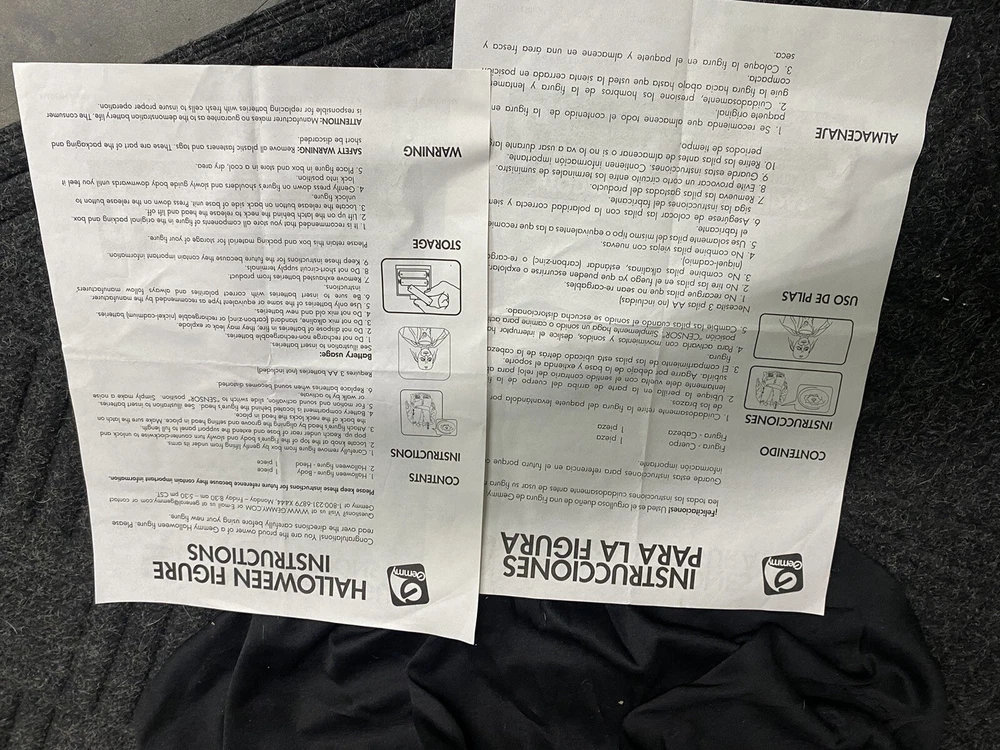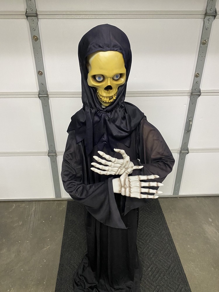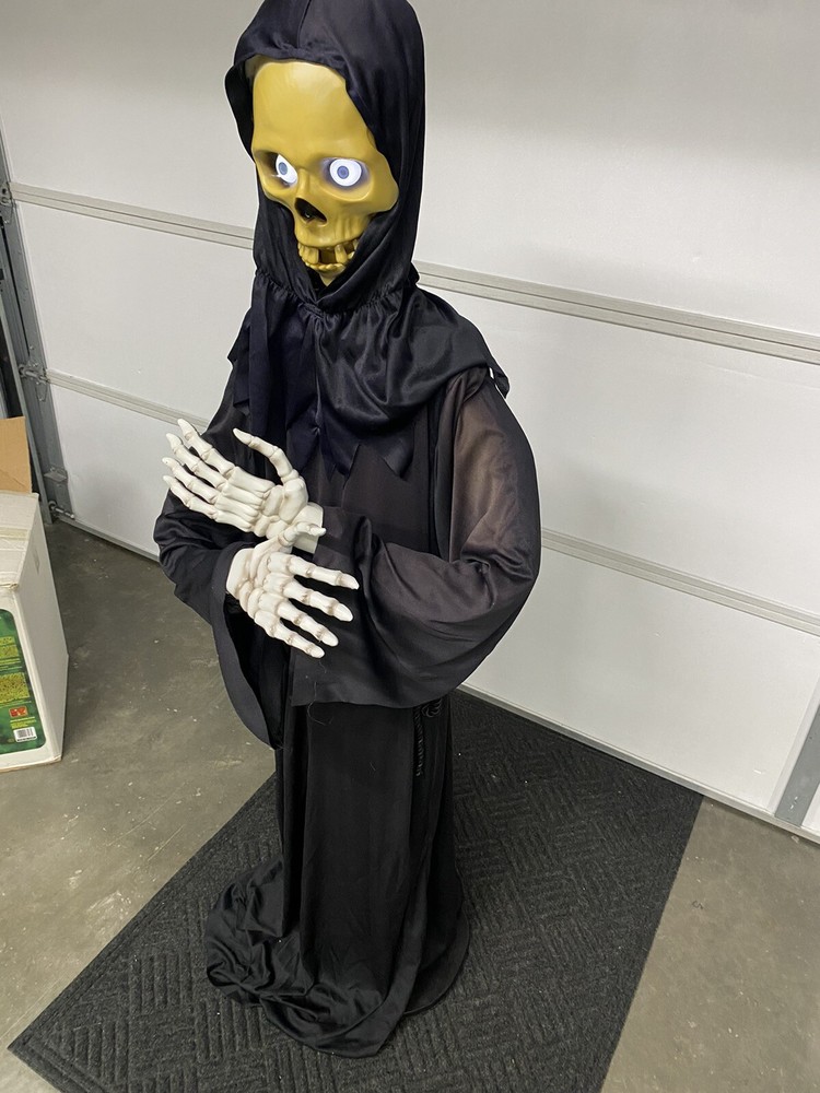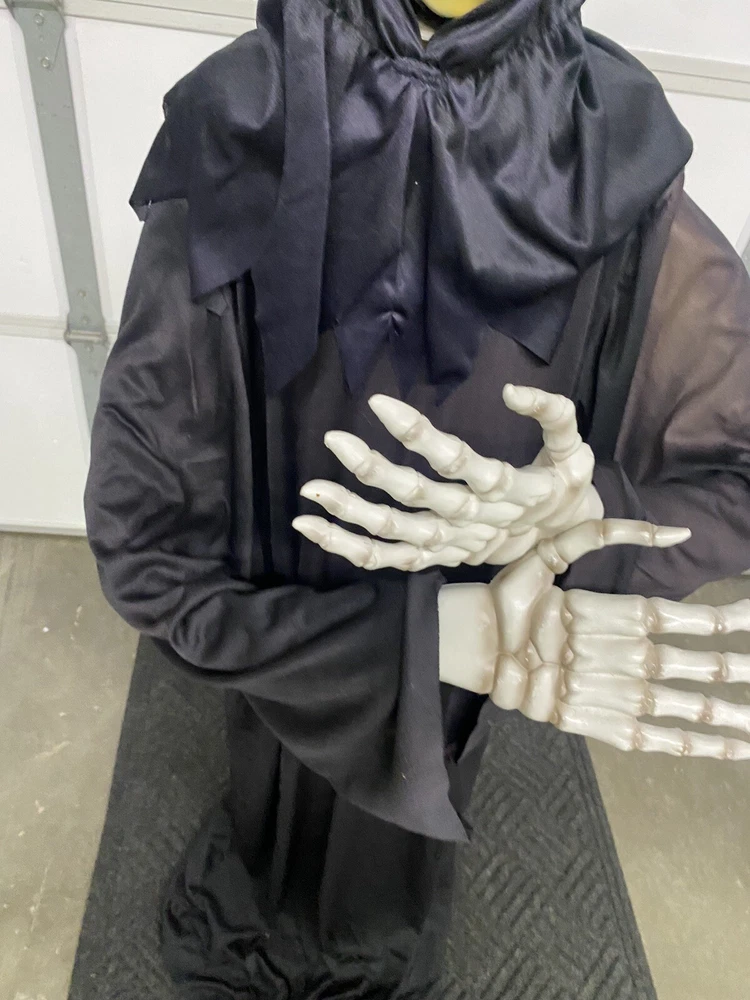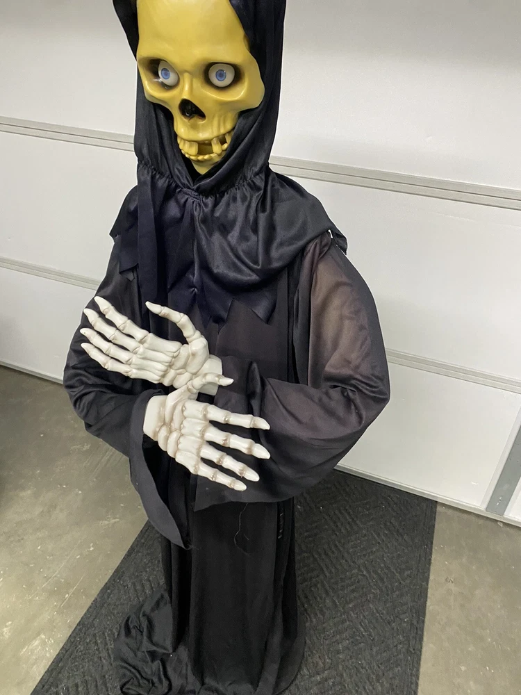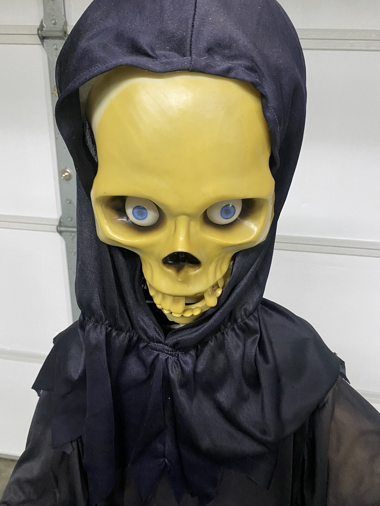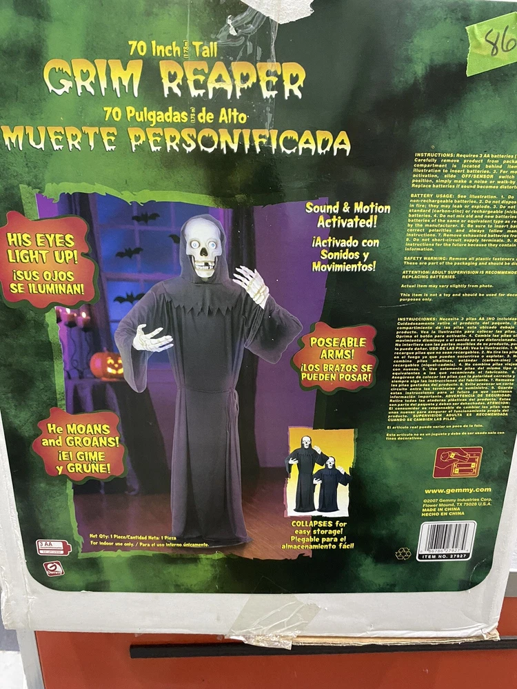 This Gemmy 70" tall grim reaper is sound and motion activated, his eyes light up and he moans and groans. He has posable arms and is collapses down for easy storage. He requires 3 AA batteries that are not included. He has a yellowed face and one side of his robe has faded all from sun exposure but he works great. You get the actual item pictured so please look at all photos and ask any questions before purchase.