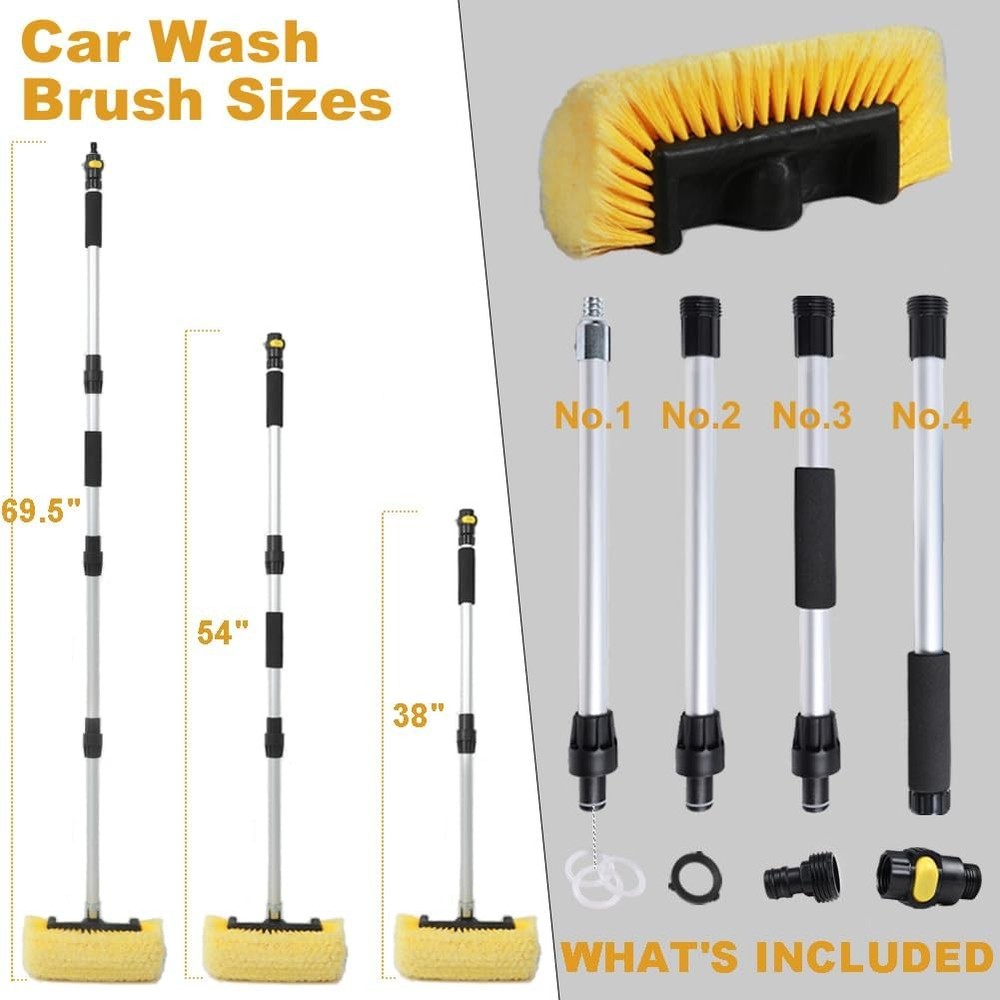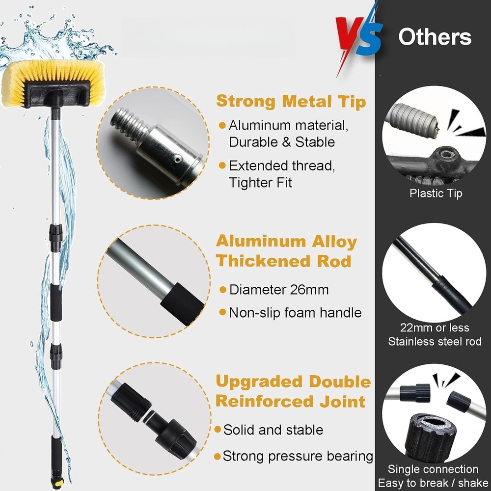【 Efficient Cleaning 】 Achieve sparkling clean cars with our car wash brush with hose attachment. Easily connect this car wash wand brush to your hose for a steady water supply during the cleaning process. Control the water flow with the built-in on/off water flow switch 【 Strong Non-slip Handle 】 Our Car Washing Brush features a 66" long handle made of 26mm thick aluminum alloy. The new rod connections are resistant to bending, loosing, breaking or leaking. It also features two foam grips for extra control. You can hold the car wash brush with handle well even if your hand is wet or slippery 【 5-Sided Soft Brush Head 】The bristles of our soft rv wash brush are made of high quality PVC, make this truck wash brush abrasive enough to remove dirt but won't scratch paint. The side-protecting bristles not only protect your vehicle from scratches, but also help clean wheel rims, mirrors, and more 【 Smooth Water Flow 】Unlike other single-outlet car wash brushes that tend to cause water splashing, our improved car wash brush head features four built-in water outlets, ensuring a smooth and gentle water flow when using the water flow through function. The larger 12-inch brush head can hold more water and foam, resulting in a more efficient and gentler car clean experience 【 Versatile Car Wash Supplies 】The assembled car wash brush with long handle reaches a total length of 70“, offering unmatched flexibility and comfort for cleaning hard-to-access areas. Perfect for cleaning or washing Solar Panels, House Siding, Auto Cars, Trucks, SUV, RV, Camper, Boats, Decks, Floors, Patios, Bathrooms, Showers, Snow Removal and more! 【 Leak-proof and Secure 】This car cleaning brush features seals at every joint to prevent leaks. There's a rubber gasket inside the brush head's threads, and a silicone ring around the thread tip of the handle to further prevent leaks—almost too much. If too many seals cause the brush head to loosen from the handle, you can remove one or two to solve the problem