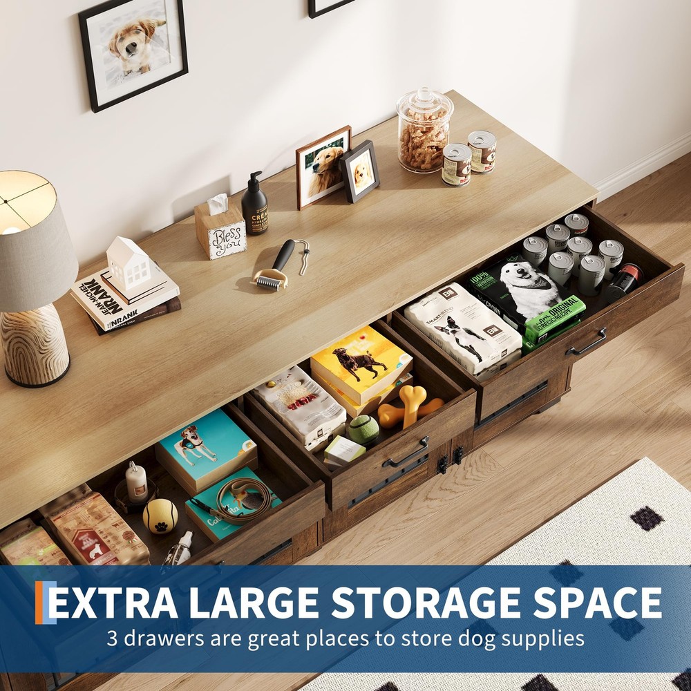 71" Dog Crate Furniture with Door, Double Kennel & TV Stand for Large Dogs, 3-Drawer Storage, Brown Key Features & Benefits Dual-Function Dog Crate & TV Stand Serves as both a secure indoor kennel for large dogs and a stylish TV stand or end table, perfectly blending pet furniture with your home decor Chew-Proof Reinforced Construction Built with sturdy MDF and 0.5-inch thick reinforced iron pipes that withstand even the most determined chewers, ensuring long-lasting durability 3-Drawer Smart Storage System Features three convenient drawers that organize pet essentials like toys, treats, and food while keeping household items neatly stored Spacious Double Kennel Design Provides ample room for large breeds to stretch and relax, with secure doors and proper ventilation for your pet's comfort and safety Elegant Furniture-Grade Finish Finished in rich brown that complements any decor style, transforming from practical pet crate to sophisticated living room centerpiece Product Specifications Dimensions: 71" L x 22.1" W x 25.8" H Material: MDF with Reinforced Iron Pipes Features: 3 Storage Drawers, Double Kennel Use: Indoor Dog Crate & TV Stand Color: Brown Suitable For: Large Breed Dogs Package List 1 x Dog Crate Furniture Main Unit 1 x Set of 3 Storage Drawers 1 x Assembly Hardware 1 x Instruction Manual