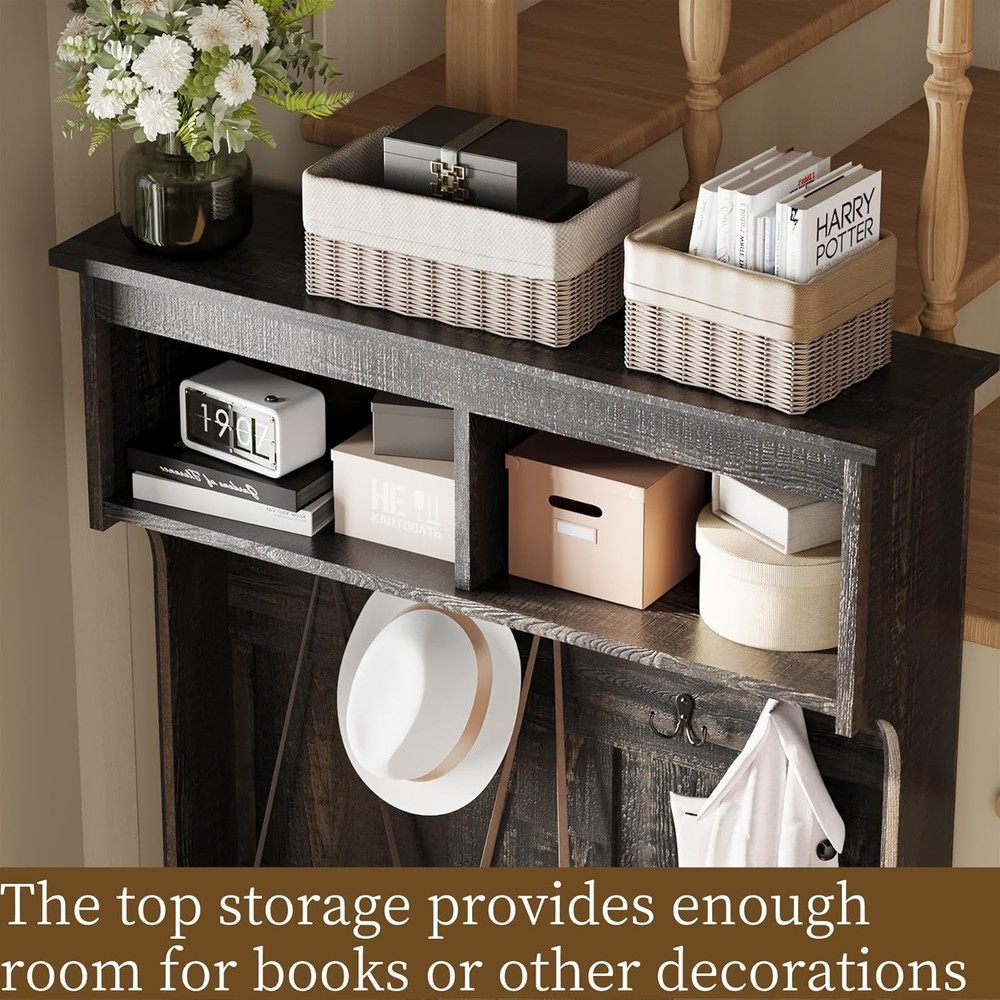 71" Entryway Small Hall Tree with Bench, 4-in-1 Coat Rack with Flip-top Door Storage Cabinet, Mud Room Bench with Storage and Seating, 5 Hooks, Coat Tree for Hallway, Rustic Dark Brown Product Description About this item [Elegant Mid-century Design]: The special irregular black and brown design is no longer simply black or brown. Its enduring color palette ensures a perpetual charm that never diminishes, immerse yourself in timeless sophistication with this hall tree, featuring a simplistic yet atmospheric design that seamlessly integrates into any decor. While the intricate craftsmanship elevates it to an exquisite piece of furniture that surpasses trends [Versatile Storage Solutions]: This multifunctional hall tree is designed to meet your various needs. The top dividers provide a place for displaying potted plants, photo albums, or other decorations, while the 5 hooks offer convenient storage for hats, pet leash and bags. Additionally, the bottom flap storage cabinet provides ample space for organizing your belongings [Sturdy And Durable]: Crafted from heavy-duty MDF board, the anti-toppling devices avoid the risk of sudden falling or collapse. The Farmhouse-inspired rustic retro design entry way hall tree with clearer illustrated instructions, putting it together was super easy. All the parts were labeled with numbers [4-in-1 Hall Tree with Bench]: 32 inch Wide tree hall it features 6 hooks, a comfy bench, a enclosed cabinet, and a top shelf for extra storage.The wide storage bench doubles as a seat for changing shoes on your commute and holds up to 200 lbs. Metal hooks are painted to prevent rust. Smooth surface is easy to clean and can be wiped down with a clean, damp cloth for longer life [ Why Choose Us? ]: Thank you for your support and trust in our hall tree. have a professional team and factories. In case of any issues, installation or packaging damage, please don't hesitate to reach out to us for a solution 5-๐—ถ๐—ป-๐Ÿญ ๐—›๐—ฎ๐—น๐—น ๐—ง๐—ฟ๐—ฒ๐—ฒ Create an Organized and Functional Entryway!!! Multifunctional Entryway Organizer Combines Open Shelves, Storage Cabinet, Coat Hanger, and Bench in One Top surface of the unit provides space for storing flowerpots and decorations as you prefer The bench cabinet can be opened to provide extra storage space for your items The adjustable interior shelf is designed for high flexibility Made from quality particleboard, this hall tree is stable Anti-tipping device at the back for safety usage Sturdy Shoe Bench It's a great width only 31 inches and with a depth of 15.7 inches, the good sized seat cushion is comfy and sturdy Step into comfort with our coat rack bench featuring a spacious seats, offering a delightful spot to swap your shoes Made of quality particleboard, this bench supports up to 300 lb. Sit down to change shoes with ease Rounding out the design, a built-in storage bench includes a spacious cabinet for seasonal items like winter hats and mittens, bench towels and toys Assembly required What can we do for you when you receive a damaged package? Please let us know and we can request a free return or a replacement package for you! Missing accessories? We will send new accessories for free! About Returns We offer free return labels for any product quality issues! About the instruction manual We use detailed paper manuals and electronic manuals, the paper manuals will come with the package, the electronic version you can get from the paper manuals, we can also provide you!