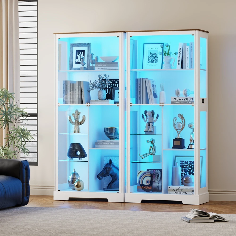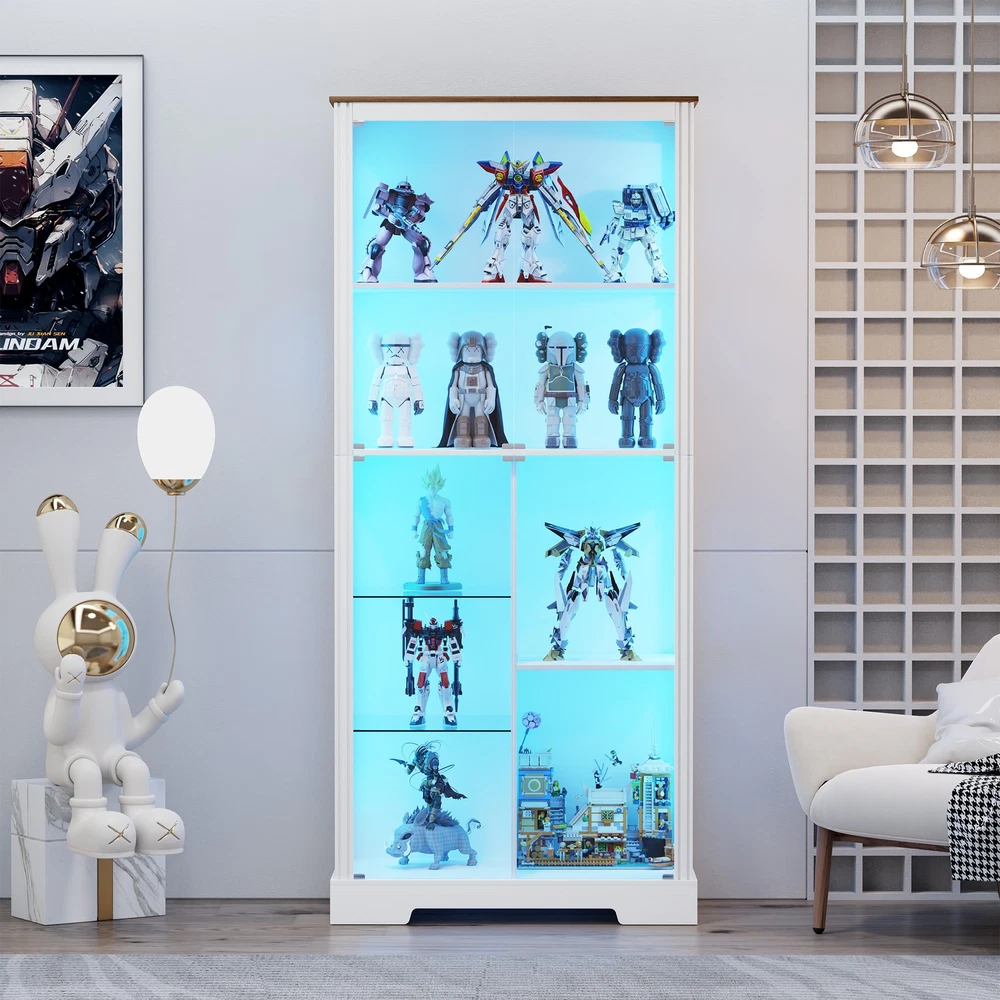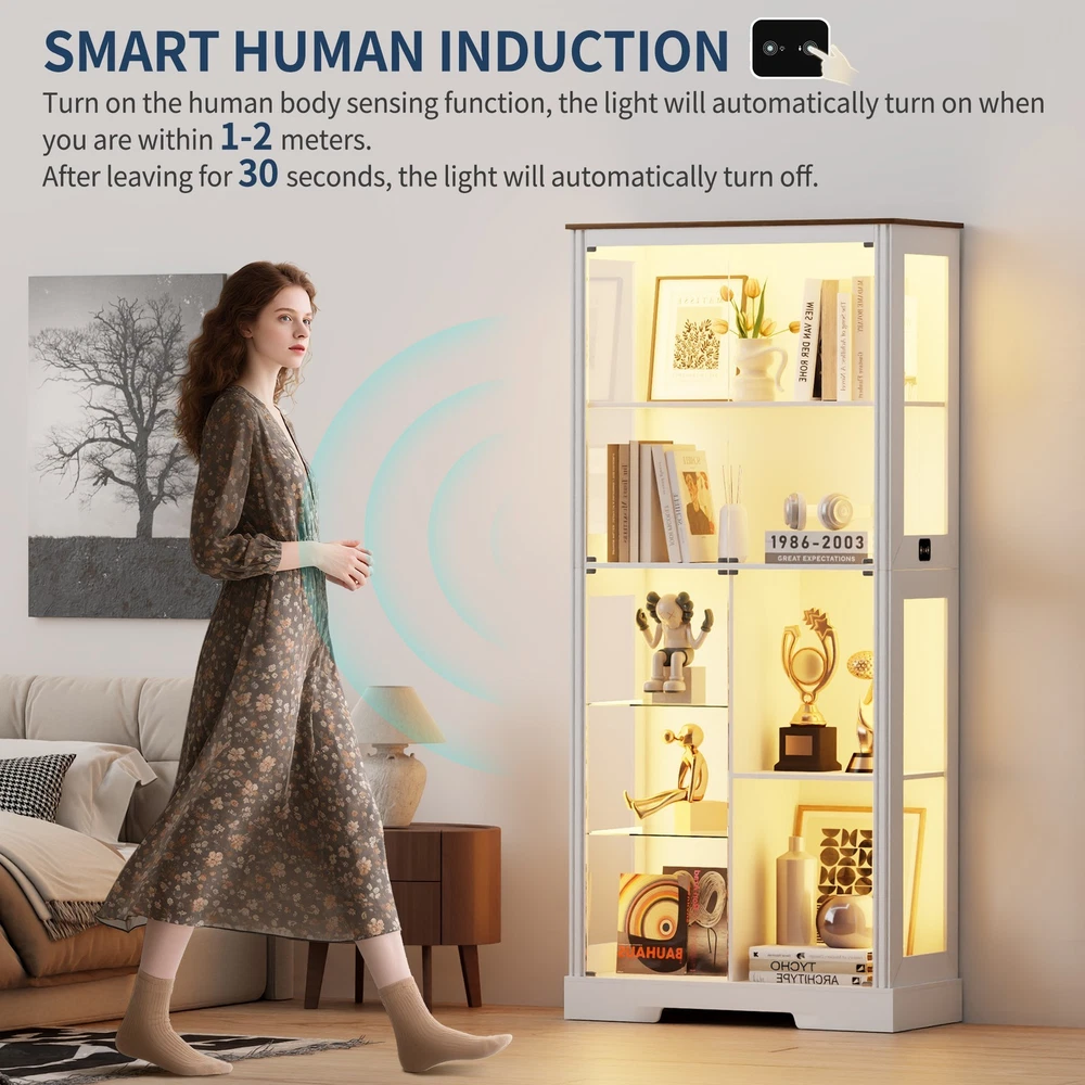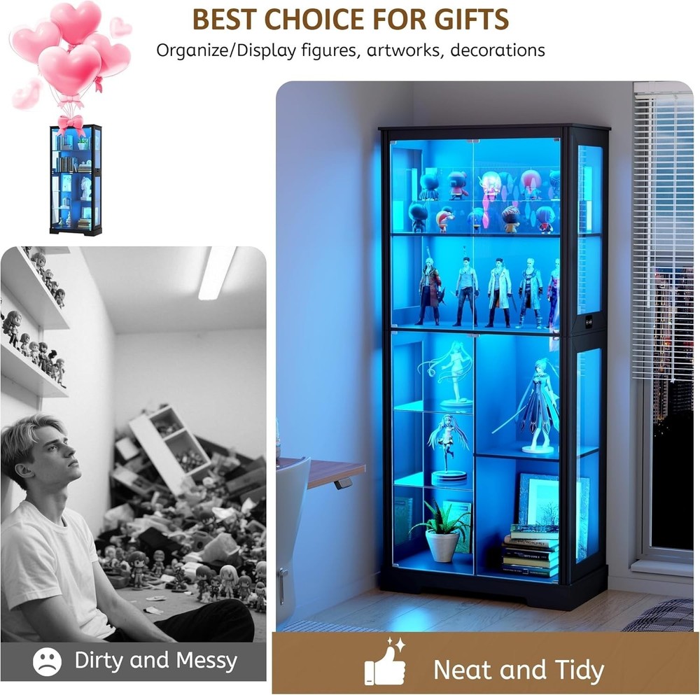 ✨【High Quality】Our display cabinets are made of high-density engineered wood and high-definition glass, which is sturdy and durable. The thickened wooden frame enhances the stability of the entire glass display cabinet and will not shake easily. It is very suitable for use as a collection cabinet for figures in the bedroom/e-sports room, an antique cabinet, a bookcase in the office/study, a wine cabinet in the restaurant, etc. ✨【Pop-up Glass Door】The pop-up glass door design of this display shelf, high-definition glass, does not deform or discolor, allowing you to enjoy the beauty of the collection at a glance, and the handleless design is more stylish and exquisite. The 2 removable glass compartments can be installed/removed at any time, so that you can adjust according to your needs. ✨【Intelligent Human Body Induction】Our storage cabinet is designed with an intelligent human body induction system. You only need to turn on the human body induction function, and the light will automatically light up when you are within 1-2 meters. After leaving for 30 seconds, the light will automatically turn off. ✨【3 Light Modes】Our curio cabinet is equipped with 3 adjustable modes (blue, yellow and white) LED light strips, which are safer than ordinary bulbs and add a modern touch to your living space. At the same time, you can touch the switch to change the color mode, or adjust the brightness by long pressing the touch. ✨【Easy Assembly】The display shelves dimensions of 31.5" W x 70.8" H x 15.7" D,The package comes with step-by-step instructions, all parts and accessories are labeled, we recommend that you follow each step in the instructions! If there are any issues with lost goods or damaged parts, just click "Contact Seller" to get a satisfactory solution. ✨【Ideal Holiday Gift】You can give this display cabinet to your husband, boyfriend, son or yourself on holidays, birthdays, anniversaries, it is an intimate and ideal gift for various occasions such as Valentine's Day, Father's Day, Christmas, birthdays or housewarming celebrations. Glass Display Curio Cabinet for Collectibles, Toys, Figures, Legos, Decorations Humanized Design - Human Body Induction Make Your Life More Intelligent Lighted Display Cabinet With Dimmable 3 Color Lights & Adjustable Brightness Extra Large Storage & Display Space 71" Tall Display Cabinet with Shelves Display Case Cabinet can hold up to 220 pounds Unbreakable & High-Definition Tempered Glass Doors Perfect for Home, Office, Playroom, Living Room, Study Room More Details about Lvifur Glass Display Cabinet Magnetic Doors Catch Ensure silent and smooth door operation Press to close and open, convenient and fast Anti-Tipping Device High security to prevent tipping Durable, safe, sturdy and stable