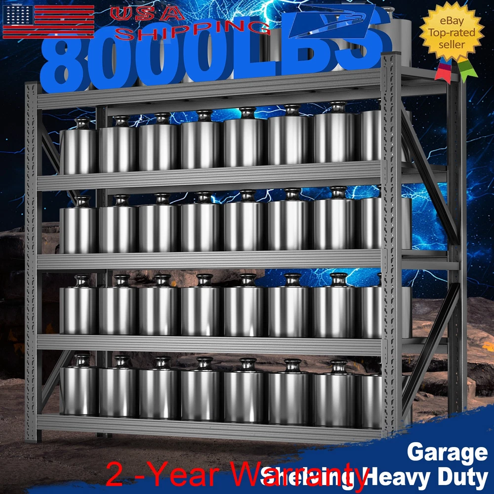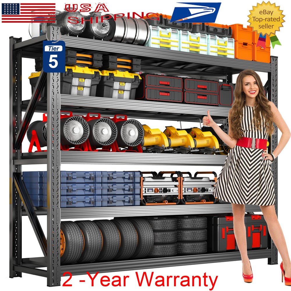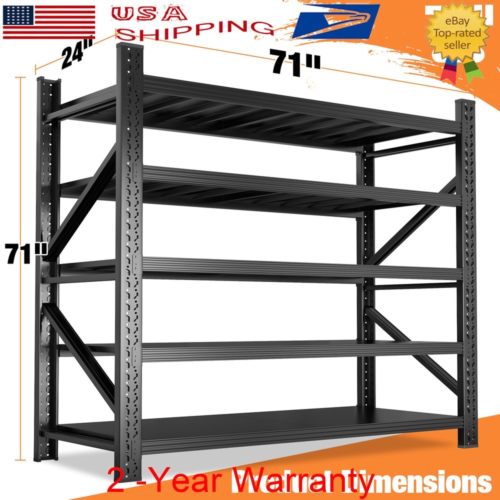 71" H Garage Shelving Heavy Duty 8000 LBS 5 Tier Storage Shelves Adjustable Product Description Say goodbye to wobbling shelves and weak joints. Our Garage Shelving features four one-piece steel columns, thick steel shelves reinforced with ribs, and extra-wide beams for superior durability and strength. It’s perfect for storing tires, generators, tools, and more. Adjustable shelf heights let you create the setup you need, while the quick, 10-minute installation makes organization effortless. About this item 【Heavy Duty Garage Shelving Load 8000LBS 】Designed to handle even the toughest storage challenges. With a total weight capacity of 8000 lbs and 1600 lbs per shelf, this shelving unit is built to withstand heavy-duty use. Featuring one-piece columns, dual Reinforcing Diagonal Supports, reinforced Steel shelves with three support ribs, and extra-wide beams, it offers unparalleled strength and durability. 【One-Piece Columns with Diagonal Supports 】No seams, no weak spots. Our four one-piece columns, reinforced with diagonal supports, are the key to a sturdier, more reliable garage shelves. The seamless design, combined with the diagonal braces, eliminates wobbling and sagging, offering enhanced stability and durability for heavy-duty storage., unlike split column garage shelf that can suffer from weak joints and instability. 【Thick Steel Shelving with Reinforcement Rib】Our shelf’s thick steel shelves, reinforced with ribs and supported by extra-wide beams, provide unmatched durability for all your storage needs. The reinforced ribs help spread the weight evenly across each shelf, while the extra-wide beams ensure maximum load-bearing capacity, preventing any bending or sagging over time. 【Adjustable Metal Shelf】Our heavy duty shelving features adjustable shelves, allowing you to create the perfect storage system for your unique needs. Adjust the height of each shelf to fit everything from large appliances to smaller tools, and enjoy a customizable storage experience. Whether it’s for home or commercial use, this shelving unit is versatile and practical. 【Garage Shevleing with Monster Storage Space】This extra-wide garage shelving is perfect for garages, warehouses, basements, and shops. It’s not just for home use – this shelving unit is also ideal for industrial and commercial applications. Perfect for storing heavy-duty items like tires, generators, and motor oil crates, it's built for mechanics, warehouse professionals, and anyone who needs reliable, heavy-duty storage. 【10-Minute Solo Assembly】We’ve simplified assembly with a comprehensive installation guide and clearly labeled parts for each step. And if you run into any issues, our professional customer service is always ready to offer guidance and support, ensuring a flawless experience. Product Sizes 1PCS --- 5 Tier - 71" W x 24" D x 71" H