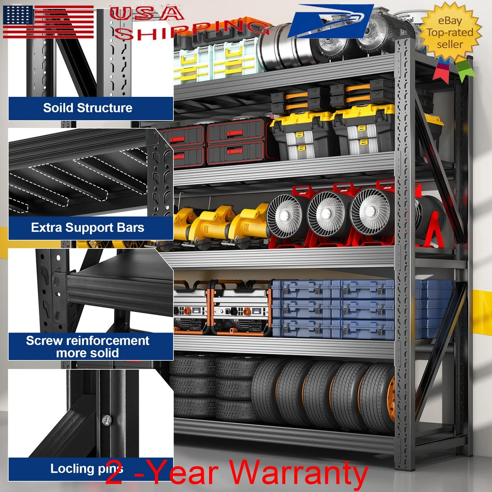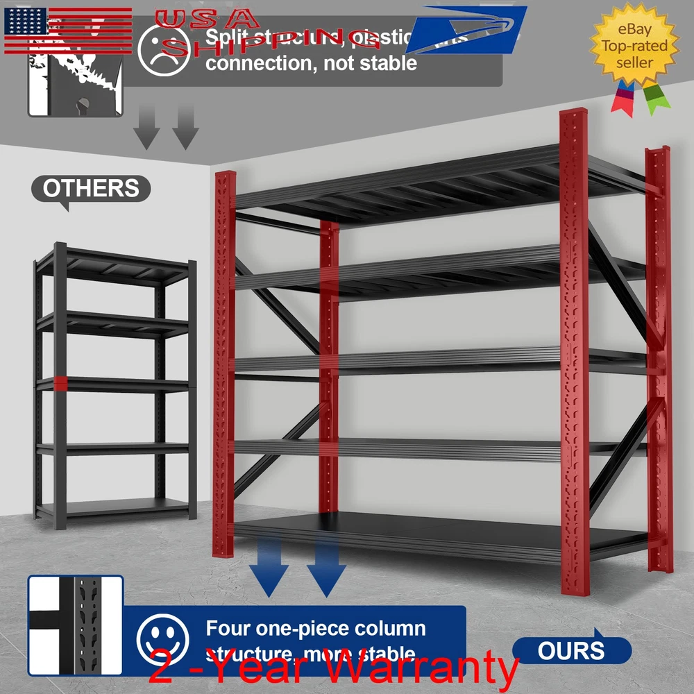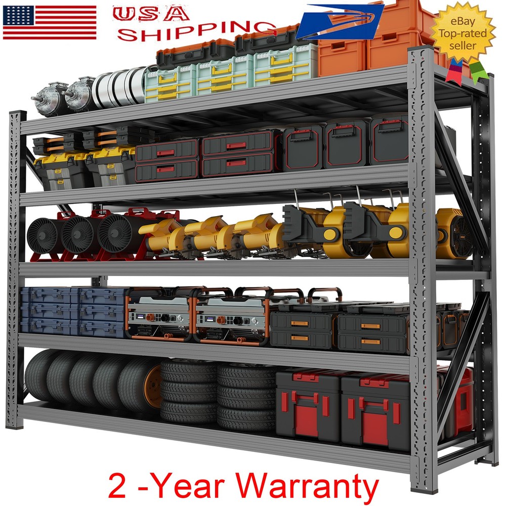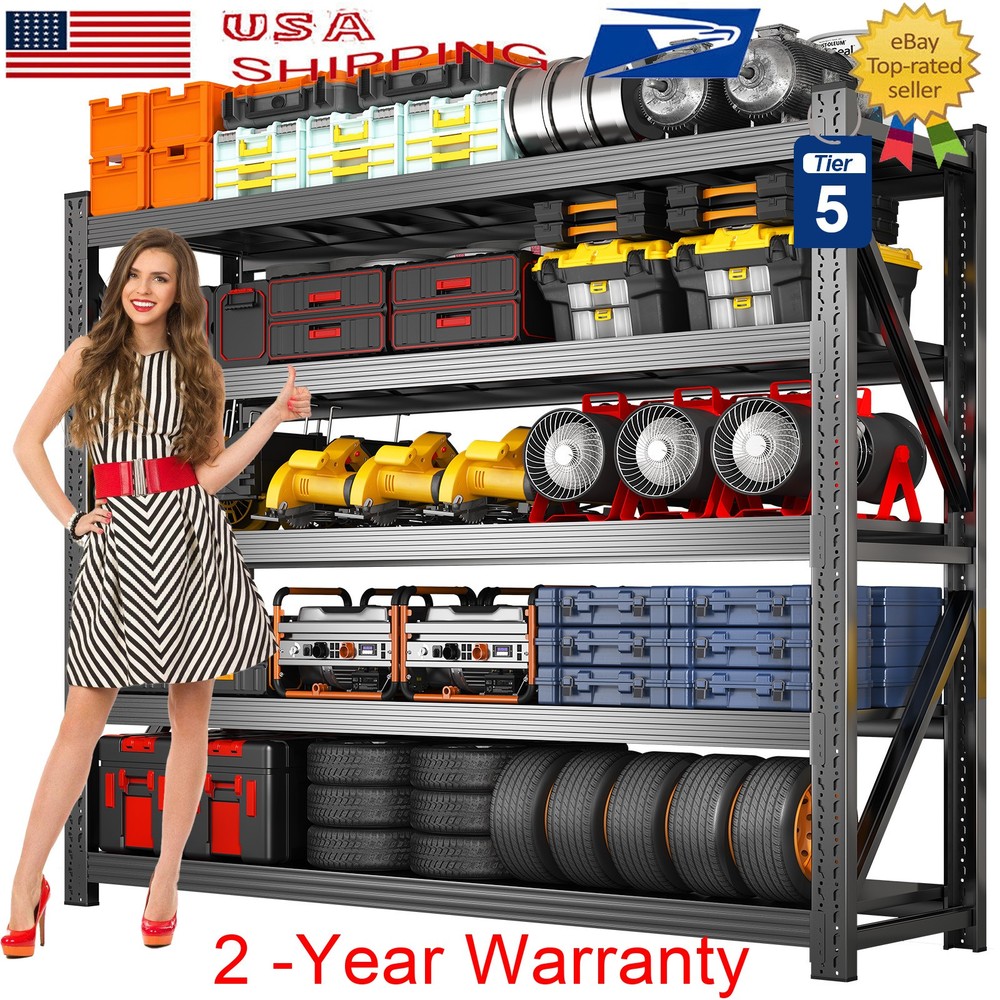 71" H Garage Shelving Heavy Duty 8000 LBS 5 Tier Storage Shelves Adjustable Product Description Say goodbye to wobbling shelves and weak joints. Our Garage Shelving features four one-piece steel columns, thick steel shelves reinforced with ribs, and extra-wide beams for superior durability and strength. It’s perfect for storing tires, generators, tools, and more. Adjustable shelf heights let you create the setup you need, while the quick, 10-minute installation makes organization effortless. About this item 【Heavy Duty Garage Shelving Load 8000LBS 】Designed to handle even the toughest storage challenges. With a total weight capacity of 8000 lbs and 1600 lbs per shelf, this shelving unit is built to withstand heavy-duty use. Featuring one-piece columns, dual Reinforcing Diagonal Supports, reinforced Steel shelves with three support ribs, and extra-wide beams, it offers unparalleled strength and durability. 【One-Piece Columns with Diagonal Supports 】No seams, no weak spots. Our four one-piece columns, reinforced with diagonal supports, are the key to a sturdier, more reliable garage shelves. The seamless design, combined with the diagonal braces, eliminates wobbling and sagging, offering enhanced stability and durability for heavy-duty storage., unlike split column garage shelf that can suffer from weak joints and instability. 【Thick Steel Shelving with Reinforcement Rib】Our shelf’s thick steel shelves, reinforced with ribs and supported by extra-wide beams, provide unmatched durability for all your storage needs. The reinforced ribs help spread the weight evenly across each shelf, while the extra-wide beams ensure maximum load-bearing capacity, preventing any bending or sagging over time. 【Adjustable Metal Shelf】Our heavy duty shelving features adjustable shelves, allowing you to create the perfect storage system for your unique needs. Adjust the height of each shelf to fit everything from large appliances to smaller tools, and enjoy a customizable storage experience. Whether it’s for home or commercial use, this shelving unit is versatile and practical. 【Garage Shevleing with Monster Storage Space】This extra-wide garage shelving is perfect for garages, warehouses, basements, and shops. It’s not just for home use – this shelving unit is also ideal for industrial and commercial applications. Perfect for storing heavy-duty items like tires, generators, and motor oil crates, it's built for mechanics, warehouse professionals, and anyone who needs reliable, heavy-duty storage. 【10-Minute Solo Assembly】We’ve simplified assembly with a comprehensive installation guide and clearly labeled parts for each step. And if you run into any issues, our professional customer service is always ready to offer guidance and support, ensuring a flawless experience. Product Sizes 1PCS --- 5 Tier - 71" W x 24" D x 71" H