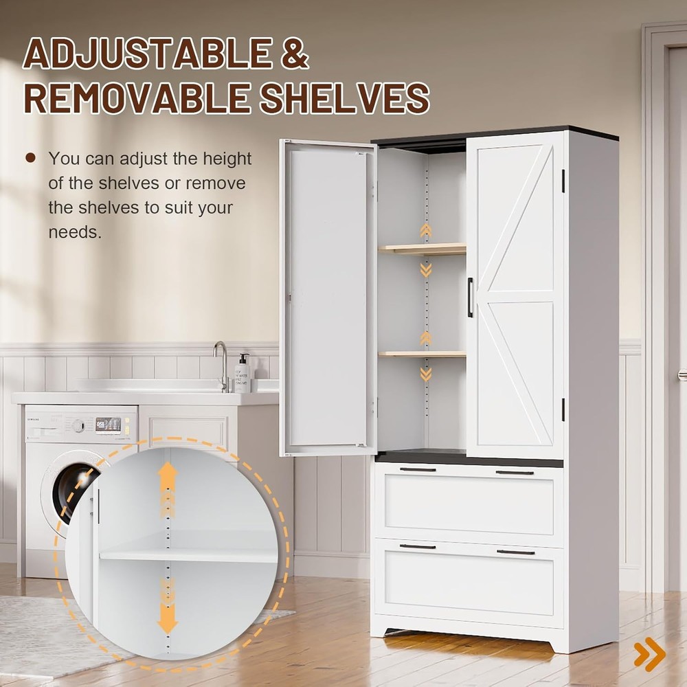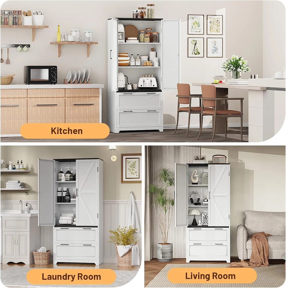 Product Description About this item • STABLE AND DURABLE: Pantry cabinet is made of cold rolled steel to create unmatched durability, and the heavy-duty steel construction has a total weight capacity of up to 780 lbs. The kitchen cabinet is powder coated for a smooth, easy-to-clean surface for daily use and maintenance. Ideal for kitchen pantry, living room. • MAXIMISE SPACE:Tall kitchen pantry cabinet offers 5 levels of storage space including 2 adjustable shelves and 2 deep drawers. The height of the adjustable shelves can be adjusted to suit your storage needs, ensuring you have enough storage space for food, essentials, small appliances etc.. The white cabinet with doors can be used as a kitchen storage cabinet for tinned food or a craft cabinet in the living room. • SAFE AND BEAUTIFUL: The white pantry storage cabinet is equipped with an anti-tipping device and levelling feet to ensure the stability of the cabinet on uneven floors, enhancing your safety during use.Featuring a barn door style design, the farmhouse storage cabinet is a sleek and simple combination of white and black, blending farmhouse charm with modern functionality. Can be used to organize food, kitchen items or crafts - turn clutter into style! • HUMANISED DESIGN: Tall pantry cabinet hinged for easy and smooth door opening. Drawer slides are smooth and fluid, easy to pull. Magnetic door design helps you open and close the door easily.Humanised detail design enhances your applicable comfort and is an excellent choice for home storage. • EASY ASSEMBLY: Tall storage cabinets with doors and shelves comes with pre-labelled parts + step-by-step video guide + detailed instructions. Ensure you complete the assembly easily and quickly. Buy this freestanding food pantry cabinet to safely store your valuables in your kitchen, living room or home office.(Not designed for clothing storage) Crafted from premium cold-rolled steel, the Eltean 71"Tall Storage Cabinet combines practicality with modern farmhouse aesthetics. Whether it's for your kitchen, living room or laundry room , its versatile design will meet your storage needs while enhancing the tone of your home. Measuring 71"H*31.5"W*15.8"D and with a weight capacity of 180 pounds per shelf, this kitchen cabinets makes it easy to store a variety of items. Assembly of this freestanding pantry cabinet is a breeze with pre-labelled parts, step-by-step video guides and assembly instructions. Kitchen storage cabinet say goodbye to clutter with 2 adjustable shelves, 2 deep drawers and top space. Use it as a food storage cabinet for tinned food, a craft cabinet for DIY materials or a laundry organiser for detergents - the possibilities are endless. Maximise your vertical storage space with the adjustable height of the pantry cabinets shelves. Whether you're storing everyday items from your kitchen pantry, bulky appliances, easily adjust the interior to accommodate tall bottles and jars, stand mixers. Farmhouse pantry cabinet is equipped with adjustable feet to keep it stable even on uneven floors; metal handles with magnetic door design ensure easy opening and closing of doors; drawer slides are smooth and easy to pull; ensuring your comfort. White storage cabinet with doors is made of cold rolled steel material and powder coating technology, scratch-resistant and easy to clean; reinforced steel frame prevents deformation and sagging, sturdy structure, and equipped with anti-tipping wall anchors to protect the safety of your family. Kitchen pantry storage cabinet: easily organise spices, small appliances and bulk foods; Living room storage: display books, decorative items or audio-visual equipment; Laundry room : detergents, ironing boards and cleaning products.