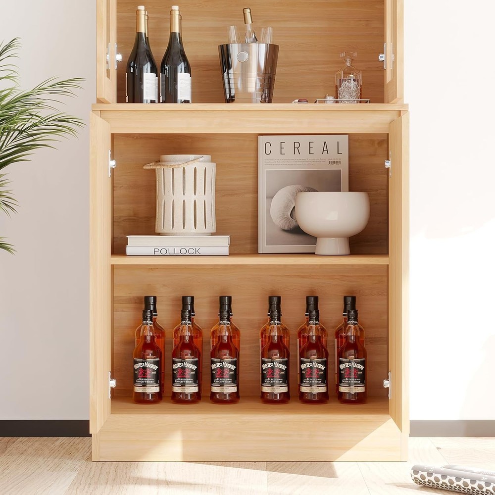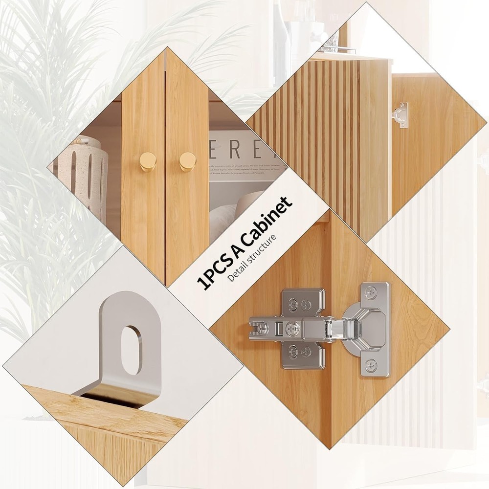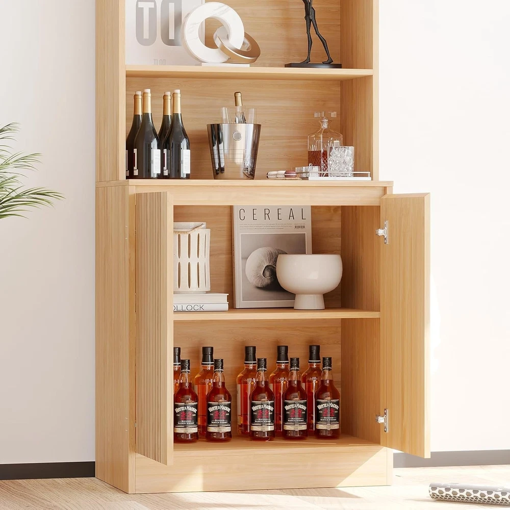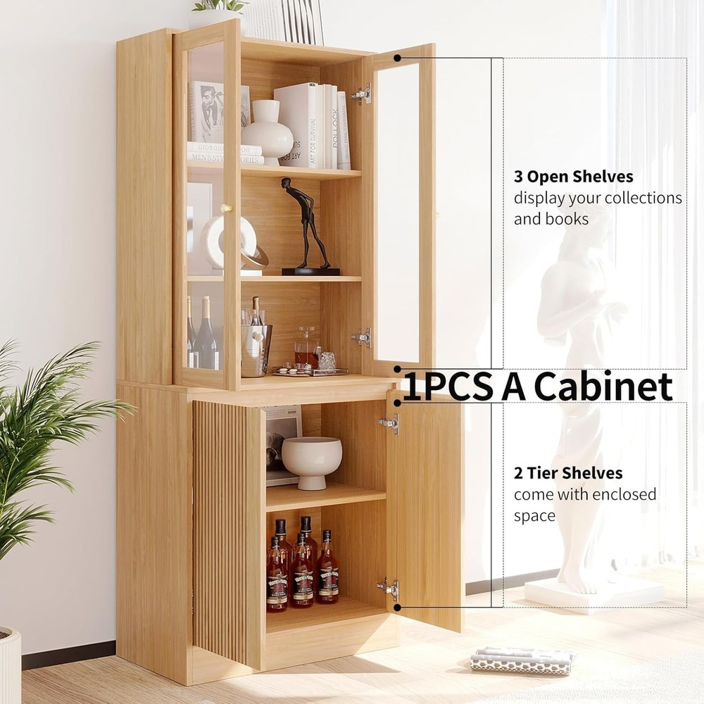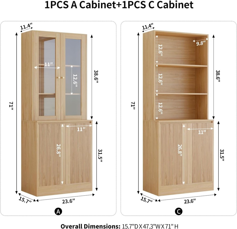 71'' Freestanding Wood Bookcase With 2 Tempered Glass Doors, Modern Tall Storage Cabinet for Kitchen, Living Room, Home Office (A+C) Product Description About this item 【SIMPLE DESIGN】The natural wood texture and vertical stripe decoration enhance the visual effect of the furniture, whether it is the living room, bedroom, dining room or study, it can be perfectly integrated into your home environment and enhance the practicality and aesthetics of the space. 【QUALITY MATERIAL】This bookcase is made of high quality MDF, ensuring its durability and reliability. The surface is smooth and easy to clean and maintain, just wipe it gently with a damp cloth to remove stains and keep the bookcase neat and beautiful. The top of the bookcase has an anti-tipping device, which can effectively enhance the stability of the bookcase and prevent it from accidentally tipping over during use. 【TEMPERED GLASS DOORS & SHELVES】Multi-tier design keeps clutter in its place, this bookcase has 3 shelves behind the upper cabinet door and 2 shelves behind the lower cabinet door. Toughened glass doors protect your belongings from dust and dirt, and documents and office items are easy to see, easy to access, and multiply your work efficiency. 【MULTIFUNCTIONAL BOOKCASE】The wood grain design is clear and natural, and the vertical stripe design gives the cabinet a unique texture, making it an ideal addition to all types of living spaces and storage areas. Whether it's for storing clothes, display items or other daily necessities, it can find its place as a storage cabinet in a study, home office, bedroom or living room or kitchen. 【ASSEMBLY NOTE】Please review the list of hardware/screws/planks in the instructions before assembling. Please follow the instructions step by step to assemble carefully, each part is labeled to prevent damage caused by violent installation. Cabinets Can Organize All Clutter in a Well Organized Way With its clean lines and modern design, this bookcase fits a variety of decorating styles. Place it in your living room, bedroom, bathroom, kitchen, or anywhere you want. If you're looking for a piece of cabinet with ample storage without sacrificing style or comfort, this is for you! Have fun with DIY! Bookcase with Tempered Glass Doors & Selves for Storage Flexible and versatile combinations help you make the most of every inch of space, creating an organized and efficient environment. - Three spacious shelves easily accommodate books, magazines, decorations, daily necessities, kitchenware, and other items. - Tempered glass door protects against dust and provides visibility, easy to see and convenient to access. Flexible & Versatile Combinations You can choose 4 different combinations according to your style or place them separately in other spaces where you need storage. Textured Wood Finish Vertical stripes have a certain visual extension effect, making the product visually more slender and upright, enhancing the product's sense of space. Soft-Close Hinges Made of stainless steel with nickel-plated surface for durability, close gently and quietly, avoiding noise and damage to the door frame. Fixed Storage Shelf Help you neatly place various daily items. Its unique design maximizes the use of storage space while keeping the overall cleanliness and aesthetics. Anti-tipping Device Ensures safety and stability during use by securing the cabinet to the wall. Flexible & Versatile Combination Solutions Bookcase for Elegant & Modern Style Discover Your Perfect Fit with Cabinets! You can choose 4 different combinations according to your style or place them separately in other spaces where you need storage. 1 2 3 4