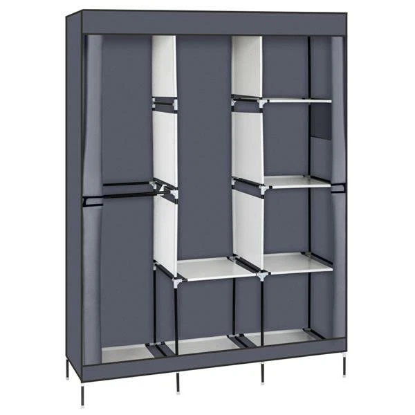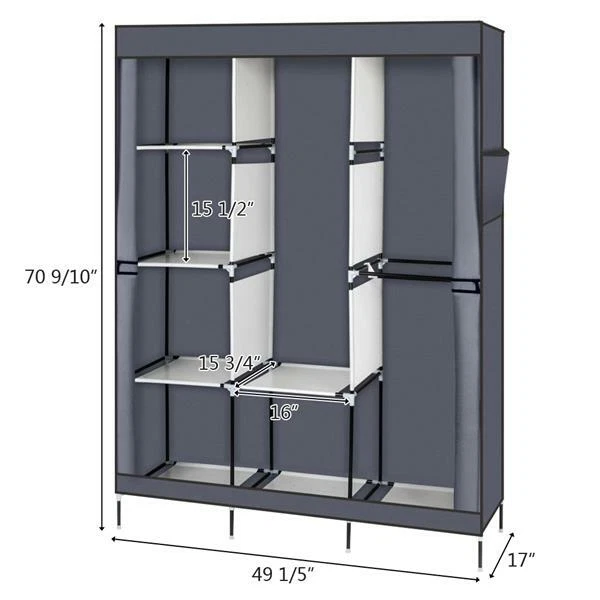Introductions: Our 71" Portable Closet Storage Organizer Clothes Wardrobe is Made from Selected Non-Woven Fabric Cover, High Quality Steel Tube and PP Plastic Connectors, Which Will Durable and Meet Your Long Term Storage Needs. The Size for The Clothes Wardrobe Makes it Suitable for Organizing Your Small Rooms and Walk-In Closet. Movable Improved Clothes Hanging Rod and 8 Storage Shelves Offers You Enough Space Both for Your Longer Outfits and Folded Clothes. Zippered Dustproof Cover Offered to Keep Your Item Away from Dust and Water-Proof Fabric Tiers are Easy to Clean. It Will Be Great Convenient and Functional. Do Not Hesitate to Buy One! Features: 1. STURDY & DURABLE CONSTRUCTION: Made from Selected Non-woven Fabric Cover, Water-Proof Fabric Tiers, High Quality Steel Tube and PP Plastic Connectors, This Portable Storage Closet Will Meet Your Long Term Storage Needs. 2. SPACE SAVING ORGANIZER:Great Size of 49.2”W x 17” D x 70.9”H, Which Makes it Suitable for Organizing Your Small Rooms and Walk-in Closet. 3. SPACIOUS STORAGE CLOSET: Movable Clothes Hanging Rod and 8 Storage Shelves Offers You Enough Space both for Your Longer Outfits and Folded Clothes. 4. DUSTPROOF COVER & WATER-PROOF TIER: Zippered Dustproof Cover Offered to Keep Your Item away from Dust and Water-proof Fabric Tiers are Easy to Clean. 5. CONVENIENT TO USE & ASSEMBLE: This Amazing Closet Makes Your Clothes or Daily Accessories Easy to Access; Installation is just Easy, no Tool Required. Note: 1.When receiving the goods, please confirm the product according to the listing of instructions. Once you find Less pieces, please provide relevant pictures to contact us. We will deal it in the time. 2.Please install goods with the instruction manual. 3.It is recommended that the installation should not be too tight to adjust easily. After the structure is installed, firm the interface for more stability. Specifications: 1. Item Name: 71" Portable Clothes Closet Home Wardrobe Clothes Storage Organizer with Shelves 2. Material of the Home wardrobe: Non-Woven Fabric Cover, Steel Tube And Plastic Connection 3. Dimension of Home Wardrobe: (49.2 x 17 x 70.90)" / (125 x 43.18 x 180)cm (W x D x H) 4. Color of Home Wardrobe: Gray Package Includes: 1 x Portable Closet 1 x Instruction Notes: 1. Please make sure all poles reach the bottoms of plastic connector holes. 2. Please be careful during assembly and dis-assembly.