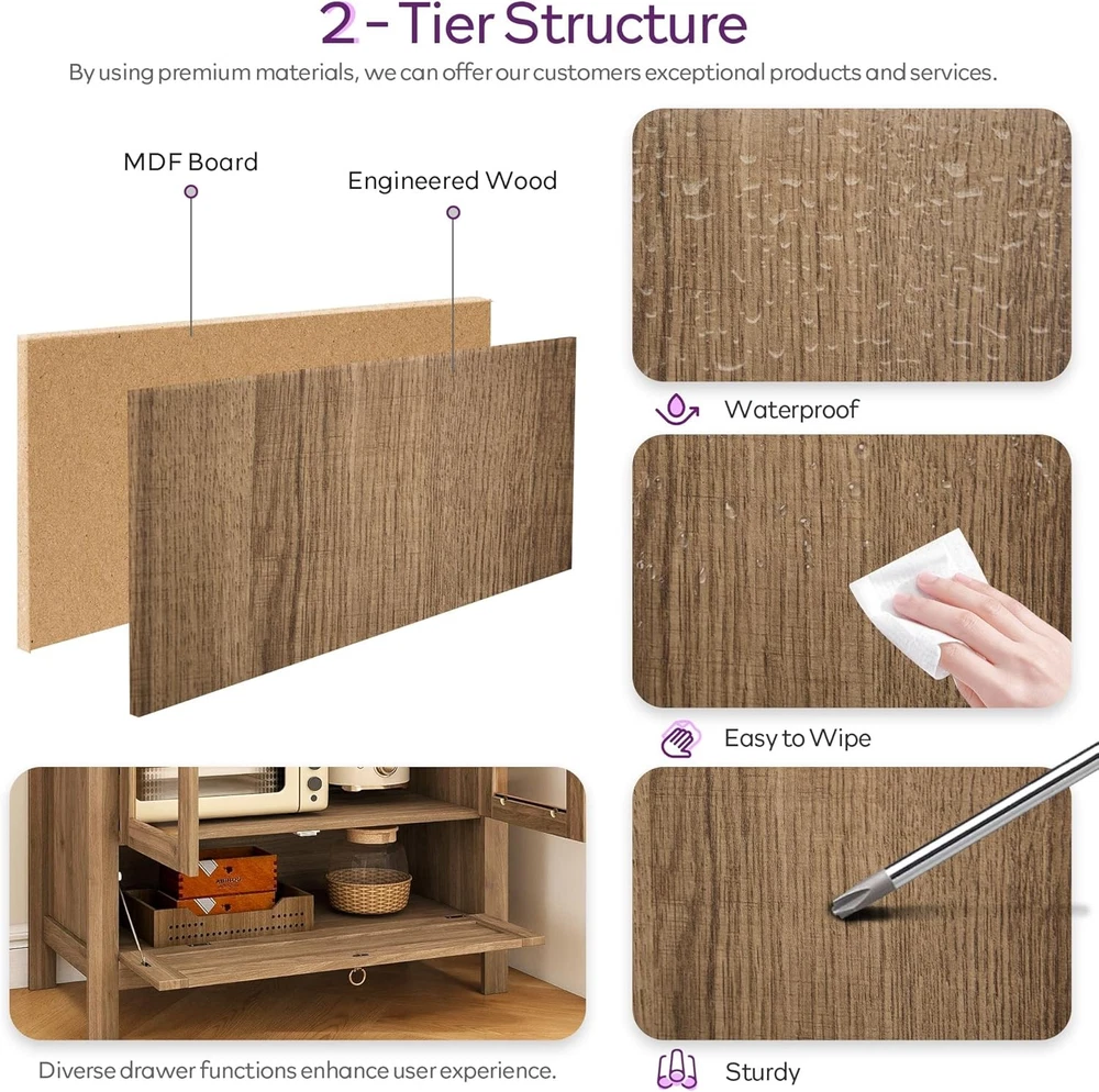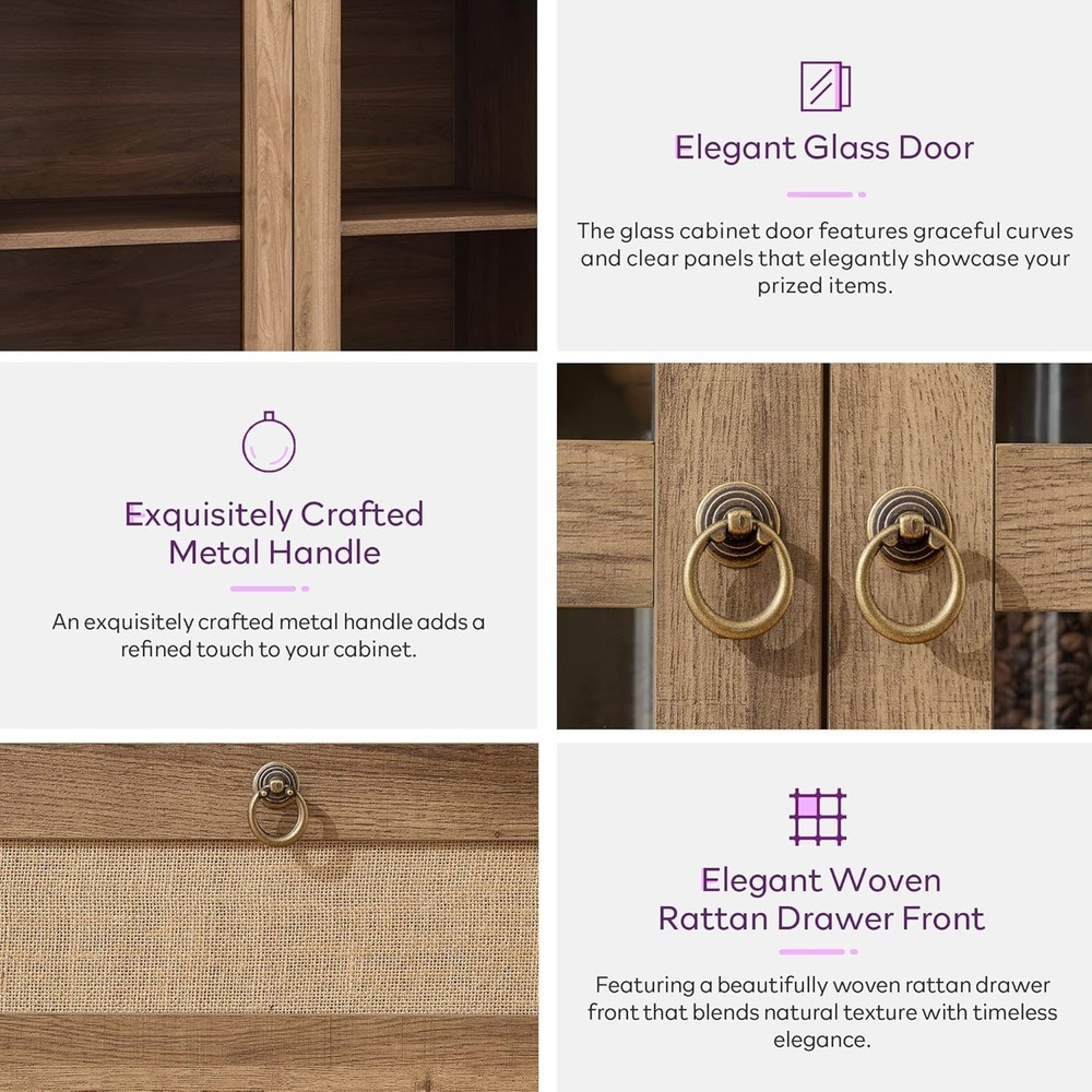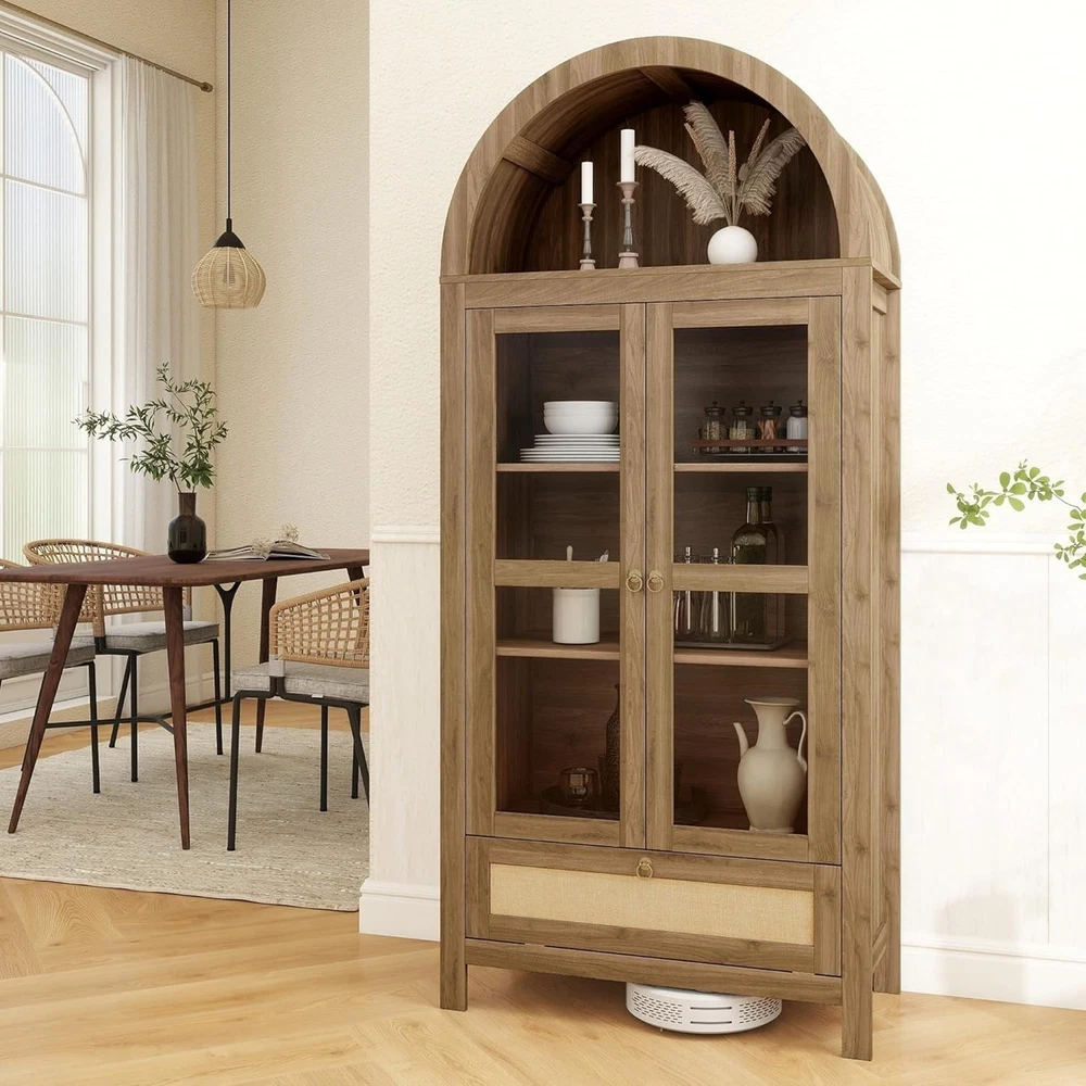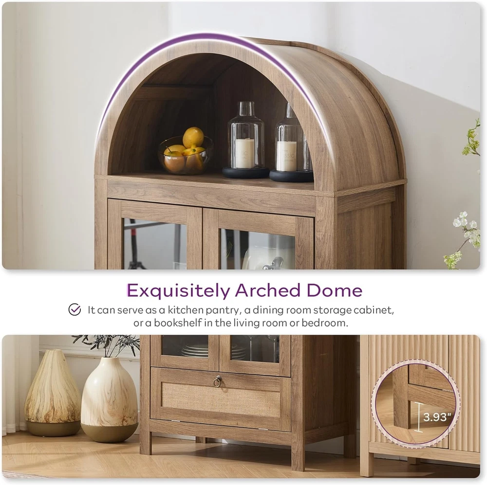 Product Description About this item Perfect Fit for Your Space: Measuring 70.86" H x 30" L x 15.52" W, this pantry cabinet is designed to fit seamlessly into your kitchen, dining room, or bathroom. Kitchen cabinet's elegant arched top adds a modern farmhouse charm while providing additional vertical storage space, the textured natrual finish complements any decor style. Whether you need extra storage or a stylish statement piece, this pantry storage cabinet delivers both. Safety First with Anti-Tipping Device: Equipped with a reliable anti-tipping device, this pantry storage cabinet ensures stability and safety, preventing accidental tipping and providing peace of mind in households with children or pets. Innovative Linen-Weave Open Drawer: The bottom open drawer of kitchen cabinet boasts a linen-weave finish, offering a stylish and practical solution for storing frequently used items. This feature adds a touch of elegance to the cupboard while keeping essentials within easy reach. Transparent Glass Door with Distressed Metal Handle: The clear glass door allows for easy viewing of stored items, complemented by a distressed metal handle that enhances the modern farmhouse aesthetic of this kitchen pantry cabinet. Durable Construction with High Load Capacity: Crafted with a dual-layer structure of Medium Density Fiberboard (MDF) and engineered wood, this pantry storage cabinet offers enhanced strength and durability. Each of the three shelves is designed to support up to 50 lbs, providing sturdy and reliable storage for your kitchen essentials. Thick foam and wooden protection boards provide maximum protection for all accessories and prevent damage during transportation. With labeled accessories and detailed instructions, a practical cupboard can be completed by two people in only about 1 hour. Previous page Next page