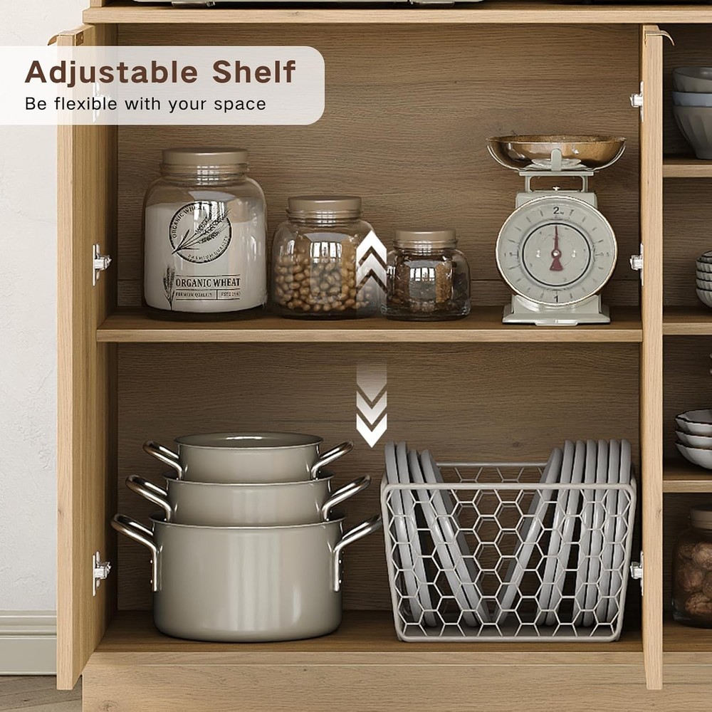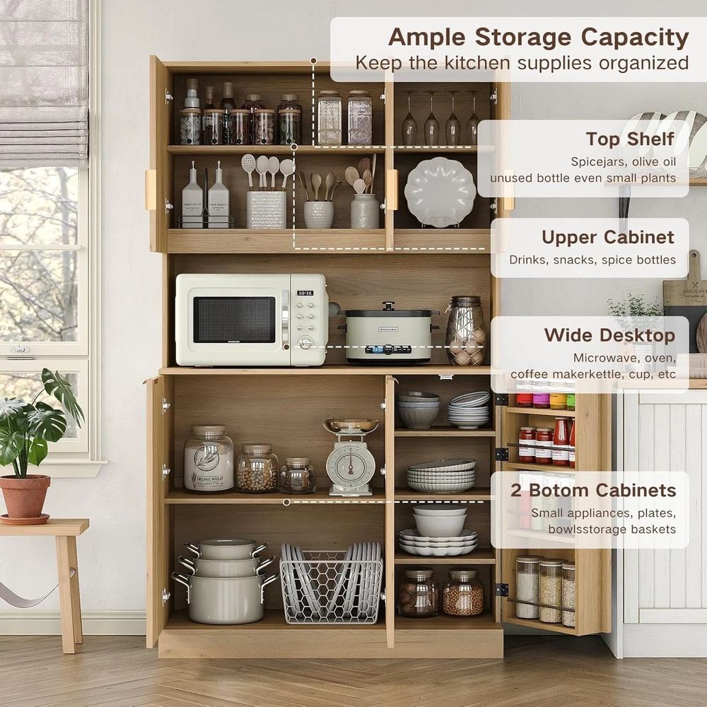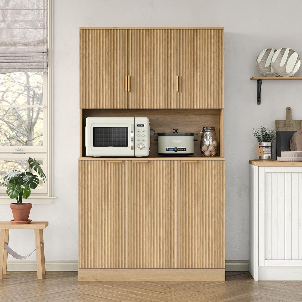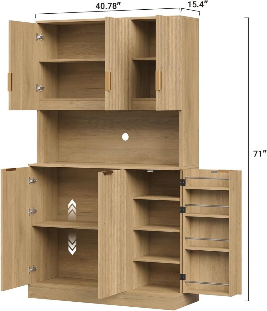 Product Description About this item • Spacious & Smart Storage Solution: Maximize your kitchen organization with this extra-large pantry featuring 10 shelves (1 adjustable) and 4 door-mounted racks—perfect for storing dry goods, cookware, and small appliances. The enclosed storage keeps items dust-free, while the sturdy top platform accommodates heavy appliances like microwaves and coffee makers with ease • Durable and Reliable Construction: Crafted from premium P2-grade medium density board, this kitchen pantry cabinet is built to last. Each door is equipped with dual hinges for smooth, wobble-free operation, while integrated magnetic locks ensure effortless opening and closing. For added safety, we've included anti-tip hardware to securely anchor the cabinet to your wall, preventing any accidental tipping • Elegant & Unique Style: The fluted panel design add a touch of sophistication, elevating your kitchen’s aesthetic. Its versatile modern style blends seamlessly into any space • Pefect for Any Space: With its compact dimensions of 40.78"W x 71"H x 15.4"D, this multifunctional storage cabinet seamlessly adapts to various spaces throughout your home. Its sleek, minimalist design effortlessly complements kitchens, dining rooms, living areas, and home offices. Use it as a kitchen organizer, coffee bar cabinet , buffet cabinet, or beverage bar - the possibilities are endless • Easy to Assemble: Designed for hassle-free setup, this tall kitchen hutch comes with clear instructions and all necessary hardware. You’ll have it ready in no time, so you can start organizing right away. If you have any questions during the setup or product, our dedicated customer service team is here to assist you