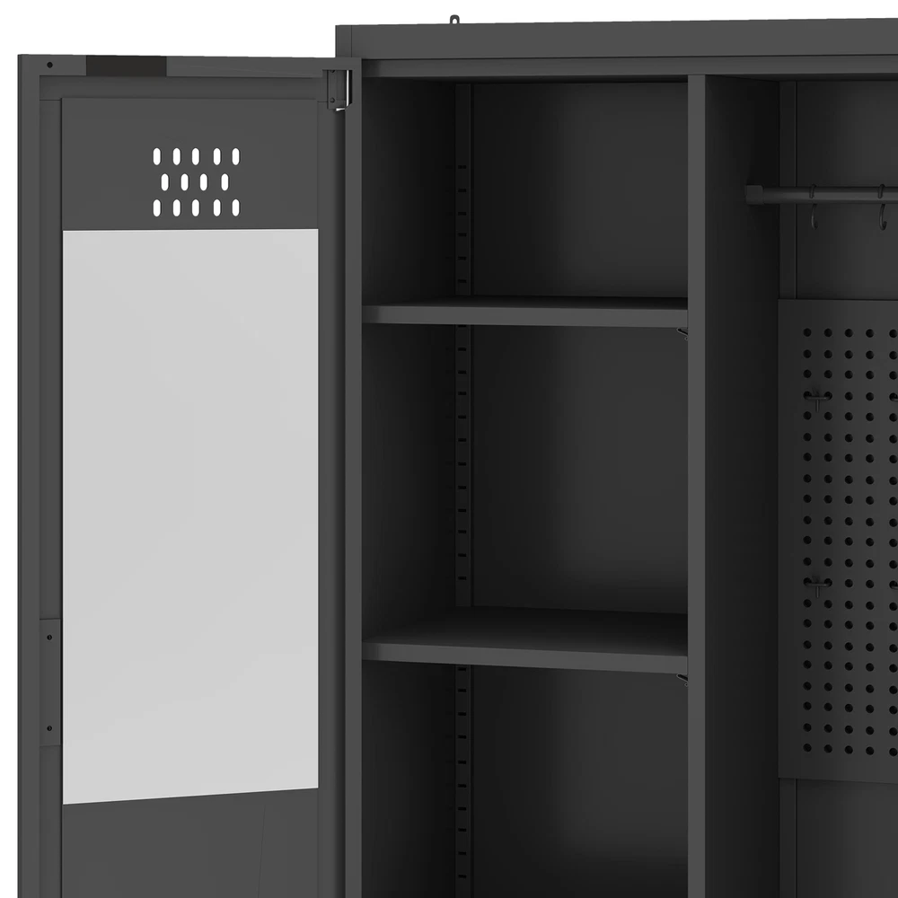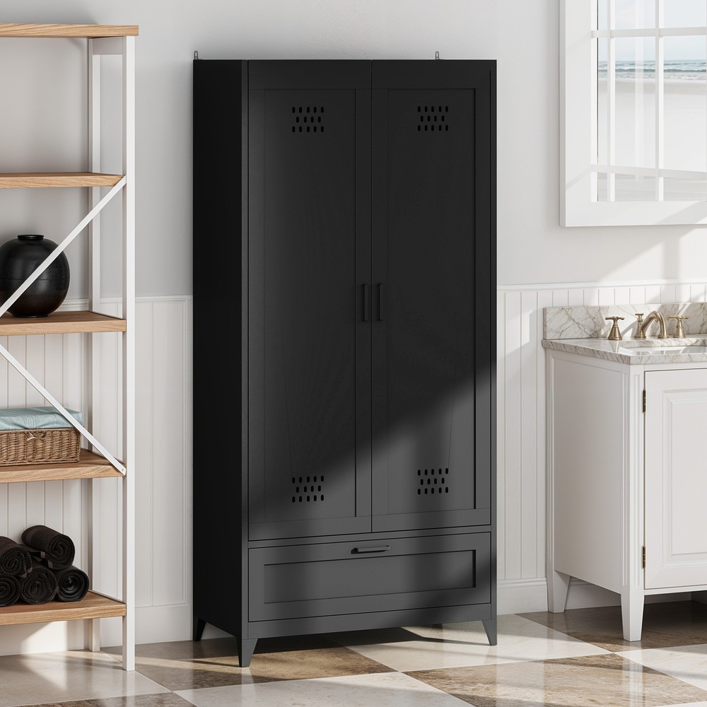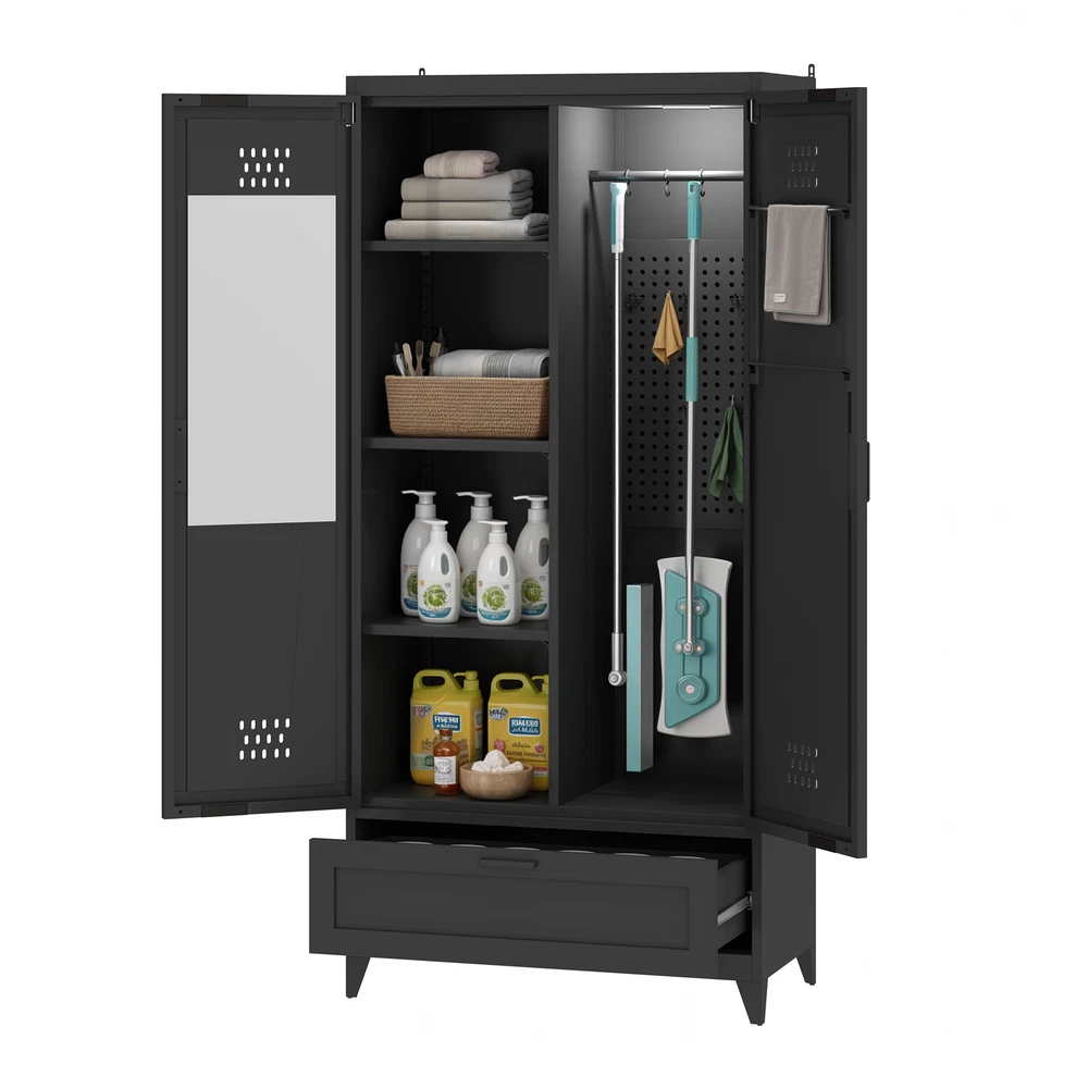 71" Tall Metal Broom Home Cleaning Tools Cabinet Vacuum Cleaner Storage Black Product Description NOTE: Professional Installation would be Highly Recommended. Description: 1. Color: Black 2. Material: Metal 3. Room Type: Basement, Garage, Bathroom, Warehouse 4. Special Features: With Adjustable Light, Adjustable Shelf, With Drawer, With Coat Rack, With Air Vents Features: 1. All-in-One Metal Storage Cabinet – Keep everything neatly organized with adjustable shelves for various-sized items and a pegboard with hooks for hats, belts, and more. A spacious drawer stores smaller essentials, while two towel rods on the right door keep linens tidy. 2. Customizable Sensor Lighting – Easily find what you need with smart sensor lighting! Adjust brightness and switch between warm, white, or dual-color light using the remote. Plus, the timer-off function helps save energy when not in use. 3. Mirror-Integrated Storage – Get ready with ease using the built-in mirror—no need to move back and forth! This storage cabinet offers convenience, while the magnetic door closure ensures smooth, quiet operation and reduces wear over time. 4. Robust Steel Construction – Crafted from durable steel, this storage cabinet is stronger than wood or plastic alternatives. For added safety, it includes a tip-resistant kit, while adjustable feet provide extra stability—perfect for busy households with pets. Dimensions: 1. Product Dimensions: 15.7"D x 31.5"W x 70.9"H 2. Weight: 73 lbs Package Included: 1. 1x Storage Cabinet 2. 1x Assembling Hardware Kits 3. 1x Instruction Manual Book Shipping 1. Normally the item will be dipatched within 1 business day if payment is cleared before 12pm PST. 2. Please verify the correct shipping address in your PayPal account before making the payment. We only dispatch the item to the address that is sent to us at the time of checkout. 3. We don't ship to Hawaii, Alaska, Puerto Rico, APO/FPO/PO Boxes. 4. We don't provide local pick-up service. 5. Normally we will use USPS, UPS, FedEx & LTL to dispatch items. Payment 1. We accept PayPal and credit card. 2. We will ship to the confirmed Paypal shipping address that is provided with the payment only. Return 1. 30 days Money Back Guarantee. 2. Please contact our customer service to receive a RMA form first if want to return the item. 3. All returned items MUST in new condition with the original package. Contact If has any problem, please contact us by sending an ebay message. Our customer service will resolve the problem as soon as possible. On Feb 24, 2025 at 23:50:34 PST, seller added the following information: