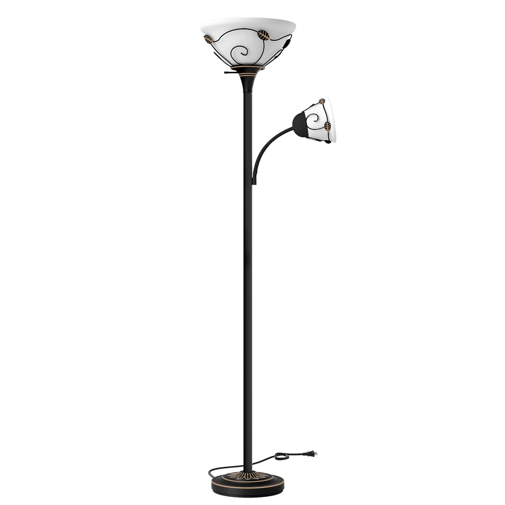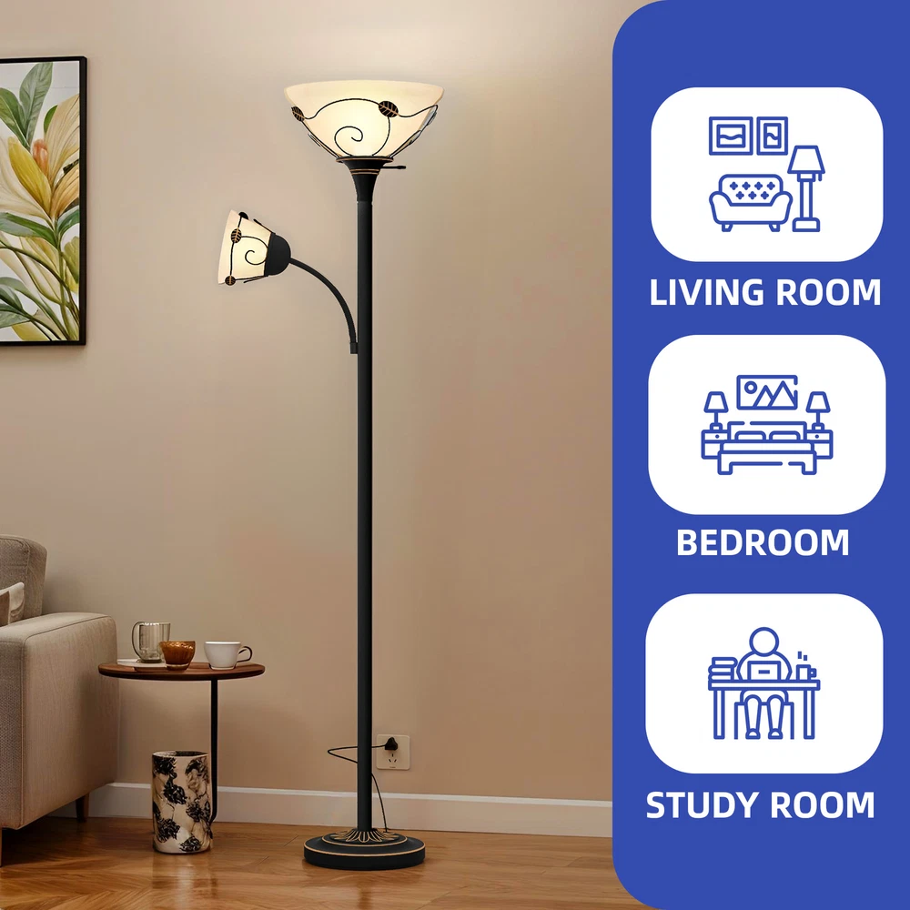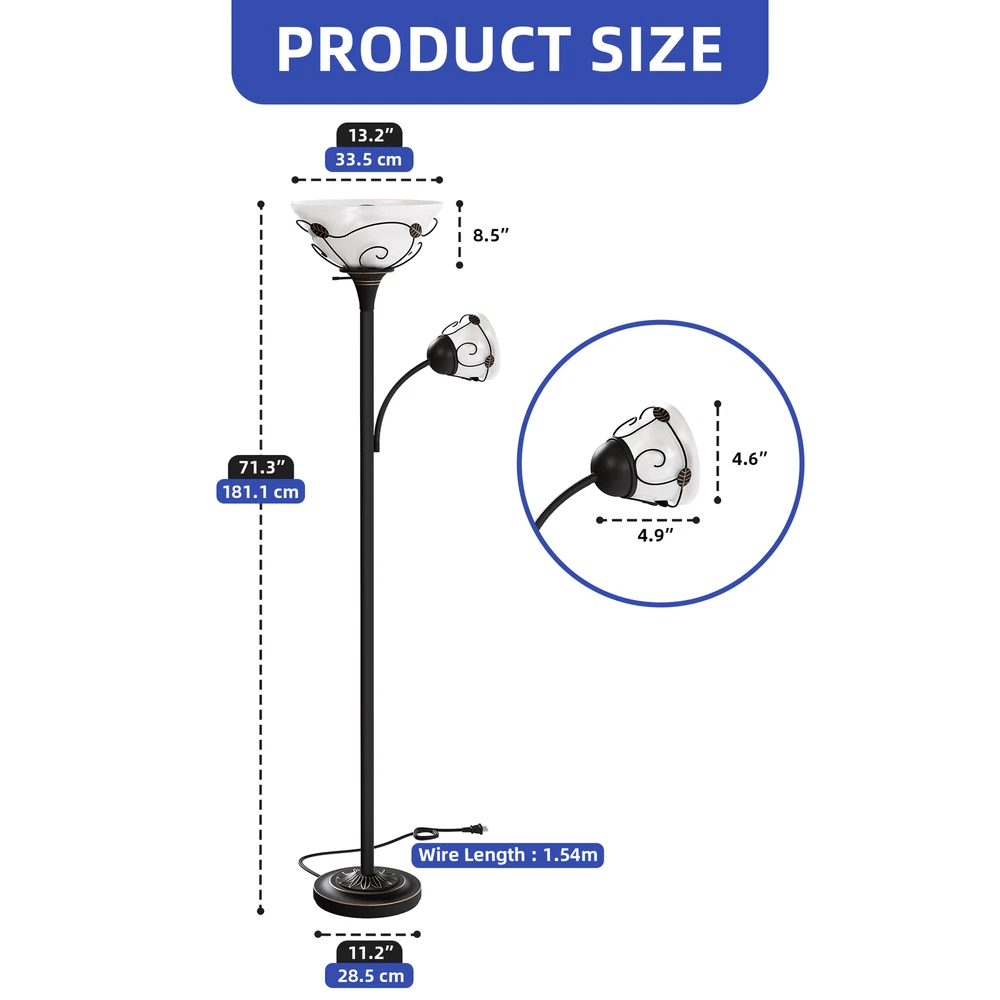 71" Vintage Torchiere Floor Lamp Adjustable Metal Stand Lamp with Reading Light Product Description NOTE: Professional Installation Would Be Highly Recommended. Description : 1. Color: Black 2. Materials: Iron & Glass 3. Room Type: Bedroom, Living Room, Family Room, Den, Home Office/Study, Entertainment Area 4. Features: Frosted Glass Shades, Retro Style, Sturdy Weighted Base, Durable And Elegant, Adjustable-Intensity Side Light, Soft Lighting, 180° Rotation Lamp, Bulb & Switch Not Included, Corrosion-Resistant & Sturdy Metal, Suitable for Various Settings, Compatible with All E26 & E12 Bulbs, Max Wattage: 150W & 40W, Easy to Assemble, Easy to Clean. Features: 1. Elegant Traditional Lighting: Merging frosted glass shades with a timeless design, this floor lamp enhances any space. Its sturdy, weighted base ensures stability and durability, suitable for any residential area. 2. Customizable Lighting Flexibility: Equipped with side lights that rotate 180 degrees , this lamp provides personalized lighting options ideal for creating a cozy environment. Its easy assembly allows for quick and effortless setup. 3. Versatile Decorative Lamp: Designed to integrate seamlessly into various settings such as living rooms, bedrooms, or offices , this lamp boasts a chic design and versatile functionality, essential for any home decor. 4. Robust Lighting Solution: Constructed with corrosion-resistant metal , this lamp is ideal for both humid and dry settings, including kitchens and bathrooms. It accommodates up to 150W with an E26 base and 40W with an E12 base , offering ample and adaptable lighting solutions for any situation. Dimensions: 1. Overall Dimension: 11.2"W x 71.3"H 2. Lamp Shade Dimension: 4.6"Ø x 4.9"H 3. Wire Length: 1.54 m Package Included: 1. 1 x Floor Lamp 2. 2 x Lamp Shades 3. 1 x Instruction Manual Note: 1. During assembly, do not tighten screws until all holes are aligned. 2. Confirm the appropriate furniture size for your needs prior to purchase. 3. There may be a slight color discrepancy between the product as seen on your monitor versus in real life. 4. Do not expose the product to extreme sunlight. To extend product lifetime, cover when not in use. 5. Contact us immediately if any components are missing or damaged upon arrival. Our customer service team will resolve your issue right away . Shipping 1. Normally the item will be dispatched within 1 business day if payment is cleared before 12 pm PST. 2. Please verify the correct shipping address in your PayPal account before making the payment. We only dispatch the item to the address that is sent to us at the time of checkout. 3. We don't ship to Hawaii, Alaska, Puerto Rico, APO/FPO/PO Boxes. 4. We don't provide local pick-up service. 5. Normally we will use USPS, UPS, FedEx & LTL to dispatch items. Payment 1. We accept PayPal and credit card. 2. We will ship to the confirmed Paypal shipping address that is provided with the payment only. Return 1. 30 days Money Back Guarantee. 2. Please contact our customer service to receive a RMA form first if want to return the item. 3. All returned items MUST in new condition with the original package. Contact If has any problem, please contact us by sending an ebay message. Our customer service will resolve the problem as soon as possible. On Feb 10, 2025 at 06:37:48 PST, seller added the following information: