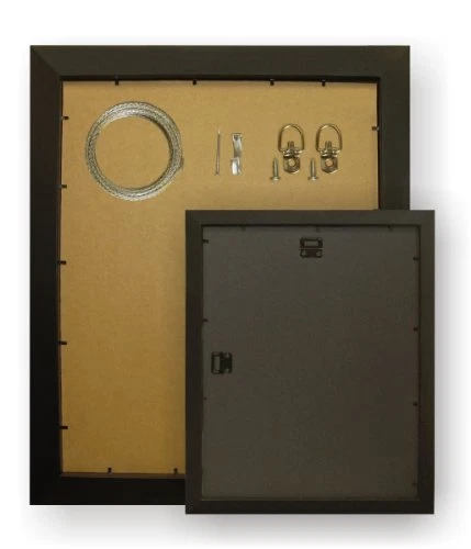 Traditional style; black; wood grain finish Frame includes: clear acrylic facing, rigid cardboard backing and wire hanging hardware kit (some assembly required) Frame holds a 14 inch by 22 inch photo/print/poster (viewable area is slightly smaller) Frame moulding is .825 inch wide; solid wood Made in the U.S.A.