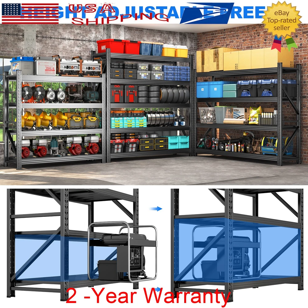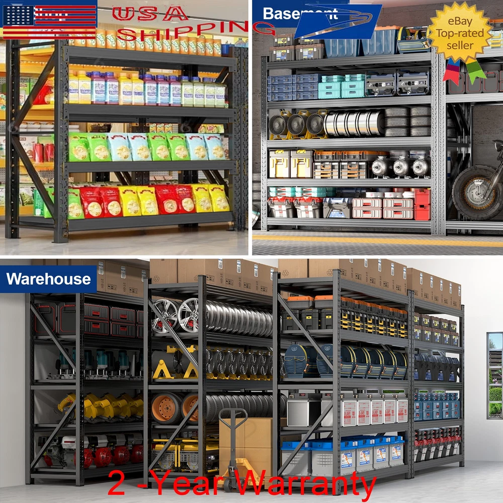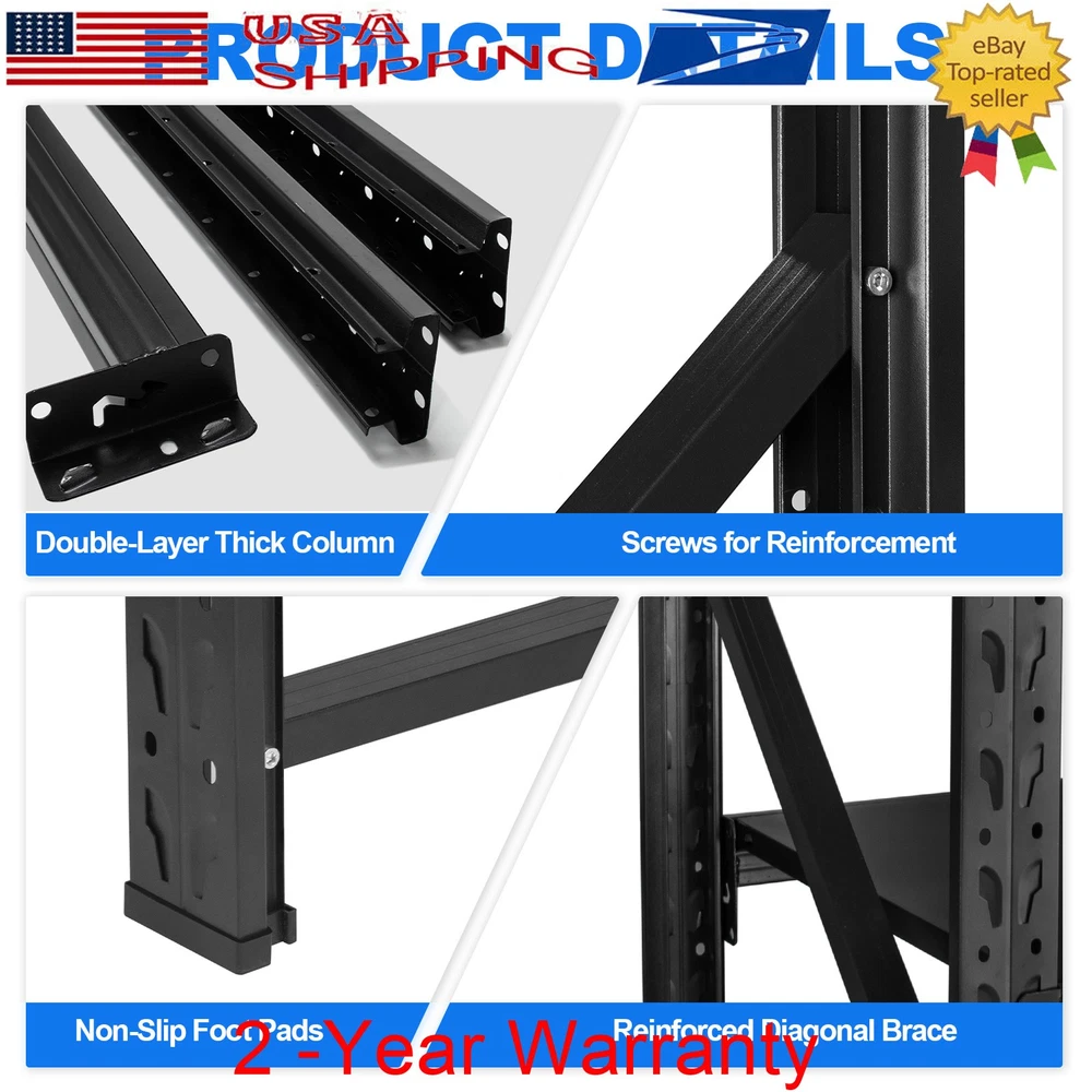 71"H Garage Shelving-5 Tier Garage Storage Shelves,Adjustable Heavy Duty Metal Product Description Say goodbye to wobbling shelves and weak joints. Our Garage Shelving features four one-piece steel columns, thick steel shelves reinforced with ribs, and extra-wide beams for superior durability and strength. It’s perfect for storing tires, generators, tools, and more. Adjustable shelf heights let you create the setup you need, while the quick, 10-minute installation makes organization effortless. About this item 【Heavy Duty Garage Shelving Load 8000LBS 】Designed to handle even the toughest storage challenges. With a total weight capacity of 8000 lbs and 1600 lbs per shelf, this shelving unit is built to withstand heavy-duty use. Featuring one-piece columns, dual Reinforcing Diagonal Supports, reinforced Steel shelves with three support ribs, and extra-wide beams, it offers unparalleled strength and durability. 【One-Piece Columns with Diagonal Supports 】No seams, no weak spots. Our four one-piece columns, reinforced with diagonal supports, are the key to a sturdier, more reliable garage shelves. The seamless design, combined with the diagonal braces, eliminates wobbling and sagging, offering enhanced stability and durability for heavy-duty storage., unlike split column garage shelf that can suffer from weak joints and instability. 【Thick Steel Shelving with Reinforcement Rib】Our shelf’s thick steel shelves, reinforced with ribs and supported by extra-wide beams, provide unmatched durability for all your storage needs. The reinforced ribs help spread the weight evenly across each shelf, while the extra-wide beams ensure maximum load-bearing capacity, preventing any bending or sagging over time. 【Adjustable Metal Shelf】Our heavy duty shelving features adjustable shelves, allowing you to create the perfect storage system for your unique needs. Adjust the height of each shelf to fit everything from large appliances to smaller tools, and enjoy a customizable storage experience. Whether it’s for home or commercial use, this shelving unit is versatile and practical. 【Garage Shevleing with Monster Storage Space】This extra-wide garage shelving is perfect for garages, warehouses, basements, and shops. It’s not just for home use – this shelving unit is also ideal for industrial and commercial applications. Perfect for storing heavy-duty items like tires, generators, and motor oil crates, it's built for mechanics, warehouse professionals, and anyone who needs reliable, heavy-duty storage. 【10-Minute Solo Assembly】We’ve simplified assembly with a comprehensive installation guide and clearly labeled parts for each step. And if you run into any issues, our professional customer service is always ready to offer guidance and support, ensuring a flawless experience. Product Sizes 1PCS --- 5 Tier - 63" W x 24" D x 71" H