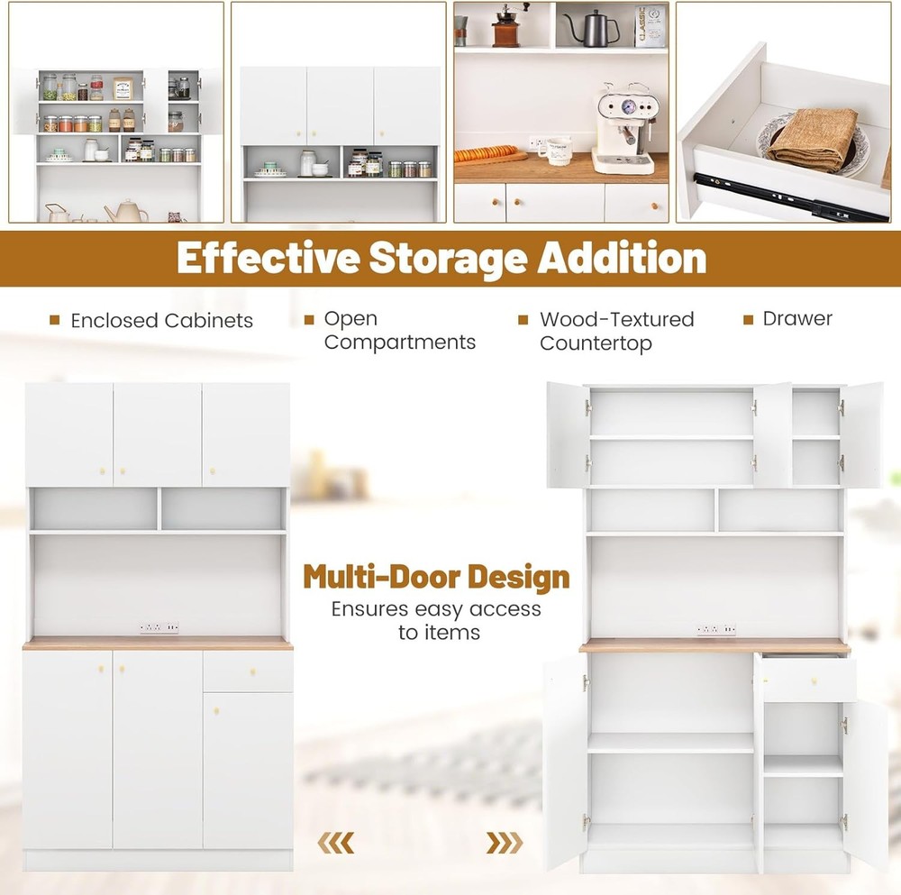 Product Description About this item Enclosed Storage Areas: Elevate your kitchen’s functionality with the pantry cabinet, featuring a drawer and 3 3-position adjustable shelves with each level offering a 1.5” adjustment. Besides, it has multiple doors with adjustable hinges for easy access. Ideal Power Accessibility: No more shortage of sockets. The 71” tall kitchen hutch storage cabinet integrates 2 AC outlets of 125V 12A and 2 USB ports of 5V Max. 2.1A, making it a breeze to operate kitchen gadgets and charge devices. Practical Open Storage: The freestanding buffet cupboard comes with 2 open compartments and a wide countertop, successfully reducing the hassle of finding kitchen supplies. Therefore, your glass, bowl, and seasoning will be easily accessible. Anti-Tipping Protection: Your family’s well-being is our top priority. That’s why the sideboard cabinet includes anti-tipping kits and a large base, ensuring a secure space in your kitchen. By the way, the overall load capacity reaches up to 755 lbs. Modern Design & Wide Use: The pantry cabinet with microwave stand is where sophistication meets modern utility. Its stylish appearance fits seamlessly into any decorations and is perfect for your dining room, living room, kitchen, and more. Description: Upgrade your kitchen’s functionality with the versatile pantry cabinet. It combines enclosed storage areas and practical open compartments, featuring 3-level adjustable shelves, open compartments, a wide countertop, and a drawer. Equipped with AC outlets and USB ports, this 71” tall cabinet provides an easily accessible charging station and convenient power access for kitchen gadgets and charging devices. Safety is a priority with anti-tipping kits and a sturdy base. The kitchen cabinet can support up to 755 lbs. Its modern appearance effortlessly complements any decorations, making it suitable for dining rooms, living rooms, and kitchens. Many other user-friendly details are waiting for exploration. Features: Wood-textured countertop and open compartments provide large open storage Effective storage addition with enclosed cabinets and a pull-out drawer 3-position adjustable shelves make free space arrangement a reality With 2 AC outlets of 125V 12A and 2 USB ports of 5V Max. 2.1A for easy charging The anti-tipping kits keep the cabinet firmly attached to the wall for ensured safety Perfectly ensures easy access to items thanks to the multi-door design Designed with adjustable hinges that ensure door gaps can be flush Fitted with premium metal slides, which are smooth and low-noise Considerately ensure a smooth surface with included screw hole covers Thickened base ensures that the buffet cabinet can stay away from dirty floors Specifications: Color: White Material: MDF, Engineered Wood Overall Dimensions: 39.5” x 16” x 71”(L x W x H) Size of Upper Enclosed Shelves (Left): 25” x 8.5” (L x W) Size of Upper Enclosed Shelves (Right): 12.5” x 8.5” (L x W) Spacing Between Cabinet Top and Upper Shelves: 7” Each Level’s Adjustment of Adjustable Shelves: 1.5” Size of Each Open Compartment: 19” x 9” x 6.5” (L x W x H) Height of On-Countertop Clearance: 16” Size of Countertop: 39.5” x 14”(L x W) Size of Lower Enclosed Shelves (Left): 25” x 13.5” (L x W) Spacing of Lower Adjacent Shelves (Left): 13.5” Size of Lower Enclosed Shelves (Right): 12.5” x 13.5” (L x W) Spacing of Lower Adjacent Shelves (Right): 10.5” Inner Size of Drawer: 10” x 12” x 3.5”(L x W x H) Height of Base: 3” Length of Power Cord: 6.3 ft Total Load Capacity: 755 lbs Load Capacity of Countertop: 330 lbs Load Capacity of Drawer: 25 lbs Net Weight: 132 lbs Package Includes: 1 x Pantry Cabinet 1 x User Guide