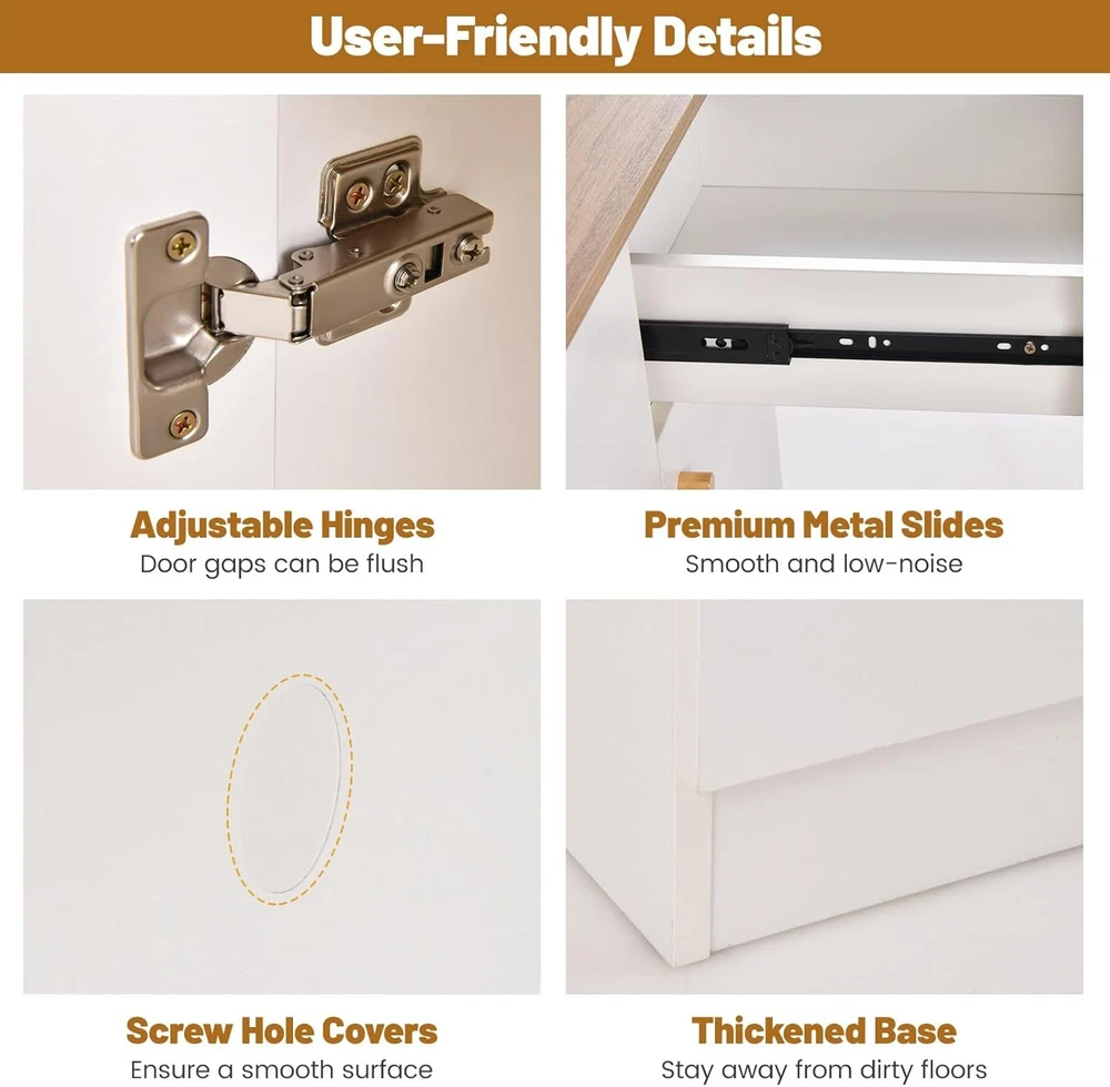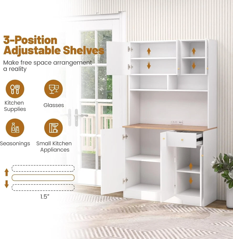 Product Description About this item Enclosed Storage Areas: Elevate your kitchen’s functionality with the pantry cabinet, featuring a drawer and 3 3-position adjustable shelves with each level offering a 1.5” adjustment. Besides, it has multiple doors with adjustable hinges for easy access. Ideal Power Accessibility: No more shortage of sockets. The 71” tall kitchen hutch storage cabinet integrates 2 AC outlets of 125V 12A and 2 USB ports of 5V Max. 2.1A, making it a breeze to operate kitchen gadgets and charge devices. Practical Open Storage: The freestanding buffet cupboard comes with 2 open compartments and a wide countertop, successfully reducing the hassle of finding kitchen supplies. Therefore, your glass, bowl, and seasoning will be easily accessible. Anti-Tipping Protection: Your family’s well-being is our top priority. That’s why the sideboard cabinet includes anti-tipping kits and a large base, ensuring a secure space in your kitchen. By the way, the overall load capacity reaches up to 755 lbs. Modern Design & Wide Use: The pantry cabinet with microwave stand is where sophistication meets modern utility. Its stylish appearance fits seamlessly into any decorations and is perfect for your dining room, living room, kitchen, and more. Description: Upgrade your kitchen’s functionality with the versatile pantry cabinet. It combines enclosed storage areas and practical open compartments, featuring 3-level adjustable shelves, open compartments, a wide countertop, and a drawer. Equipped with AC outlets and USB ports, this 71” tall cabinet provides an easily accessible charging station and convenient power access for kitchen gadgets and charging devices. Safety is a priority with anti-tipping kits and a sturdy base. The kitchen cabinet can support up to 755 lbs. Its modern appearance effortlessly complements any decorations, making it suitable for dining rooms, living rooms, and kitchens. Many other user-friendly details are waiting for exploration. Features: Wood-textured countertop and open compartments provide large open storage Effective storage addition with enclosed cabinets and a pull-out drawer 3-position adjustable shelves make free space arrangement a reality With 2 AC outlets of 125V 12A and 2 USB ports of 5V Max. 2.1A for easy charging The anti-tipping kits keep the cabinet firmly attached to the wall for ensured safety Perfectly ensures easy access to items thanks to the multi-door design Designed with adjustable hinges that ensure door gaps can be flush Fitted with premium metal slides, which are smooth and low-noise Considerately ensure a smooth surface with included screw hole covers Thickened base ensures that the buffet cabinet can stay away from dirty floors Specifications: Color: White Material: MDF, Engineered Wood Overall Dimensions: 39.5” x 16” x 71”(L x W x H) Size of Upper Enclosed Shelves (Left): 25” x 8.5” (L x W) Size of Upper Enclosed Shelves (Right): 12.5” x 8.5” (L x W) Spacing Between Cabinet Top and Upper Shelves: 7” Each Level’s Adjustment of Adjustable Shelves: 1.5” Size of Each Open Compartment: 19” x 9” x 6.5” (L x W x H) Height of On-Countertop Clearance: 16” Size of Countertop: 39.5” x 14”(L x W) Size of Lower Enclosed Shelves (Left): 25” x 13.5” (L x W) Spacing of Lower Adjacent Shelves (Left): 13.5” Size of Lower Enclosed Shelves (Right): 12.5” x 13.5” (L x W) Spacing of Lower Adjacent Shelves (Right): 10.5” Inner Size of Drawer: 10” x 12” x 3.5”(L x W x H) Height of Base: 3” Length of Power Cord: 6.3 ft Total Load Capacity: 755 lbs Load Capacity of Countertop: 330 lbs Load Capacity of Drawer: 25 lbs Net Weight: 132 lbs Package Includes: 1 x Pantry Cabinet 1 x User Guide On Aug 14, 2025 at 21:35:57 PDT, seller added the following information: