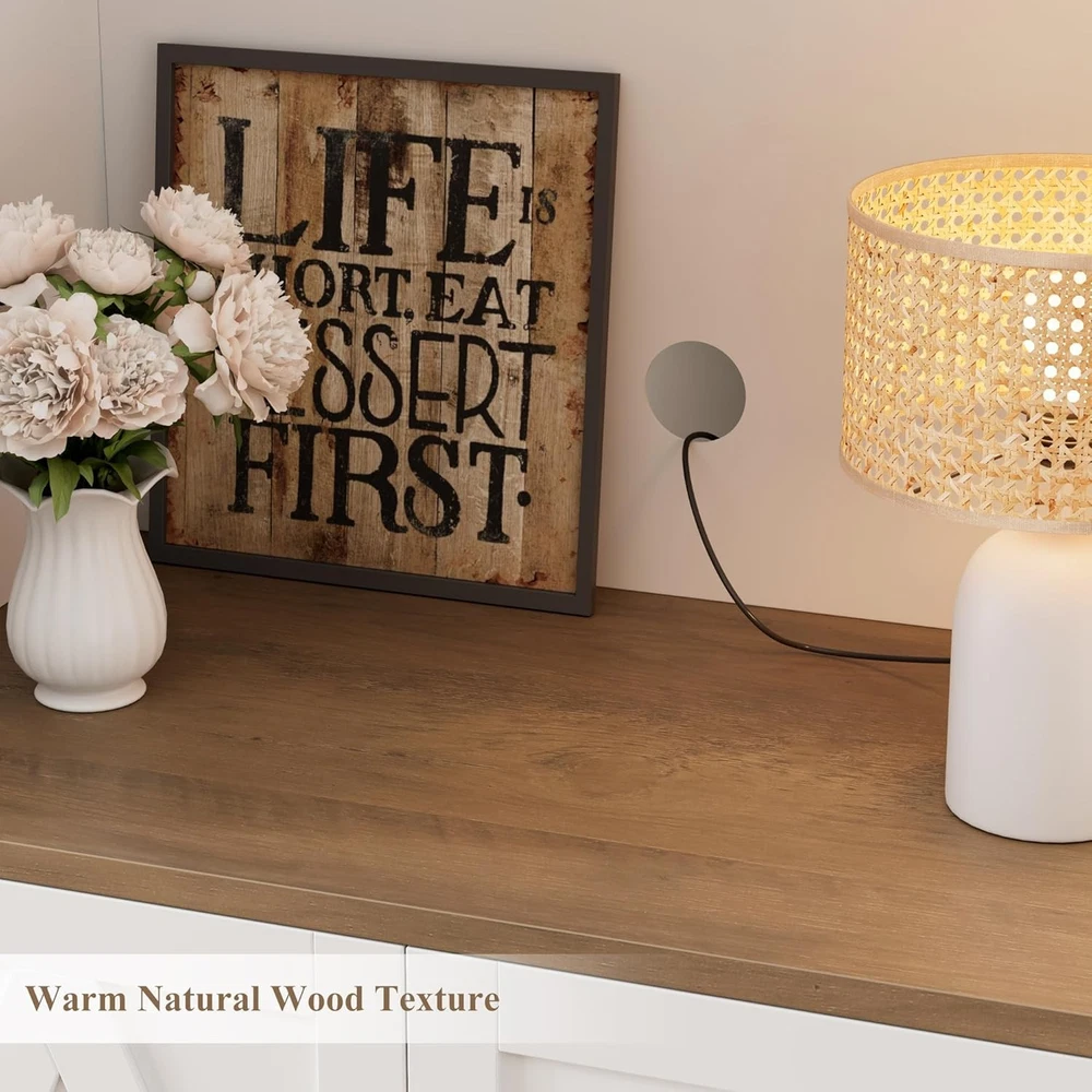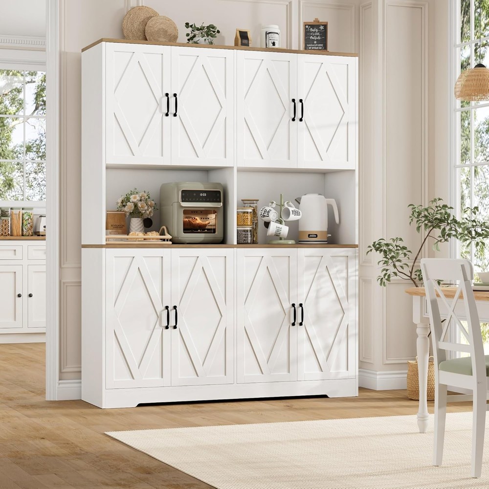 Product Description Give your home a modern farmhouse feel with this sturdy Storage cabinet - let it solves the messy storage dilemma in your kitchen. Our exquisite coffee hutch can sit beautifully in any room you have while bringing tons of storage, it is here to transform your living space.Boasting a spacious worktop,convenient countertop outlets, and efficient cable management,this cabinet is designed for modern living. About this item Large Storage Space: This kitchen pantry cabinet boasts 8 fully enclosed storage compartments with doors, offering a neat and exclusive space to organize kitchen supplies for easy access. 2 separate countertops accommodate the simultaneous operation of a microwave and a coffee maker without spatial interference Versatility Is At Its Core: Whether in the kitchen for easy access to ingredients while cooking, in the dining room to display cutlery and serve as a buffet station during gatherings, or in the living room as a storage cabinet for snacks and entertaining essentials, this pantry hutch cabinet can meet every need you may have Modern Farmhouse Charm: Transform your space with this freestanding pantry cabinet! The intricate diamond patterns on the doors add a unique texture, making this storage cabinet a striking statement piece for any kitchen or dining room while seamlessly blending into a modern farmhouse-inspired ensemble Durable and Sturdy: Made of high-quality engineered wood, equipped with a sturdy base and anti-tipping device, this pantry storage boasts excellent stability and durability for long-lasting use. All doors with a buffer hinge that closes slowly and smoothly with just a light push. Overall Size: 16" D x 55'' W x 71" H Easy Assembly: Each installation step includes clear instructions, part numbers, and illustrations for easy understanding and assembly. Due to the product's large size, we kindly suggest that two adults work together during the setup. Please note that this kitchen cabinets will be delivered in two separate packages