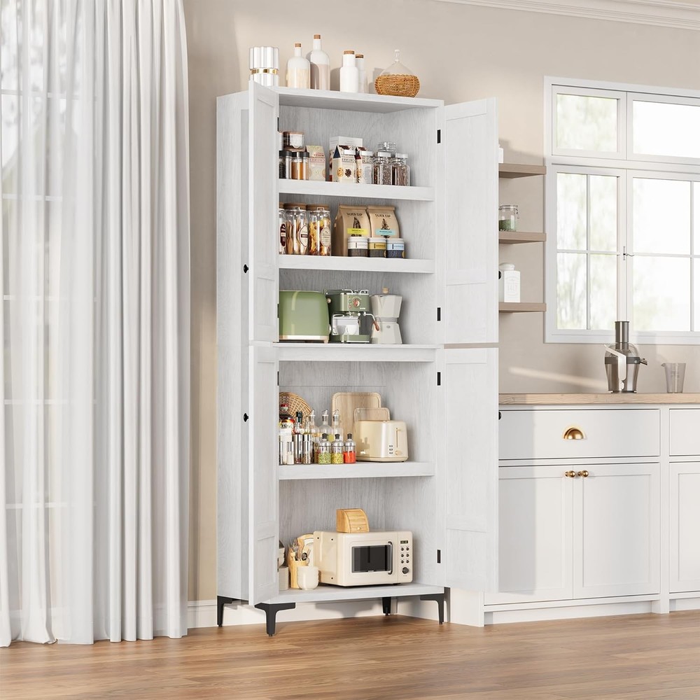 71 Inch Tall Storage Cabinet, Kitchen Pantry Cabinet 5 Tier Bathroom Cabinet with 4 Doors Adjustable Shelves for Kitchen, Dining Room, Bathroom Product Description About this item Vertical Elegance: Standing at 71 inches tall and measuring 27.56 x 13.78 inches, this tall storage cabinet features five tiers and four doors, providing ample space for organizing items. Its narrow design makes it ideal for tight spaces in your home Tailored Storage: This narrow wooden cabinet features one adjustable shelf for customized storage solutions. Modify shelf heights to accommodate items from pantry goods to bathroom essentials, ensuring everything has its place Built to Endure: Made from thick engineered wood and sturdy metal hardware, this bathroom cabinet offers stability and longevity. The magnetic closure secures the doors, and the elevated bottom guards against damage for added durability Multi-Purpose Use: This farmhouse storage organizer serves as a bathroom cabinet, pantry storage, accent cabinet, or garage and office cabinet. Its versatile design enhances organization throughout your home, making it a practical addition to any room Effortless Assembly: With clear instructions and labeled parts, assembly is simple. For best results, having two people assist is recommended, ensuring a smooth and efficient experience while you enjoy your new pantry cabinet Kitchen Pantry with Doors Not just for the kitchen, this storage cabinet is suitable for Bathroom, Dining and Study spaces, and more, catering to a variety of storage needs. With its dual-door design, this cabinet provides ample storage for towels, toiletries, and bathroom essentials, keeping your bathroom organized and clutter-free. Previous page Next page Previous page MDF Board Showcasing exquisite textures, combines elegance with durable storage, enhancing your space's style. Metal Leg The cabinet features sturdy metal legs, ensuring stability and adding a modern touch to your decor. Next page Sturdy and Modern Design Features robust metal legs that ensure exceptional stability and durability, adding a contemporary touch to decor while providing practical support. Anti-Tip Design Equipped with an anti-tip design, this cabinet stability during use, offering additional safety, especially for homes with children or pet. Classic Charm Handles add a unique character and charm to the cabinet, seamlessly blending modern aesthetics with traditional elegance to enhance your space. Convenient Setup Designed with easy-install hinges, simplifies the assembly process, allowing users to set it up quickly Storage Cabinet