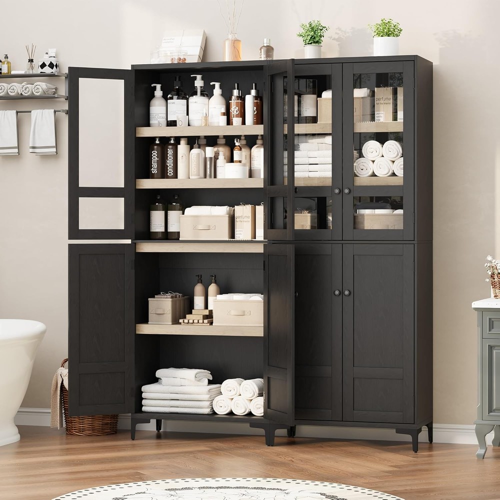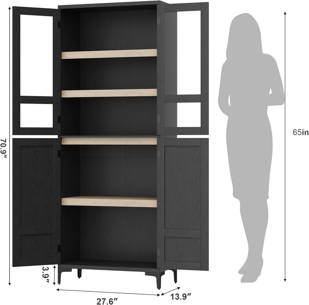 71 Inch Tall Storage Cabinet with Glass Doors, Kitchen Pantry 5 Tier Bathroom Cabinet with 4 Doors Adjustable Shelves for Kitchen, Dining Room, Bathroom (Black, 4 Door with Glass) Product Description About this item Vertical Elegance: Standing at 71 inches tall and measuring 27.56 x 13.78 inches, this tall storage cabinet features five tiers and four doors, providing ample space for organizing items. Its narrow design makes it ideal for tight spaces in your home Tailored Storage: This narrow wooden cabinet features one adjustable shelf for customized storage solutions. Modify shelf heights to accommodate items from pantry goods to bathroom essentials, ensuring everything has its place Built to Endure: Made from thick engineered wood and sturdy metal hardware, this bathroom cabinet offers stability and longevity. The magnetic closure secures the doors, and the elevated bottom guards against damage for added durability Multi-Purpose Use: This farmhouse storage organizer serves as a bathroom cabinet, pantry storage, accent cabinet, or garage and office cabinet. Its versatile design enhances organization throughout your home, making it a practical addition to any room Effortless Assembly: With clear instructions and labeled parts, assembly is simple. For best results, having two people assist is recommended, ensuring a smooth and efficient experience while you enjoy your new pantry cabinet Kitchen Pantry with Doors