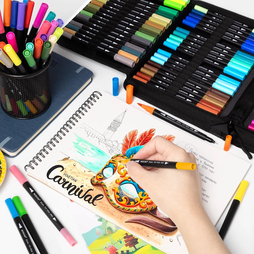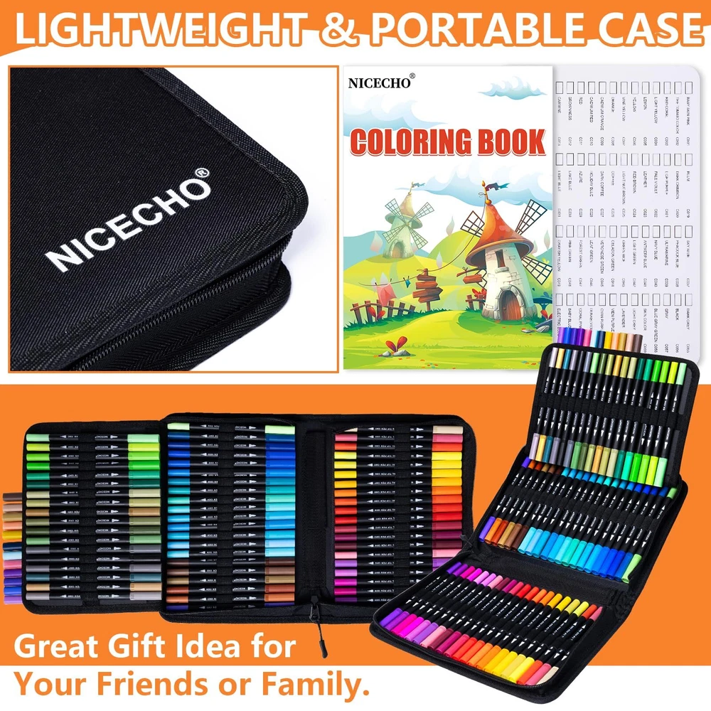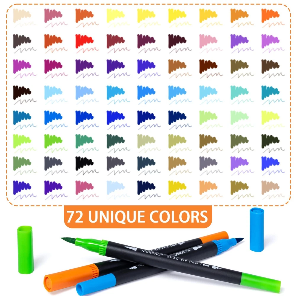 【72 VIBRANT COLORS】Each set Includes 72 primary and complementary colors, NO duplicate. You'll never run out of possibilities or color options with this deluxe coloring markers set. Just blend beautifully for added dimension to your artwork, and create one you never have before. 【CONVENIENT, STURDY DUAL TIPS】With 2 different tips to choose from, you have an infinitely wider array of coloring styles at your disposal! BRUSH for sweeping strokes and blending, FINE POINT for intricate details like sketching and writing. 【SMOOTH, NONTOXIC INK】Nicecho dual brush marker set come with high-quality water-based ink that flows smoothly. The ink's vibrant colors seamlessly blend, providing beautiful and consistent coloring effects without smudges. 【PORTABLE & DURABLE BAG】Our dual tip pens comes with a durable carrying case which have pen slots to organize all your colors. If you know someone who's artistically inclined in your life, this is a thoughtful gift that will keep on giving. 【MULTIFUNCTIONAL & SUITABLE FOR ALL AGES】Ideal for various artistic pursuits such as drawing, lettering, coloring books, and sketching. Perfect art suppliers for all ages, making it an excellent gift for artists, students, and creative enthusiasts.