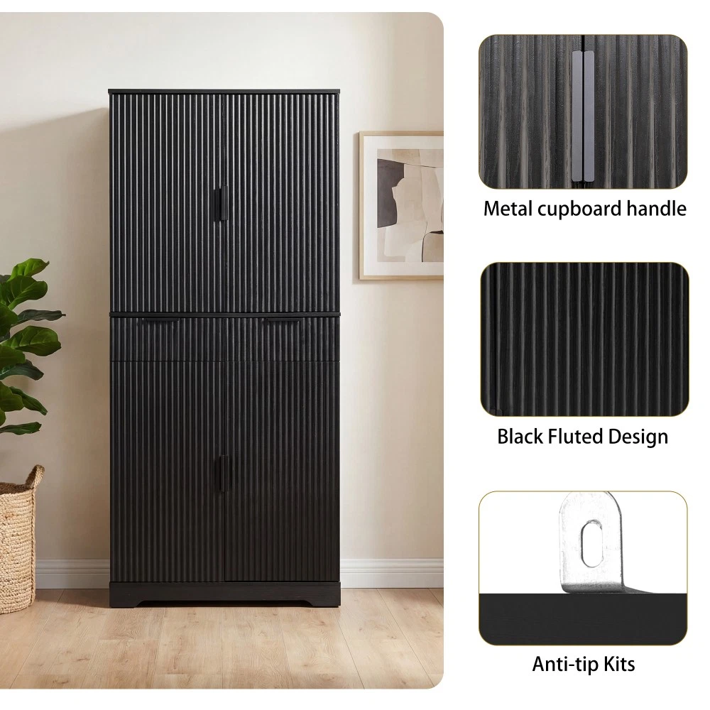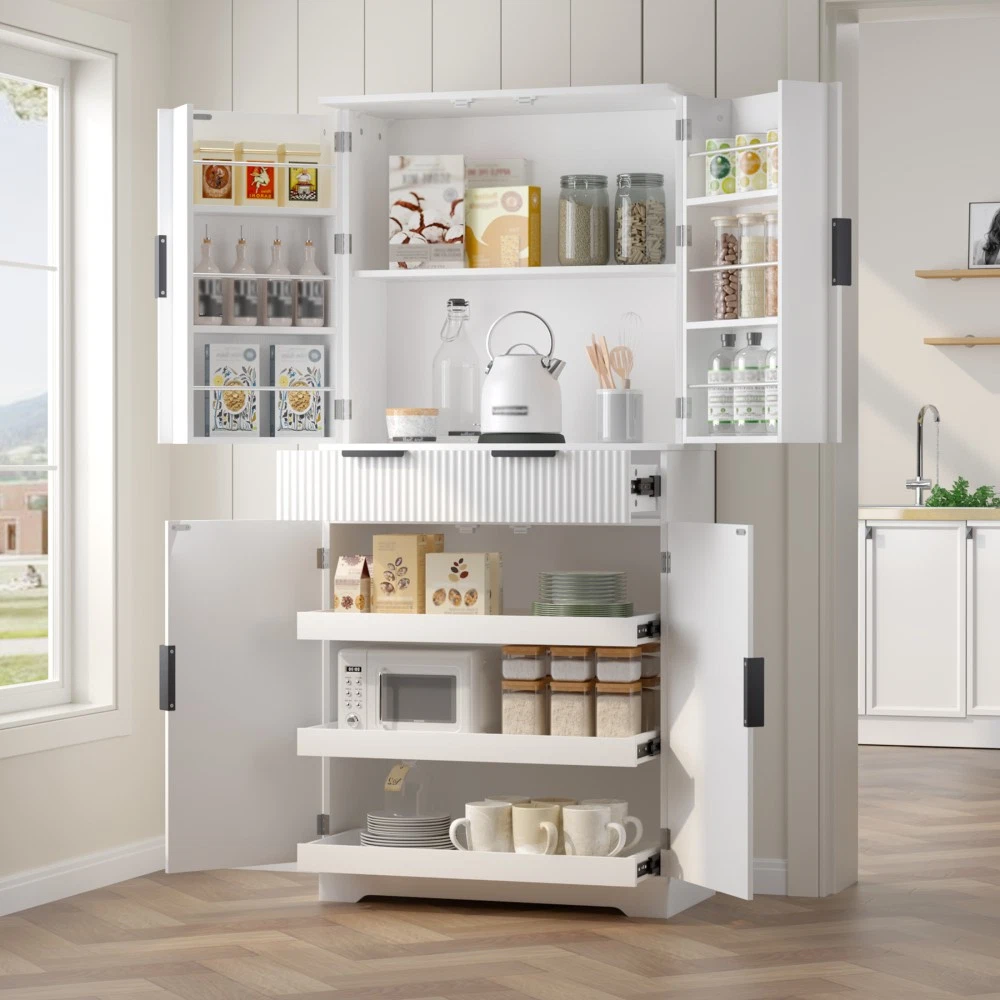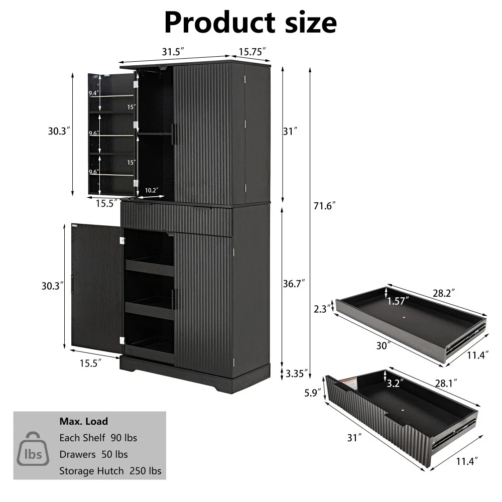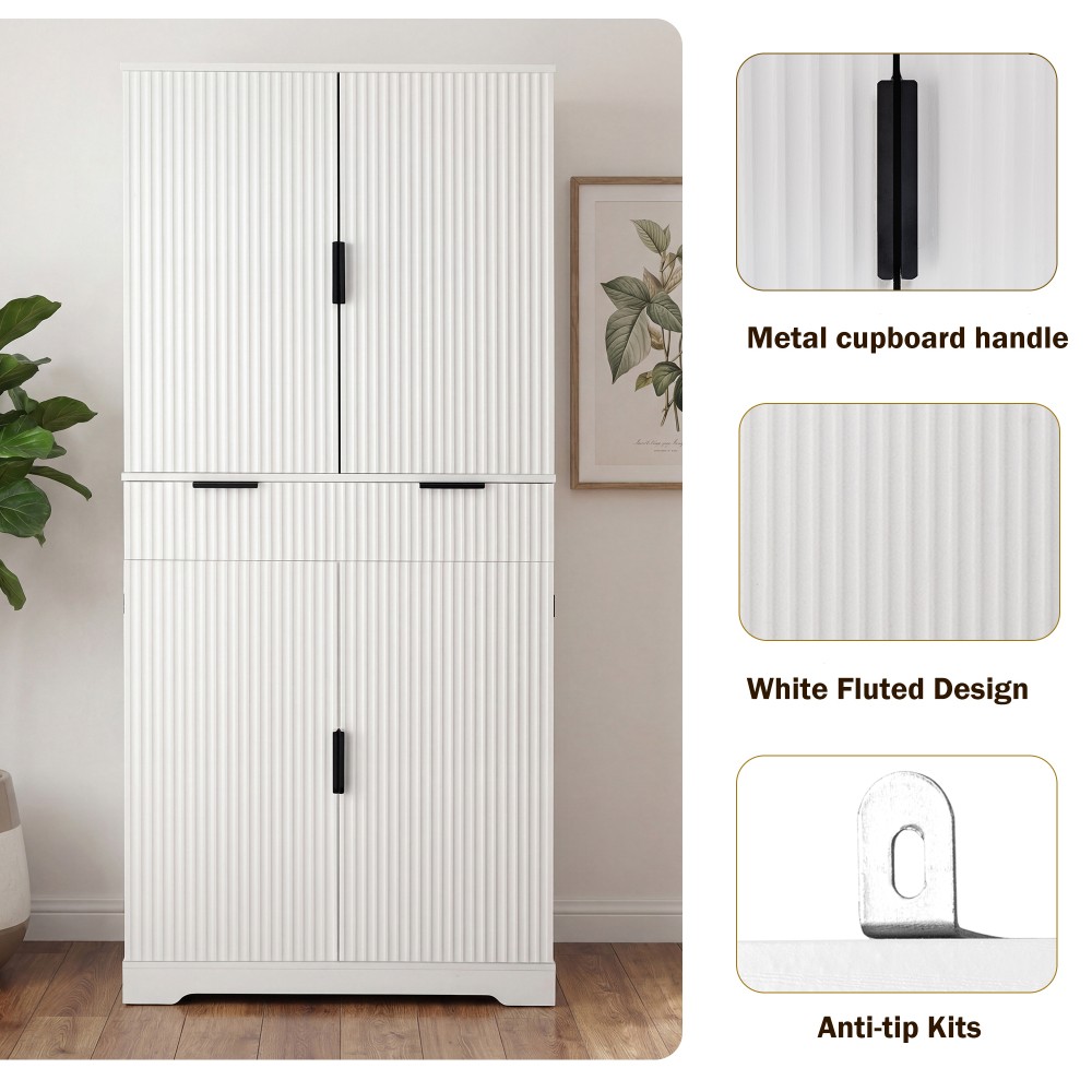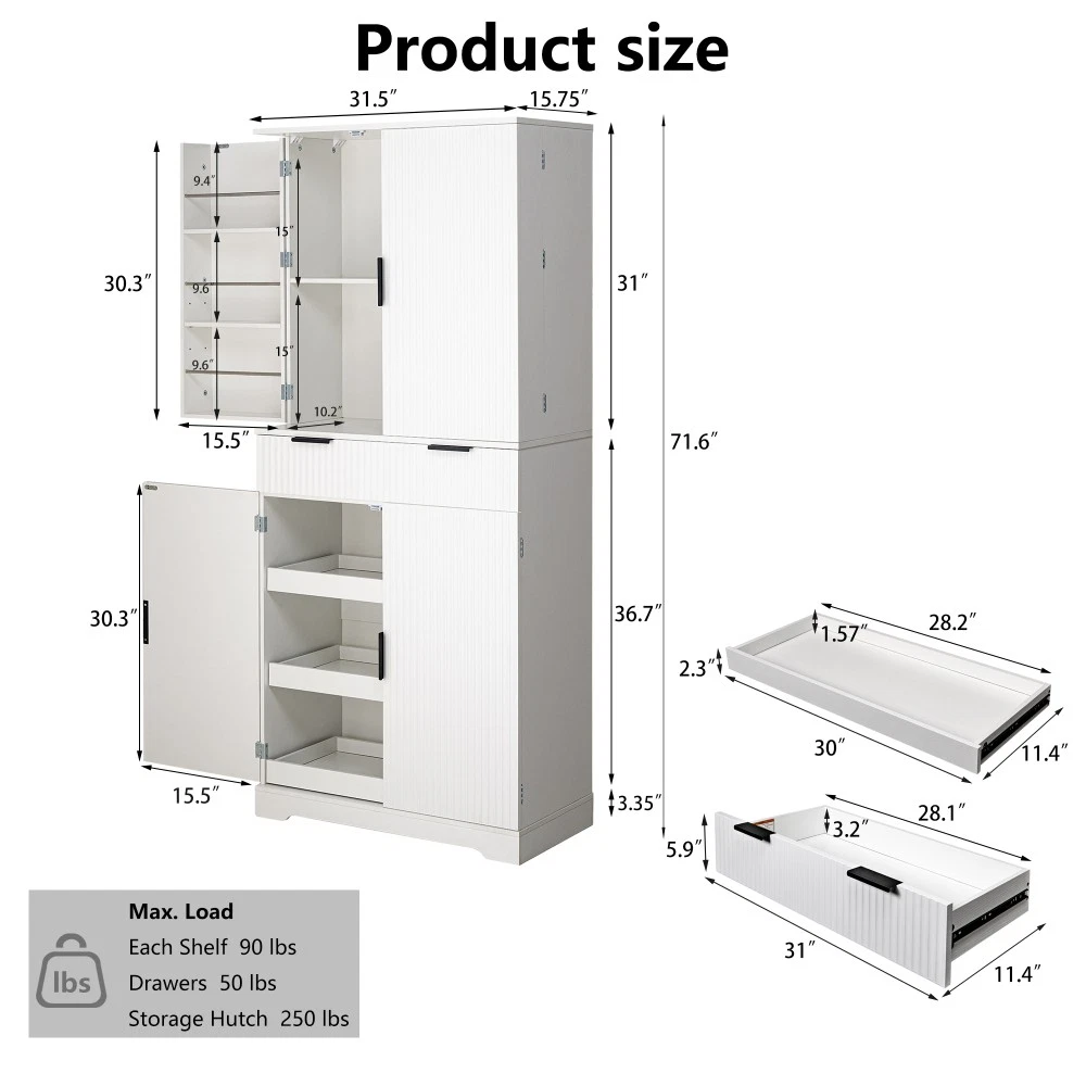 Product Specifications Feature Details Origin China Color White Material High-Quality MDF Applicable Scenes Kitchen, Bathroom, Office, Entryway, Dining Room Storage Features 3 Keyboard Drawers, 6 Door Shelves (1 Adjustable), Large Main Cabinet Texture Elegant Fluted Design Assembled Dimensions (L×W×H) 31.50 × 15.75 × 71.65 Inches Product Weight 118.14 LBS Package Dimensions (L×W×H) 42.13 × 18.90 × 11.02 Inches Package Weight 126.50 LBS Key Features Spacious & Versatile Storage : This pantry cabinet boasts a roomy main cabinet, 3 smooth slide-out keyboard drawers, and 6 door shelves—providing ample space to organize kitchen essentials (food, dinnerware, small appliances), bathroom toiletries, office supplies, or entryway odds and ends. It meets all your diverse storage needs with ease. Maximized Door Storage : The 6 door shelves (note: only the second shelf is adjustable) increase the cabinet’s storage capacity by up to 40%, turning unused door space into functional storage. Perfect for keeping spices, olive oil, condiments, or small toiletries within easy reach. Smooth Slide-Out Access : The 3 bottom keyboard drawers glide effortlessly, allowing you to access dishes, cookware, pantry items, or office supplies without digging through the back of the cabinet. No more hassle—everything you need is right at your fingertips. Magnetic Door Reinforcement : Built-in magnetic devices on the door panels ensure a tight, flawless closure every time. It automatically aligns the doors, eliminates gaps, and effectively blocks dust and moisture to keep your stored items clean and dry. Elegant Fluted Design : The classic fluted texture adds a touch of sophistication to any space, elevating your home decor while delivering practical storage. The clean white finish complements any color scheme and decor style. Easy Assembly : All accessories are clearly numbered, and a detailed installation guide is available on our product page. We recommend two adults for assembly—please do not fully tighten screws too early to avoid the need for reassembly. If you encounter any issues during assembly, our customer service team is here to help! Customer Assurance ✅ 1-Year Quality Warranty : We stand behind the quality of our pantry cabinet. Enjoy a 1-year warranty against manufacturing defects for peace of mind. ✅ 30-Day Free Return & Exchange : Not completely satisfied? We offer a 30-day free return and exchange policy—no questions asked. Shop with confidence! Why Choose This Pantry Cabinet? It’s not just a storage cabinet—it’s a stylish addition to your home that combines functionality and elegance. With its versatile design, it works in every room: keep your kitchen clutter-free, organize your bathroom essentials, store office supplies neatly, or add extra storage to your entryway or dining room. The durable MDF construction ensures long-lasting use, while the fluted texture and white finish add a timeless look. Add this 72-inch fluted pantry cabinet to your cart today and transform your home storage!