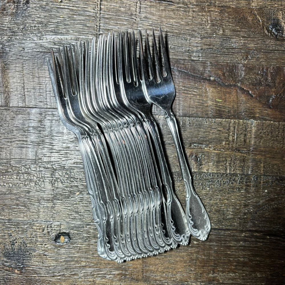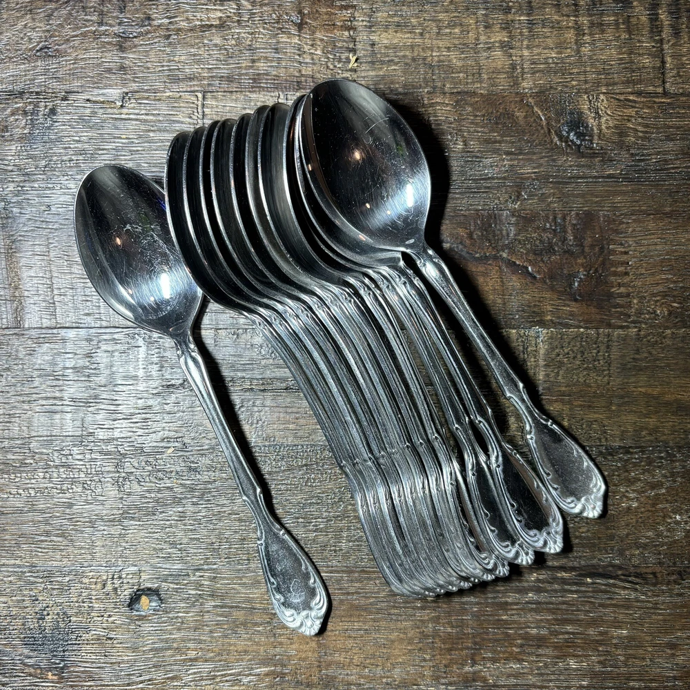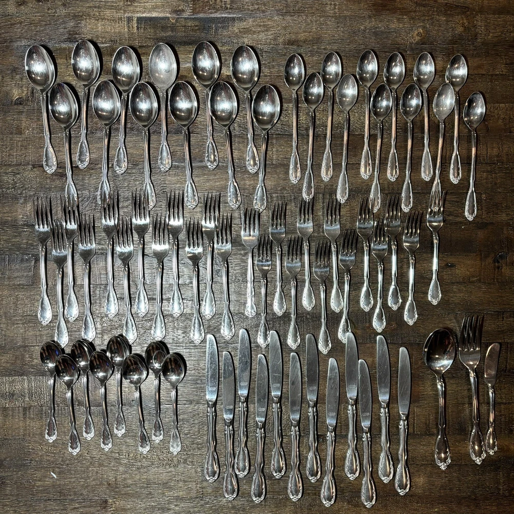 72 Peice Set! Service for 10 Plus Hostess Set These items are pre-owned. Overall, they are in very good condition with some wear (fine scratches) due to age and use. 12 - Dinner Knives 12 - Dinner Forks 12 - Place Spoons 13 - Salad Forks 8 - Teaspoons 12 - Ice Tea Spoons 1 - Master Butter Knife 1- Serving Spoon 1- Serving Fork