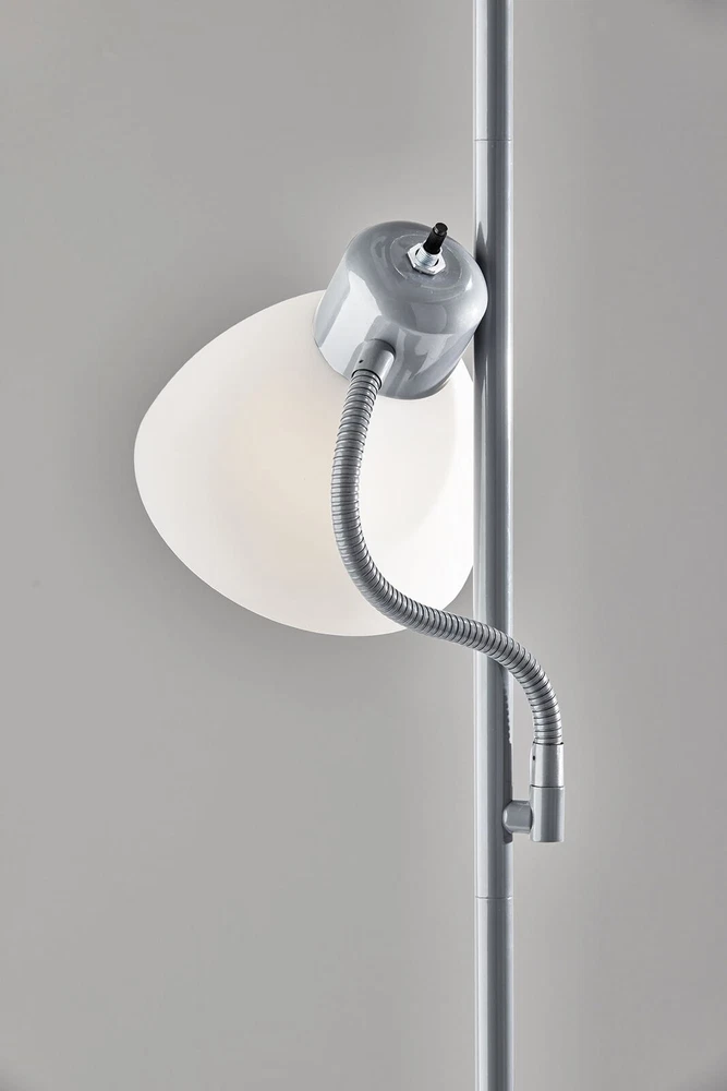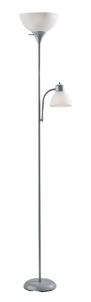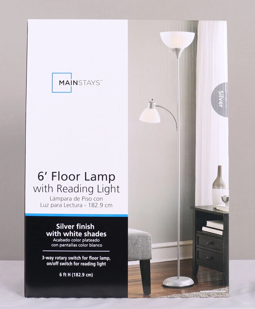 The JK1660SLV combination floor lamp is two lamps in one, featuring a 100-watt main lamp with an additional 60-watt reading lamp (light bulbs not included). This sturdy yet slim 72" plastic lamp includes an attached reading lamp with an adjustable gooseneck, two plastic shades for a subtle ambient effect, and a 9" diameter plastic base. The main top light is controlled by a 3-way rotary switch and a simple on/off switch for the bonus reading lamp. The sleek and modern design makes this lamp a perfect addition to any adult living room, bedroom, or adult home office and a must-have for young adult college living spaces. 72" JK1660SLV floor lamp 3-way rotary light for main light source 100W and 60W bulbs required (not included) Additional reading light has a convenient on/off switch Reading light features a flexible arm Plastic shades absorb light intensity as it is needed Available colors black, silver, brown, white Modern finish complements the decor of most living areas Ideal for bedrooms, adult home offices, dens, dorm rooms On Jan 8, 2025 at 02:29:44 PST, seller added the following information: