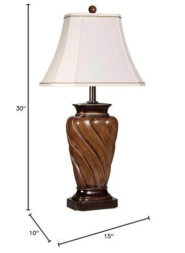 Transitional Table Lamp- Toffee Wood Finish - White Fabric Shade This piece measures as 10"L x 15"W x 30"H - 15lbs. Crafted from: Poly, Fabric Suitable for any indoor location Requires 1 x 75-watt E26 Medium base Incandescent bulb (not included) - 120V Shade measures as 10"L x 15"W x 11"H