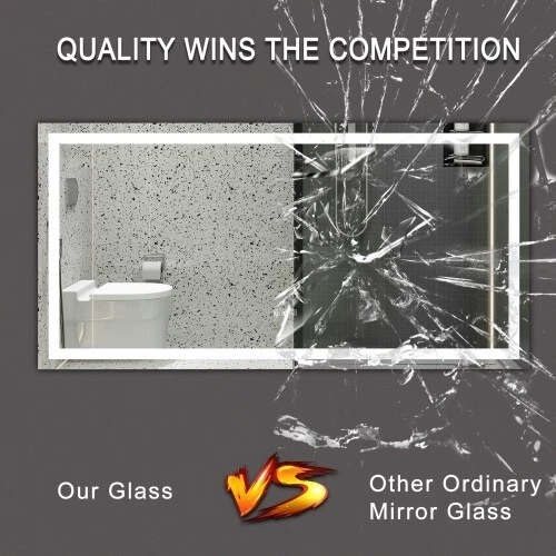 Description Lights & Super Bright: With built-in LED strip lights, LED lighted bathroom mirror gives out the lighting. The lighting mirrors are bright enough for makeup or shave or beauty care. Shatterproof & Corrosion Proof:Our mirror is made from stronger glass, that is armored glass. It will not get broken easily. Even it is broken, it will not shatter to piece, no harm, more safe to use. With epoxy coat, this mirror is corrosion proof. It will not get corroded after 30days acid test. Colors Changeable and Brightness Dimmable: This LED illuminated mirror is multifunctional. You can press the button to change the color temperatures: Warm(3000K), natural (4200K) and white(6400K). You can also dim the bright to your comfortable level. All these will be easily controlled by the touch button. The smart memory function will record the lighting setting and keep the previous lighting status after turning off and on. Easy to Install and Powered by Hard Wire Features Lights & Super Bright Colors Changeable and Brightness Dimmable Easy to Install and Powered by Hard Wire Press the button to change the color temperatures: Warm(3000K), natural (4200K) and white(6400K).
