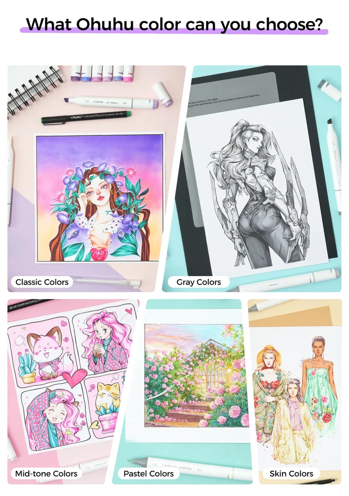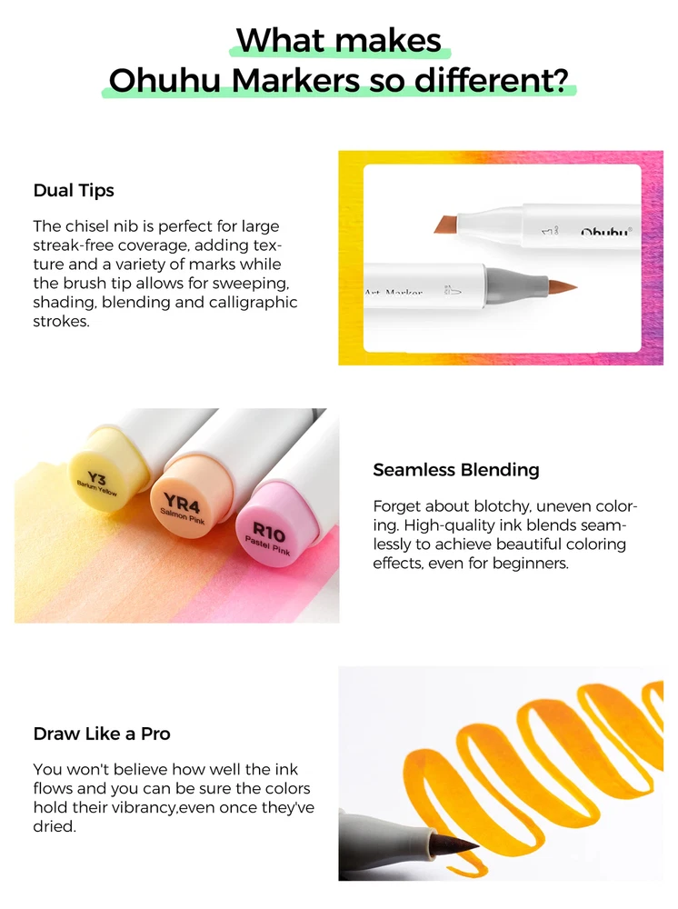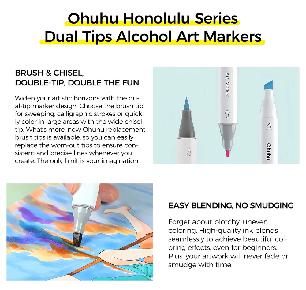 Main Featrues 【Honolulu Series】BRUSH & CHISEL , DOUBLE-TIP, DOUBLE THE FUN Widen your artistic horizons with the dual-tip marker design! Choose the brush tip for sweeping, calligraphic strokes or quickly color in large areas with the wide chisel tip. What's more, now Ohuhu replacement brush tips is available, so you can easily replace the worn-out tips to ensure consistent and precise lines whenever you create. The only limit is your imagination 【Honolulu B Series】BRUSH & FINE , DOUBLE-TIP, DOUBLE THE FUN Widen your artistic horizons with the dual-tip marker design! Choose the brush tip for sweeping, calligraphic strokes or the fine tip for details. What's more, now Ohuhu replacement brush tips is available, so you can easily replace the worn-out tips to ensure consistent and precise lines whenever you create. The only limit is your imagination REFILLABLE INK FOR A LIFETIME OF CREATIVITY With 51 Ohuhu popular colors available for refills now and more on the way, your creativity knows no bounds. Enjoy a wide range of hues and keep your markers going for years to come. Whether you're exploring the rich colors of Honolulu, Oahu, the Kaala, or the bold hues of Molokai Series, they are refillable now. Switch between sets seamlessly and unlock endless artistic possibilities. Elevate your artwork with Ohuhu markers, designed for a lifetime of creativity SEAMLESSLY BLENDING Say goodbye to unsightly splotches and uneven coloring. Our high-quality ink seamlessly blends to create beautiful, professional-grade artwork, perfect for both beginners and experienced artists; Also, no more frustrating smudges or wet ink ruining your work. Our alcohol-based ink dries quickly, ensuring that your art is always clean, crisp, smudge-free, and ready to display 72 VIBRANT COLORS + 1 COLORLESS BLENDER The rainbow is at your fingertips - choose from 72 brilliant colors and bring your ideas to life. The color spectrum is yours to explore with 72 brilliant shades to choose from, plus a colorless blender for better blending effects. From coloring books to professional masterpieces, our brush markers will breathe life into your artwork EASY IDENTIFICATION, ORGANIZATION & PORTABILITY Don't waste time searching for the perfect color. Our markers come with color-coded caps to keep you organized and efficient. Plus, the free carrying case makes these markers perfect for any coloring adventure or as a thoughtful gift for any artist Product Description