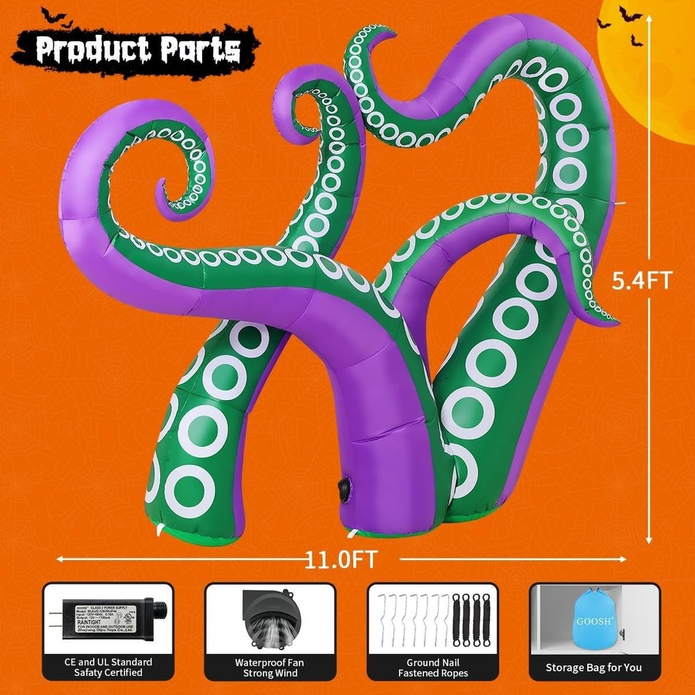 7.2FT Halloween Inflatable Octopus Outdoor Yard Decor w/ Built-In LED Lights About this item: Halloween Inflatable Octopus: The built-in bright LED light inflatable creates a wonder and magic atmosphere in the darkness, attention-grabbing; Perfect choice for halloween inflatable decoration, you can place it at your yard, garden, or entryway to decorate halloween Fast Inflate and Safe: Our Halloween blow up comes with Waterproof Powerful Blower; Just zip up and plug in, and the inflatable will Inflate to full within 1 minute automatically; The CE and UL standard safety-certified adapter with a 10 FT power cord means that you can safely place it anywhere in your home, yard, or garden Strong Materials: GOOSH Halloween blow up yard decorations are made of thickened, waterproof polyester material; Strong, which is against rips and tears; These inflatable Halloween decorations can still operate perfectly even in windy and rainy weather, ensuring that your outdoor space is filled with festive joy Easy to Use: Package included ground stakes, securing ropes, storage bags; Just attach ropes to stake and secure to the ground that the Halloween inflatables will stand firmly, no need to worry about it flying away in outdoors Safety First: Avoid inserting objects into the blower or decorations for safe and damage-free operation. Wish you have an unforgettable Halloween experience with GOOSH Halloween inflatables!