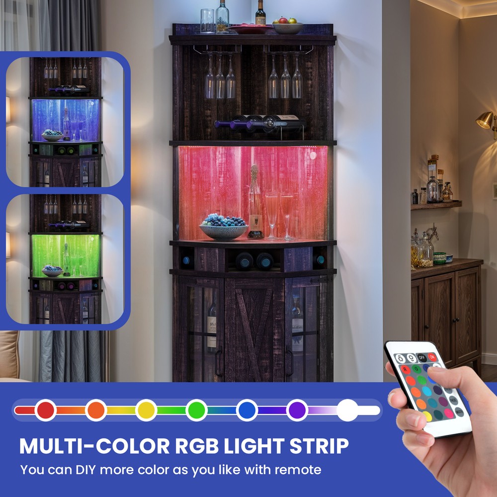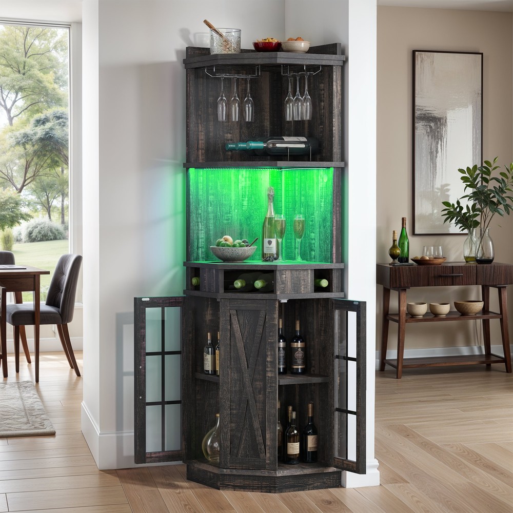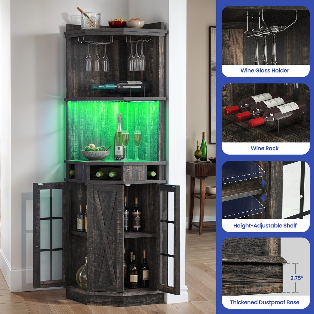 72" Corner Bar Cabinet Liquor Storage Wine Bottle Rack Glass Door with LED Lights Product Description NOTE: Professional Installation would be Highly Recommended. Description: 1. Color: Black Oak 2. Material: MDF, Particle Board, Glass, Metal Handle 3. Room Type: Kitchen, Entryway, Living Room, Dining Room 4. Special Design: With Cabinet, Wine Glass Holder, Wine Rack, Adjustable Shelves, Waterproof Light Strip, Remote Control, Customizable LED Light, 12 Color Lighting Modes Features: 1. Adjustable Brightness LED Light: The Wine corner cabinet features 17 colors modes, 4 dynamic flashing modes, and adjustable brightness to create the perfect ambiance for any occasion. Whether it's a wine tasting, a lively party, or simply showcasing your collection, this cabinet offers both dazzling style and easy access to your favorite wines. 2. Large Storage with Adjustable Shelves: Three open shelves showcase your glassware and favorite wines elegantly. The lower cabinet, featuring glass doors, helps keep your barware neatly organized. Inside, adjustable shelves allow for customized storage. This design enhances both functionality and aesthetics in your bar area. 3. Sturdy Material & Stable Cabinet: Made from premium engineered wood, this corner wine bar cabinet is built for lasting durability. Its sturdy 2.75-inch thick base is dustproof and offers excellent stability. This ensures your wine collection is stored safely and securely. Enjoy both reliability and functionality in your storage solution. 4. Versatile Cabinet: These wine cabinets feature sharp 90-degree angles for a seamless fit. They are perfect for enhancing the style and utility of any room, whether it’s your dining room, living room, kitchen, or bedroom. The design brings both elegance and practicality to your space. Add a touch of sophistication to your home with these versatile cabinets. Dimensions: 1. Product Dimensions: 28.34"L X 18.11"W X 72"H 2. Corner Width: 18.11"W 3. Dustproof Base: 2.75"H 4. Maximum Load Capacity: 77 lbs 5. Item Weight: 86.53 lbs Package Included: 1. 1 x Corner Cabinet 2. 1 x Instructions 3. 1 x Accessory Kit Shipping 1. Normally the item will be dipatched within 1 business day if payment is cleared before 12pm PST. 2. Please verify the correct shipping address in your PayPal account before making the payment. We only dispatch the item to the address that is sent to us at the time of checkout. 3. We don't ship to Hawaii, Alaska, Puerto Rico, APO/FPO/PO Boxes. 4. We don't provide local pick-up service. 5. Normally we will use USPS, UPS, FedEx & LTL to dispatch items. Payment 1. We accept PayPal and credit card. 2. We will ship to the confirmed Paypal shipping address that is provided with the payment only. Return 1. 30 days Money Back Guarantee. 2. Please contact our customer service to receive a RMA form first if want to return the item. 3. All returned items MUST in new condition with the original package. Contact If has any problem, please contact us by sending an ebay message. Our customer service will resolve the problem as soon as possible. On Jul 3, 2024 at 01:08:26 PDT, seller added the following information: On Jul 14, 2024 at 21:06:23 PDT, seller added the following information: On Jul 24, 2024 at 05:30:25 PDT, seller added the following information: On Aug 5, 2024 at 19:28:32 PDT, seller added the following information: On Aug 8, 2024 at 04:06:03 PDT, seller added the following information: On Aug 28, 2024 at 22:13:25 PDT, seller added the following information: On Sep 18, 2024 at 21:49:59 PDT, seller added the following information: On Oct 20, 2024 at 22:11:07 PDT, seller added the following information: On Nov 11, 2024 at 19:16:15 PST, seller added the following information: On Nov 17, 2024 at 22:18:37 PST, seller added the following information: On Nov 22, 2024 at 00:23:58 PST, seller added the following information: On Nov 30, 2024 at 17:58:57 PST, seller added the following information: On Dec 16, 2024 at 23:14:06 PST, seller added the following information: On Dec 22, 2024 at 18:02:01 PST, seller added the following information: On Jan 30, 2025 at 18:47:21 PST, seller added the following information: On Feb 12, 2025 at 20:36:15 PST, seller added the following information: On Mar 12, 2025 at 18:55:44 PDT, seller added the following information: On Mar 16, 2025 at 23:53:10 PDT, seller added the following information: