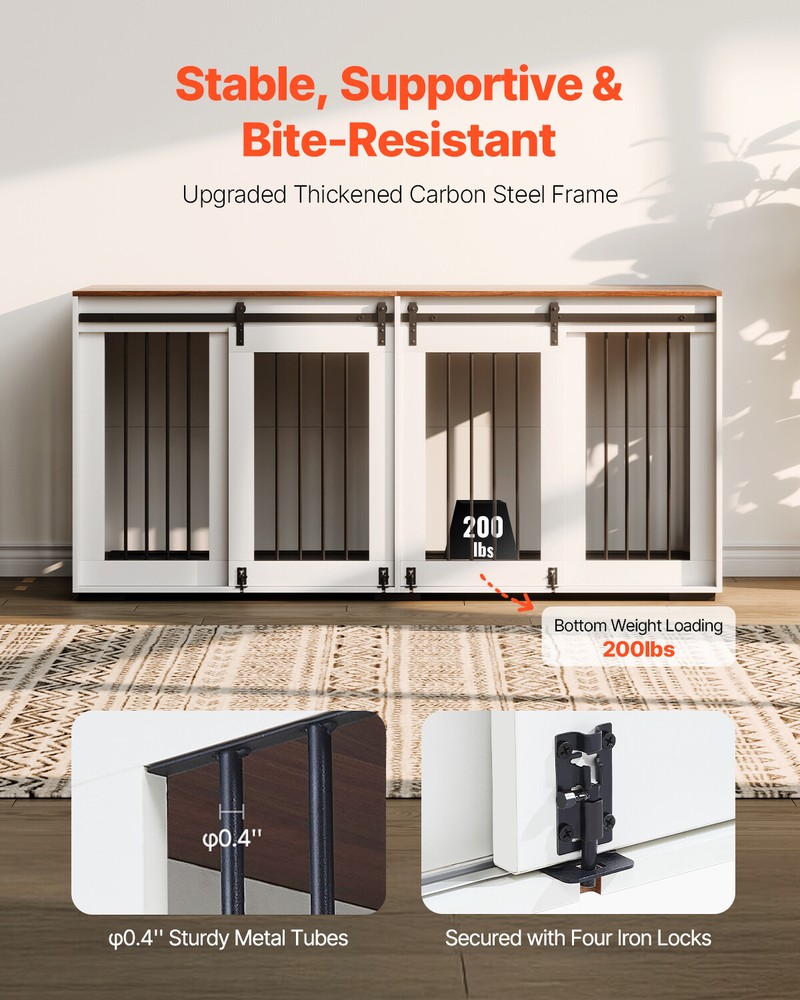Document Product Description Elegant and Functional Dog Crate This furniture-style dog crate combines elegance and practicality. It features a reinforced carbon steel frame, sliding doors with secure locks, and a multi-functional top for storage or decor. Easy to assemble with pre-drilled holes, adding style to your home. Reinforced door locks prevent pets from escaping, ensuring safety. Metal frame combined with P2-grade wood is durable, resistant to deformation and cracking, ensuring long-term use. Assemble effortlessly without professional tools, saving time and effort. Includes trays for collecting debris, scratch-resistant tabletop, easy to clean, designed for a comfortable user experience. Features & Details Versatile Use: This furniture-style dog crate not only offers a secure space for your pets but also functions as an end table, coffee table, or TV stand, blending effortlessly with home decorations. The divider provides roomy comfort for two dogs. Sliding Barn Door Design: This dog kennel furniture features left or right sliding doors for easy pet access. When introducing your dog to the crate, they may initially feel anxious. Place chew toys inside or leave the door open until they adjust to the new environment. Reinforced Frame: Built with φ0.4'' steel tubes for strong support and durability, the dog crate furniture features bone-shaped locks to prevent pets from escaping. Made with P2-grade particle board that meets formaldehyde standards for added health safety. Tray Design: Our dog crate is equipped with two plastic trays at the bottom to catch debris, fur, and dirt. Easily slide out from the side for cleaning without dirtying the floor. Quick Assembly: The dog cage crate features pre-drilled holes make for easy assembly without professional tools, saving you time and effort. SHIPPING ABOUT US PAYMENT RETURNS CONTACT WARRANTY Welcome to our eBay store. As a leading and emerging company in manufacturer and exporting business, we are specialized in Business and Industrial Products, Sporting Goods, Pet Products, Home and Garden products for more than 10 years. We believe that it is our vision and mission to provide innovative products with best service and competitive price to satisfy you. Our goal is to make sure that you can find exactly what you are looking for and make it easy for you to place your orders. We accept PayPal payment,PayPal Credit,Credit card or debit card and so on. Payment should be completed within 4 (Four) days of auction closing. Or unpaid dispute will be filed for closing auction. We will leave a positive feedback immediately after payment is received. We appreciate a positive feedback as much as you do. If for some reason there is any issue with the purchase, please contact us prior to leaving feedback, we will be glad to work together and provide a satisfying solution. Please be aware that PO Box cannot receive items, please DO NOT fill in the PO Box address. DELIVERY DAYS: 3-7 BUSINESS DAYS 3 BUSINESS DAYS SHIPPING OUT SHIP FROM CA & TX & NJ & GA & NC &OR WAREHOUSE California Warehouse: City of Industry, CA Texas Warehouse : Houston, TX New Jersey Warehouse : Perth Amboy, NJ New York State Warehouse: Perth Amboy, NJ Georgia Warehouse: Austell,GA North Carolina Warehouse: Grove NC Oregon Warehouse: AIRPORT WAY Portland,OR All of our items are backed with a 30-day return policy. We ensure all our items are new and in excellent condition prior to shipping. In case you receive the item that is not to the standards above, please contact us via e-Bay messages. All returns must be in new original condition as received and should be shipped with delivery confirmation Please note that all returns must be pre-approved by us. Unauthorized returns will not be accepted. If you need to return, please check twice to confirm the item not work and contact our customer service representative, let us know the detailed problem and send us some pictures for confirmation. We ONLY accept returns with original package. Please make sure that item has NO man-made sabotage. Used items will not be accepted for return. Email Customer Support: 9:00am-2:00am PST Sunday-Friday All emails will be responded to within 12-24 hours This item comes with 12 months Warranty from the date of customers purchased it. Special circumstances will be listed clearly in the listing. If your item has been damaged in transit or become faulty in warranty period, please email us with pictures or video to show the problem. Please do check everything carefully after you received the parcel, any the damage except DOA (Dead-On-Arrival) would not be covered if it's your fault. Replacement products are provided with the same warranty as the returned products. VEVOR is a leading brand that specializes in equipment and tools. Along with thousands of motivated employees, VEVOR is dedicated to providing our customers with tough equipment & tools at incredibly low prices. Today, VEVOR's products are sold in more than 200 countries and regions with 10 million plus members worldwide. Elegant and Functional Dog Crate This furniture-style dog crate combines elegance and practicality. It features a reinforced carbon steel frame, sliding doors with secure locks, and a multi-functional top for storage or decor. Easy to assemble with pre-drilled holes, adding style to your home. Reinforced door locks prevent pets from escaping, ensuring safety. Metal frame combined with P2-grade wood is durable, resistant to deformation and cracking, ensuring long-term use. Assemble effortlessly without professional tools, saving time and effort. Includes trays for collecting debris, scratch-resistant tabletop, easy to clean, designed for a comfortable user experience. Features & Details Versatile Use: This furniture-style dog crate not only offers a secure space for your pets but also functions as an end table, coffee table, or TV stand, blending effortlessly with home decorations. The divider provides roomy comfort for two dogs. Slid