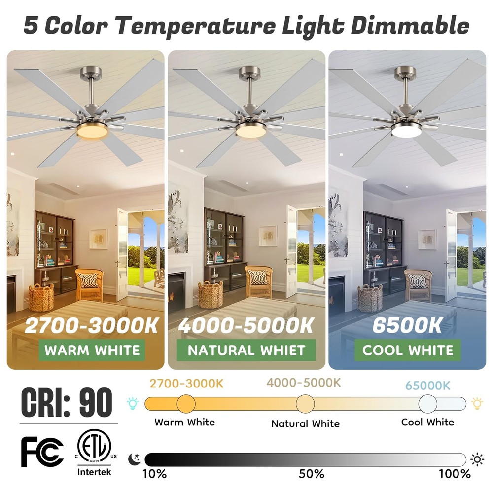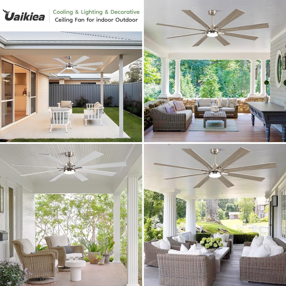 Experience superior air circulation and ambient lighting with this 72-inch ceiling fan, perfect for large indoor and outdoor spaces. Featuring a modern industrial design with 8 dual-finish blades and a powerful DC motor, this fan delivers exceptional performance while adding a stylish touch. The included light with 5CCT (Correlated Color Temperature) settings allows you to customize the ambiance, ranging from warm to cool white. Easily control the fan speed and light settings with the convenient remote control. Rated for damp locations, this versatile fan is suitable for bedrooms, living areas, patios, gazebos, porches, and even garages. With its large size and impressive airflow, this ceiling fan ensures optimal comfort and energy efficiency in expansive rooms or open-air environments. 72 INCH MODERN CEILING FAN: This big ceiling fan with light includes 10”, and 24“ down rods, making it a versatile choice for both low and high ceilings (12-32 inches high). Its stylish fan blades feature a sleek dual-color design in silver and light oak, perfectly blending industrial and modern styles. With 8 fan blades, the ceiling fan light offers a cost-effective and eye-catching solution, replacing the need for multiple smaller ceiling fans. Ideal for living room, garage, barn, or covered patio DIMMABLE & 3 COLOR-TEMPERATURES: This farmhouse ceiling fan with light uses an LED light (24W,2200LM )to provide brightness while saving 75% energy compared to traditional lamps. It offers 5 available color temperatures (2700K, 3000K, 4000K, 5000K and 6500K). The wet rated outdoor ceiling fan's remote control allows you to adjust the brightness from 10% to 100% HIGH CFM REVERSIBLE CEILING FAN: Brushed nickel ceiling fan has six speeds to choose from to meet your multiple airflow needs. In the summer, forward mode circulates air downward to cool you with a large ceiling fan with over 7594 CFM. In the winter, the reverse mode circulates air upward so that the warm air produced by your indoor heating unit is evenly distributed throughout the room.You can use it all year round. Complete control and comfort all year round CONVENIENT MULTI-FUNCTION REMOTE:The remote can be set to mute without any beeping, ensuring quiet convenience without disturbing your family. You can easily control 4 key features with the remote: 6 wind speeds ♮ breeze, reversible mode, 1/4/8-hour timer, Dimmable light, providing remarkable convenience SILENT DC MOTOR: industrial ceiling fan's DC inverter motor adopts thickened silicon steel sheets, thickened copper wires, and precision double bearings, which can more accurately control the airflow and motor surface temperature. Not only does it have a long service life, but it is also very quiet(noise level≦ 30db). Moreover, the energy-saving DC motor ensures eco-friendly operation, providing 75% more energy efficiency compared to traditional AC motors. Enjoy top-notch performance while saving energy OUTSTANDING CUSTOMER SUPPORT: : At we prioritize your 100% shopping satisfaction. This LED Ceiling Fan includes clear installation instructions and is backed by a 2-year customer support. If you have any questions or concerns. We're here to help. (Tip: Find our ceiling fans from your order and click on the Customer Support button)