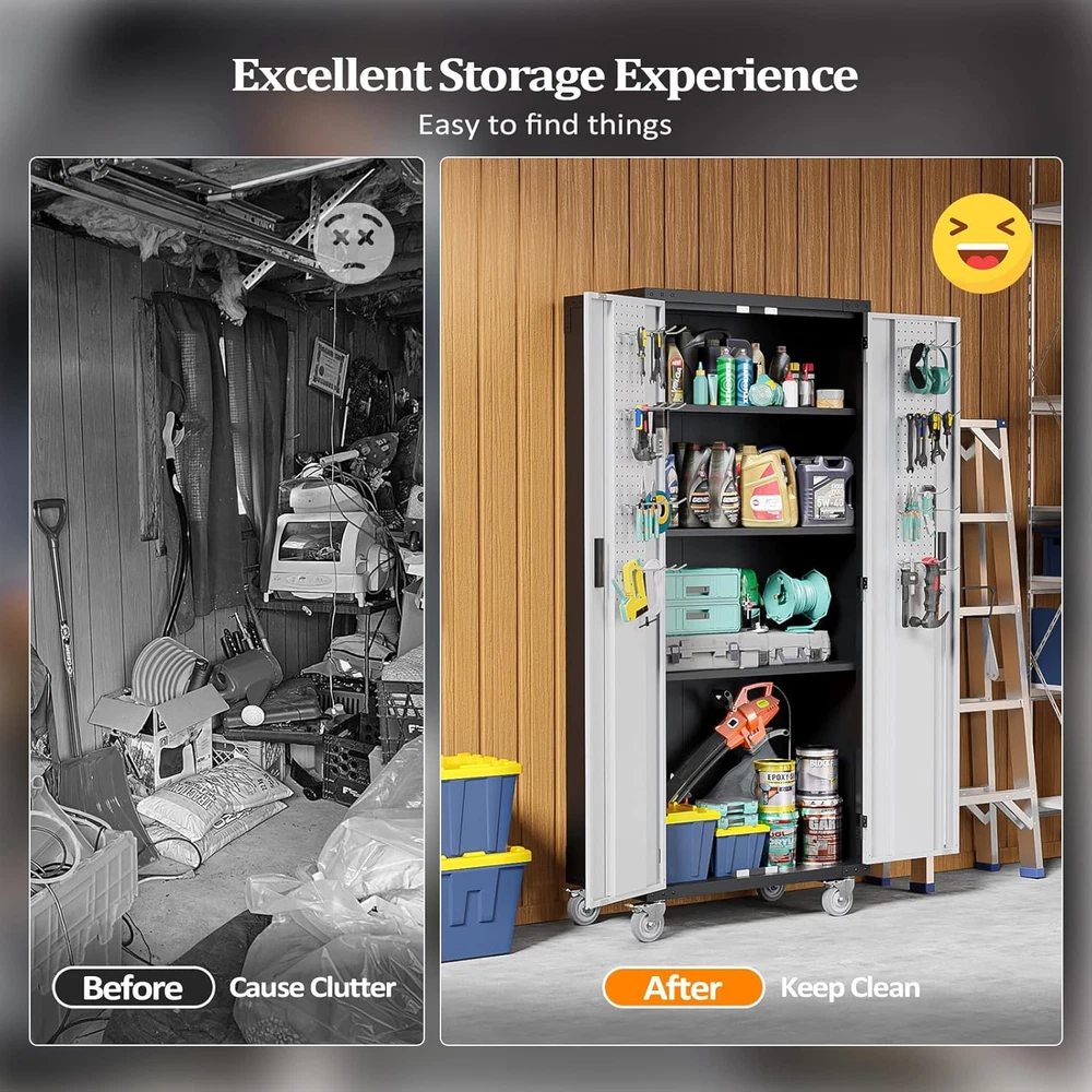 This cabinet is a game-changer for organizing my garage! The sturdy metal build feels durable, and the adjustable shelves make it super versatile. Love the pegboards for hanging tools and the locking doors keep everything secure. It fits perfectly in tight spaces but holds way more than expected. The sleek silver finish looks great and blends well with any decor. Highly recommend for anyone needing extra storage without sacrificing style!