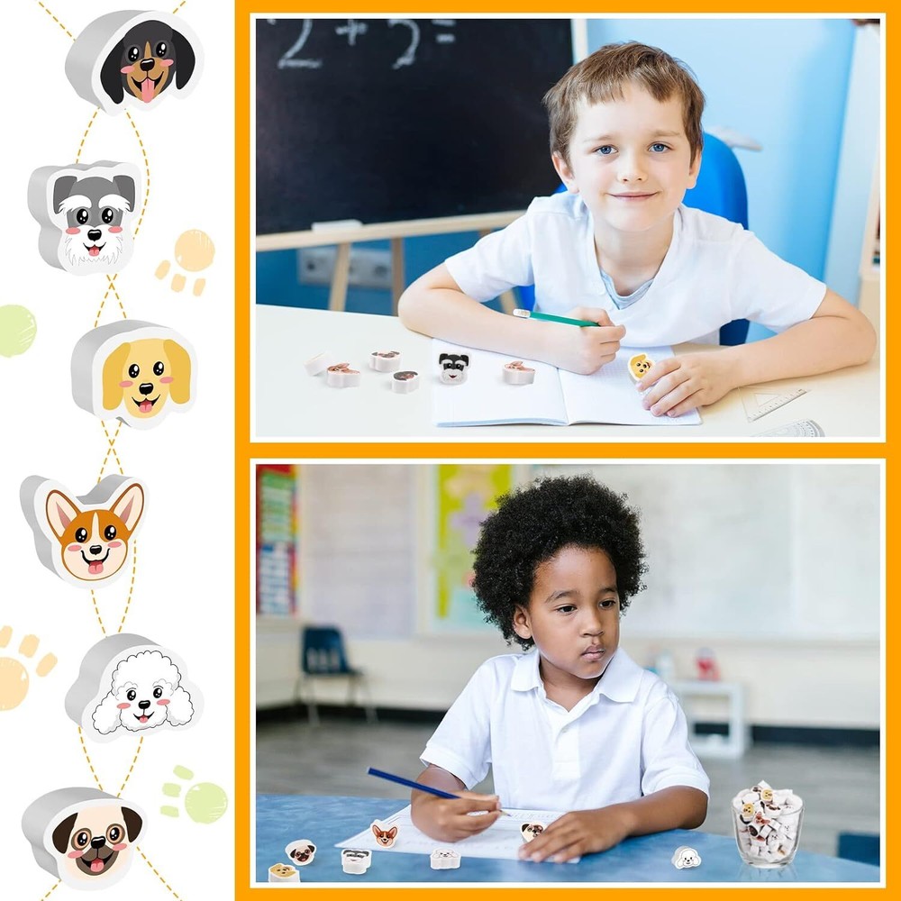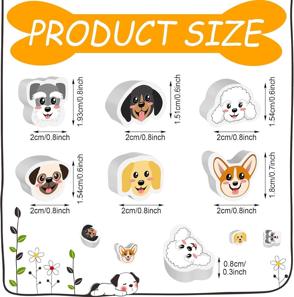 72 Pcs Cute Dog Erasers Back to School Gifts for Kids Animal Pencil Assorted Product Details Manufacturer: Chivao Brand: Chivao Item Weight: 8.4 ounces Package Dimensions: 6.34 x 6.3 x 0.67 inches Item model number: Chivao-875332 Color: Assorted Shape: Heart Material Type: Rubber Manufacturer Part Number: Chivao-875332 Brand: Chivao Color: Assorted Material: Rubber Recommended Uses For Product: For Classroom,Pencil Special Feature: Non-Toxic What You Receive: you will receive a package including 72 pieces of dog erasers in 6 styles, each style has 12 pieces, a nice combination and abundant quantity to satisfy your daily use and replacement Reliable Material: these kids pencil erasers are made of quality rubber material, reliable and safe to use, not easy to break or fade, no odor smell, so you can use them with confidence Cute Dog Design: these cute character erasers are designed with various dog patterns, such as poodle, pug, schnauzer, dachshund, corgi and golden retriever, vivid and interesting, they can easily attract people's attention Wide Range of Applications: these animal erasers are suitable for dog themed parties, graduation, class reunion and more, and you can use them in home, school, office, etc., which are widely applicable, you can use them according to your needs Convenient to Carry: designed in different sizes and shapes, these cute animal erasers are small and light, won't take up too much space in the pencil case, and won't add to the burden of teenagers and students, they are convenient to store and carry features:you can send these kawaii erasers to people who love dogs, which can show your warm heart and kindness. the person who receives this gift will be very happy.these dog erasers for kids not only can be applied to erase the wrong words, but also can be served as a teaching tool to teach the children to know the kind of dog, very practical, will bring you more convenient learning.specifications:material: rubbercolor: as the picture shownsize: as the picture shownpackage includes:72 x cute dog character erasersnotes:manual measurement, please allow slight errors on color may exist a slight difference due to different screen displays.suitable for people over 12 years old.