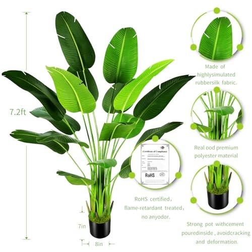 Return Policy Fast Delivery Trusted seller 7.2ft Artificial Silk Bird of Paradise Palm Tree (85in) with 17 Trunks Faux Tree and Plastic Nursery Pot, Fake Plant for Office House Farmhouse Living Room Home Decor (Indoor/Outdoor) Product Description 【BEST DECORATIONS】 Carefully crafted to mimic the appearance of a real-life Artificial Silk Bird of Paradise Palm Tree, looking as close to reality as possible, perfect for any room or office and outdoor decor, this fake bird of paradise tree will let you feel the presence of nature . All seasons are green. Perfect housewarming gift. 【HIGHLY REALISITC DESIGN】 This artificial tree is made of durable and premium polyester material, contains simulation textured bird of paradise palm leaves which made rubber silk fabric, the pot is covered with a layer of real moss, these designs make it to be life-like in appearance, the pot is made of solid cement which to prevent children, pets knock it down. 【WHY CHOOSE ARTIFICIAL TREE】 They are eternally deep green and full, leafs, maintenance-free, no watering, no mosquito, simply wipe clean with a damp cloth or duster when it get dusty. It will create a natural atmosp wver you place it. 【Safe Materials】 All materials are without any odor, so it is no problem even if placed in a sealed environment. 【STURDY AND ADJUSTABLE】 Our artificial silk bird of paradise palm tree outfitted with inner metal wires, you can adjust the leaves to the shape you like. This artificial plant will maintain its height, color and shape for years without pruning and shaping to ensure the aesthetic is maintained. Shipping Returns Payment Shipping Shipping is FREE to all addresses other than APO/PO boxes in the lower 48 states. All our stock ships from US-based warehouses. Shipped via USPS or UPS (depending on location and package weight) Unless stated otherwise, all orders will ship within 24-72 hours of your payment being processed. Check our feedback to see the great reviews of FAST shipping we offer. Returns Seller does not accept returns Payment We currently accept payment via eBay managed payments only. Once payment is cleared, we will dispatch your shipment within 1-3 business days. Please refer to the "Shipping" tab for more information regarding shipping speed to your destination.