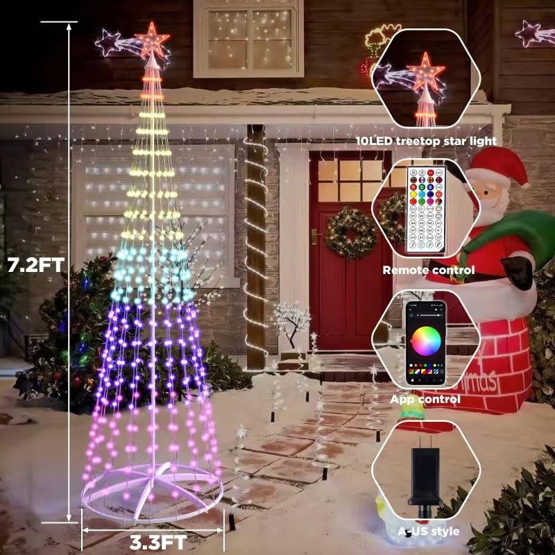 Elevate your holiday decor with the Outdoor Lighted Christmas Tree. This 7.2 FT tall artificial tree features 352 smart LED lights that can be customized via Bluetooth app or remote control. Enjoy a dazzling light show synchronized with music, or create your own DIY RGB lighting effects. With a timer function, you can set the tree to turn on and off automatically. Suitable for both indoor and outdoor use, this lighted Christmas tree adds a festive touch to your home or yard. Transform your space into a winter wonderland with the Outdoor Lighted Christmas Tree 7.2 FT Christmas Tree Lights: The outdoor xmas tree has a total of 352 LEDs, including 18 string lights and 1 treetop star. Each string of lights has 19 LEDs and the stars have 10 LEDs. 16 million colors, 40 built-in smart scenes, and 6 music modes to choose from Smart App Bluetooth & Remote Control: Manage your outdoor christmas tree with lights via smartphone and Bluetooth APP, a 44-key infrared remote control. Both iOS and Android devices can download the "Surplife" app Music Synchronization: The outdoor lit christmas tree lights can sync and dance to the rhythm of your favorite tunes, creating an immersive and festive experience. Perfect for parties; birthdays; weddings; Thanksgiving; and holiday decorations Convenient Features: Equipped with a timer function and DIY light show mode, allowing you to effortlessly schedule and personalize the display. The brightness and speed is adjustable from 1% to 100% to meet your needs Easy To Install And Reuse: We provide drawings and nstallation video of flagpole christmas tree, easy to assemble and no tools required. Folding christmas tree are small in size and easy to store and reuse