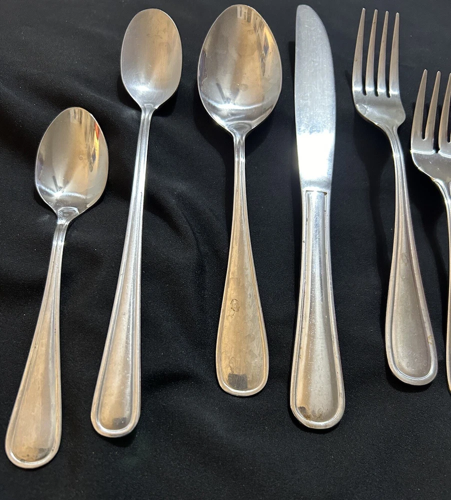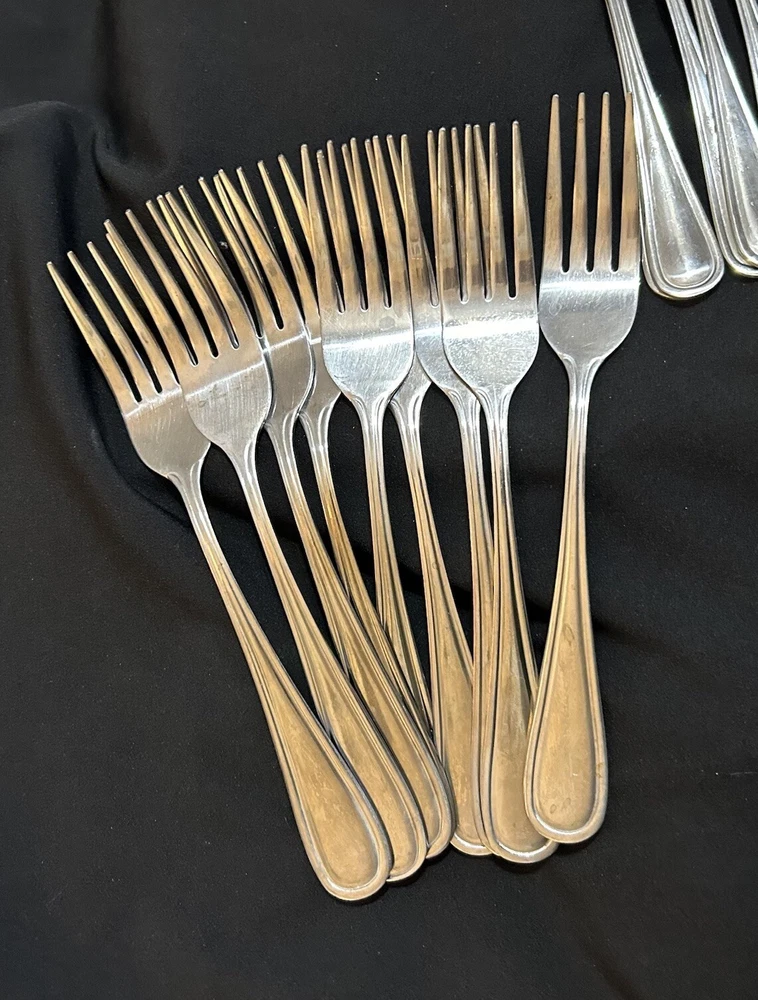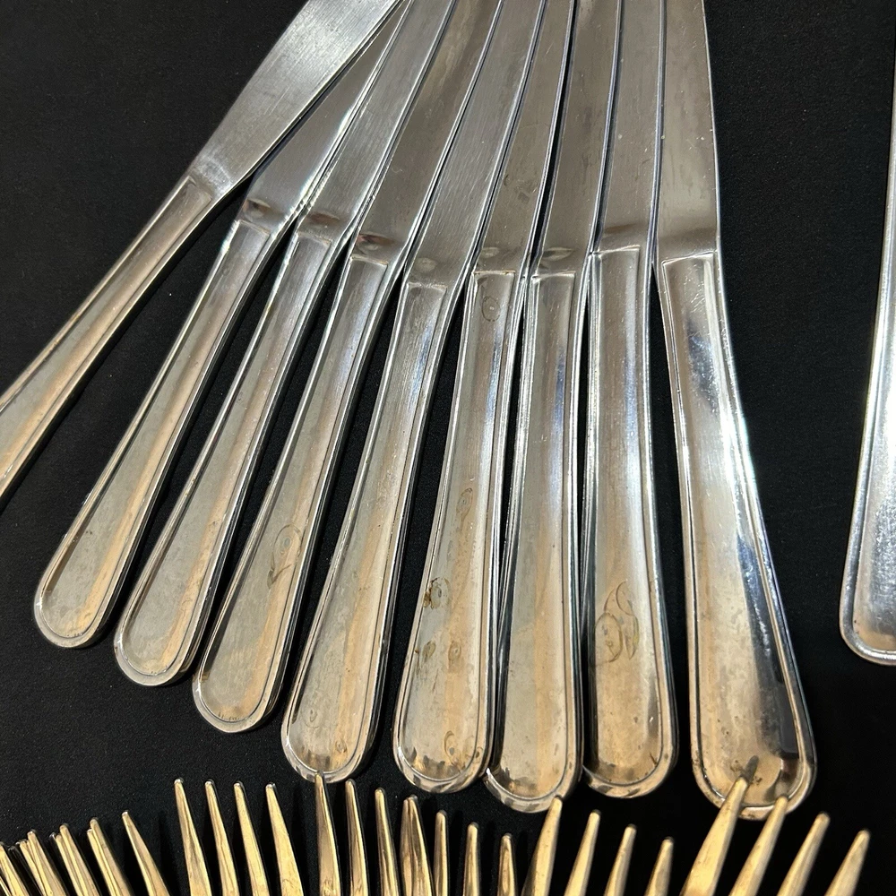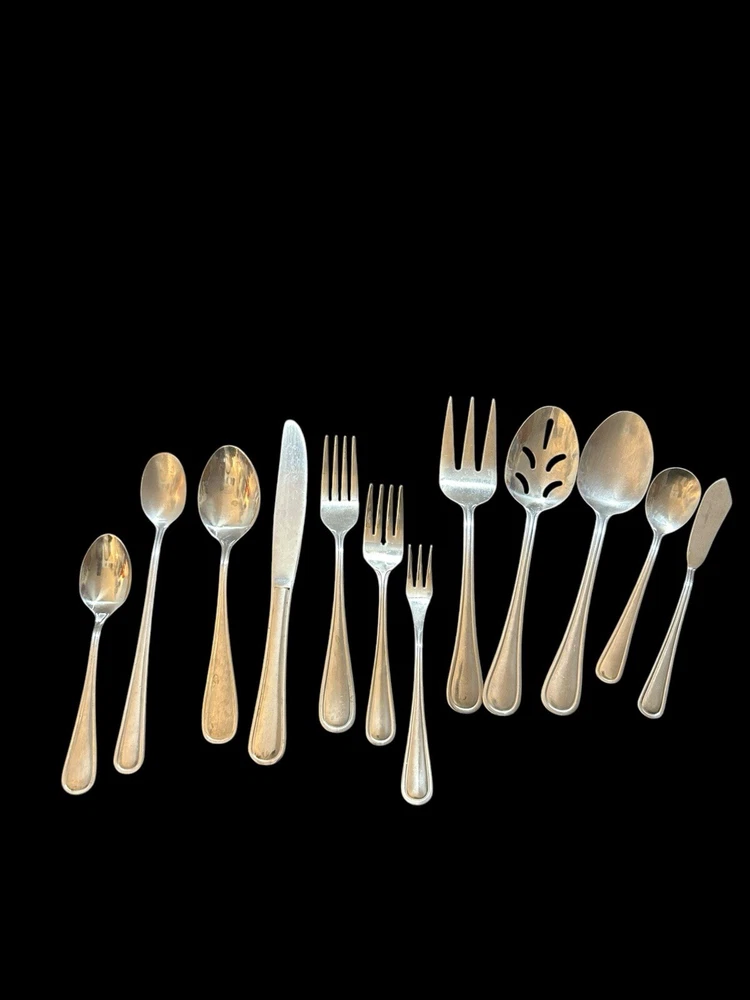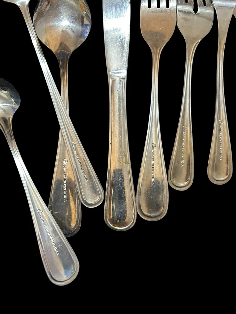 71pc Gibson Stainless Classic Dinner & Serving Hostess Set Forks Knives Spoons 12 Teaspoons 10 Dinner knives 12 Salad forks 9 Dinner forks 10 Dinner spoons 12 Cocktail forks 2 ice tea spoons 5pc Serving set Good vintage condition . Normal signs of wear and tear, Minor scratches, and some discolorations. Please study pictures carefully before purchasing Feel free ti ask any questions. Thank you for visiting our store! Bag70A