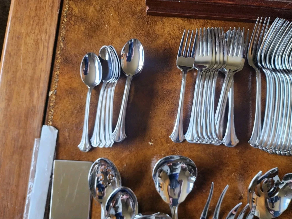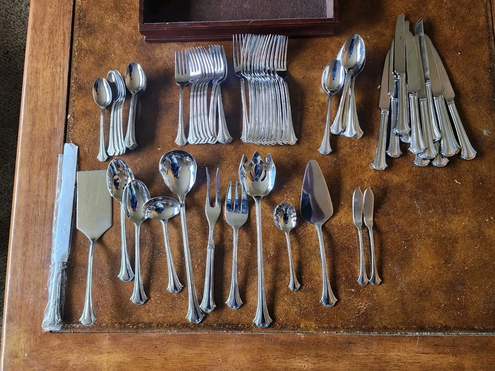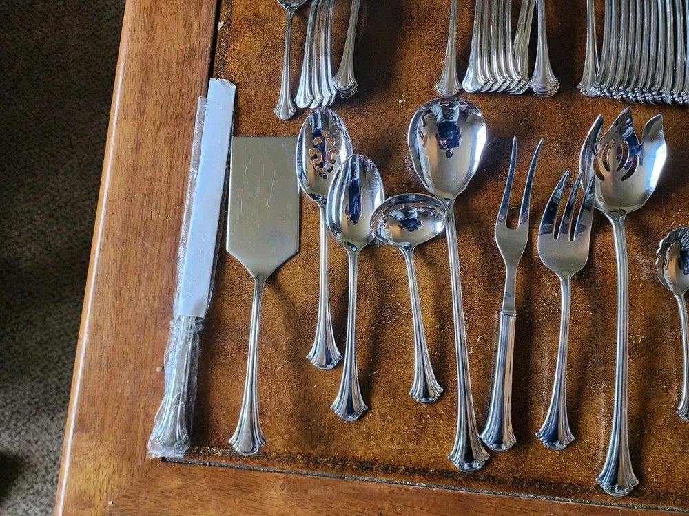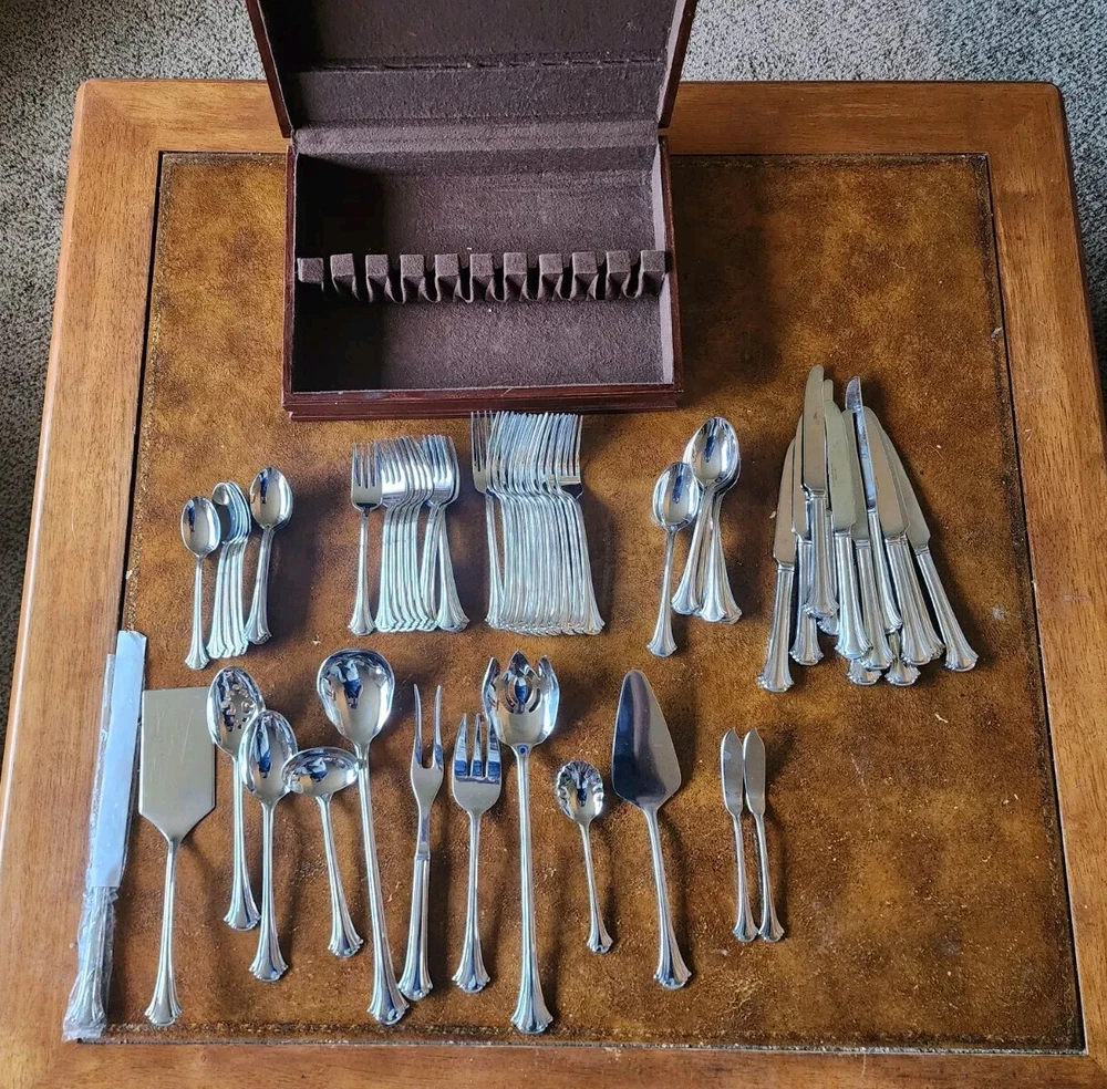 You will receive exactly as pictured. Set is in good condition but it is recommended that it be washed before use. There are 12 butter knifes, salad forks, dinner forks, soup spoons and spoons. The rest is as pictured. The case has a few scuffs but is in overall good condition. Please contact me with any questions before bidding or purchasing. If purchased, any issues you may have will be immediately resolved. Domestic shipping only.
