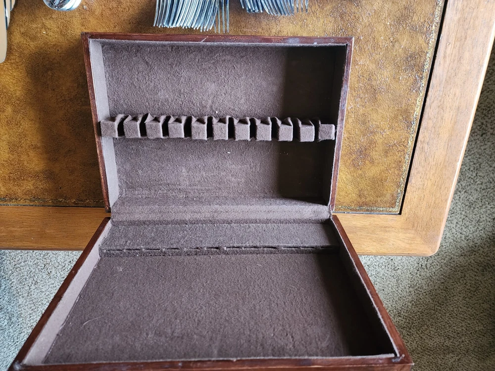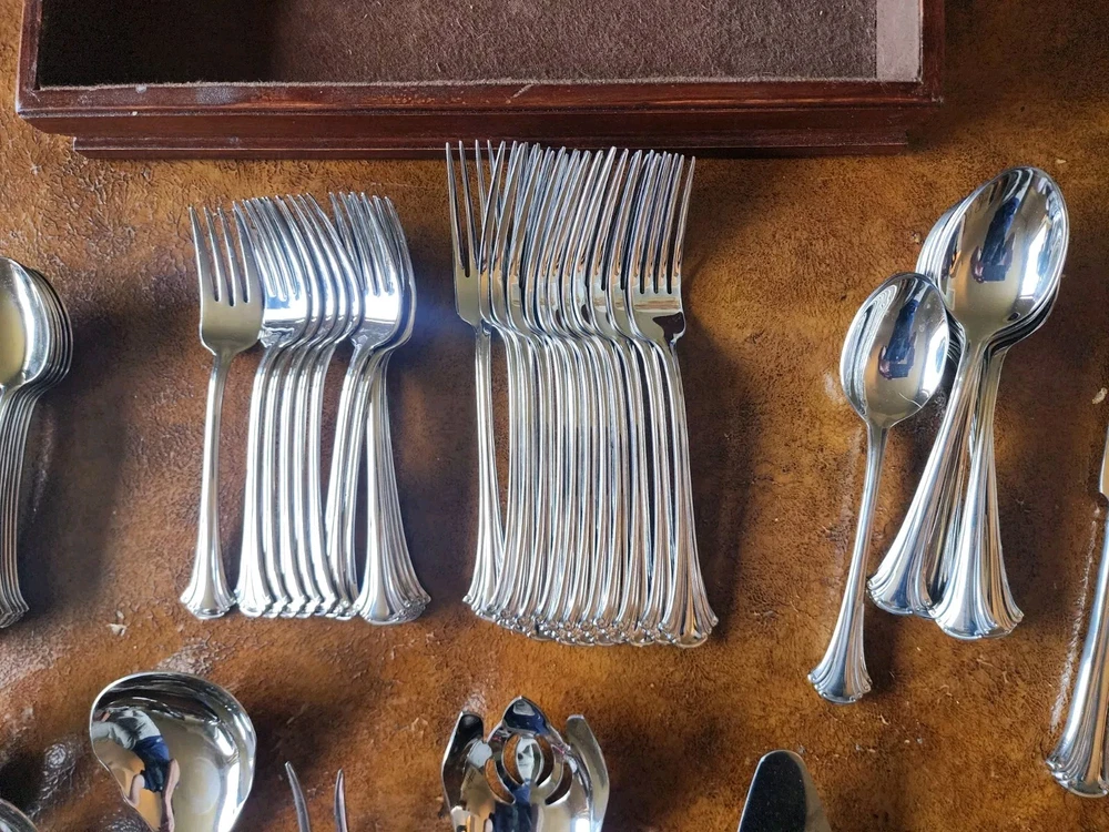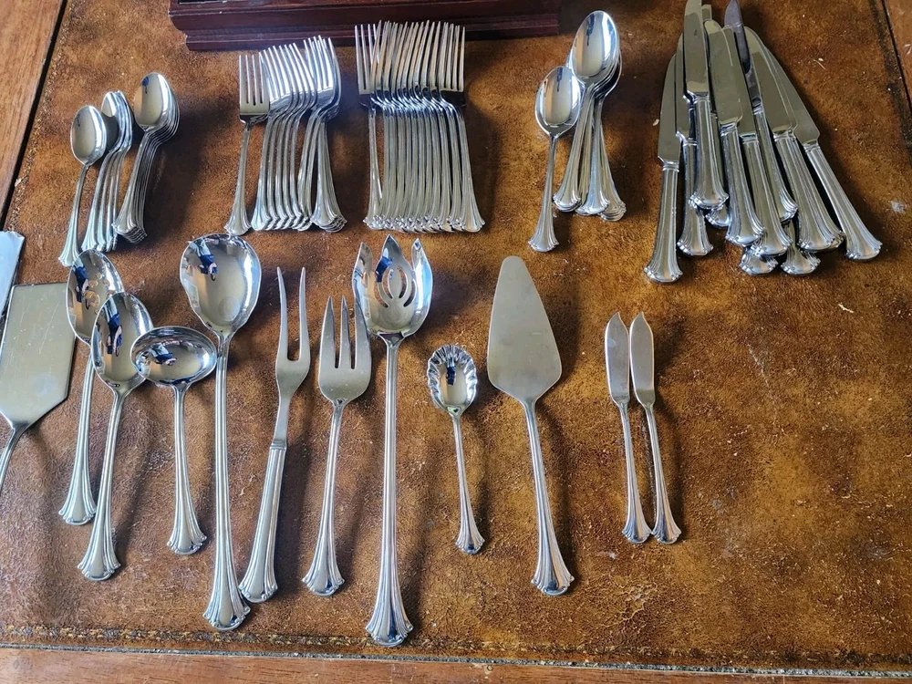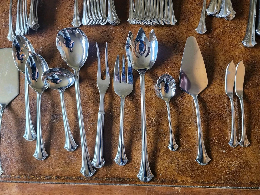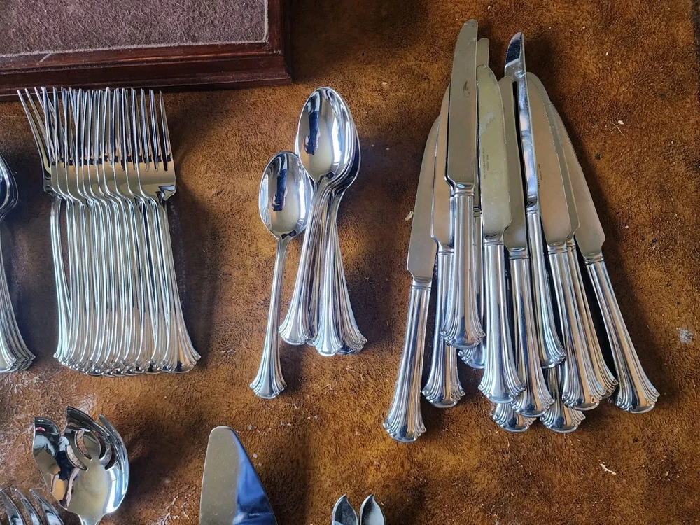 You will receive exactly as pictured. Set is in good condition but it is recommended that it be washed before use. There are 12 butter knifes, salad forks, dinner forks, soup spoons and spoons. The rest is as pictured. The case has a few scuffs but is in overall good condition. Please contact me with any questions before bidding or purchasing. If purchased, any issues you may have will be immediately resolved. Domestic shipping only.