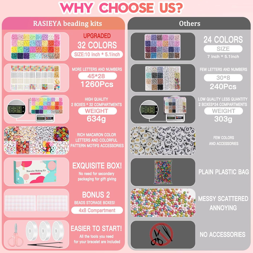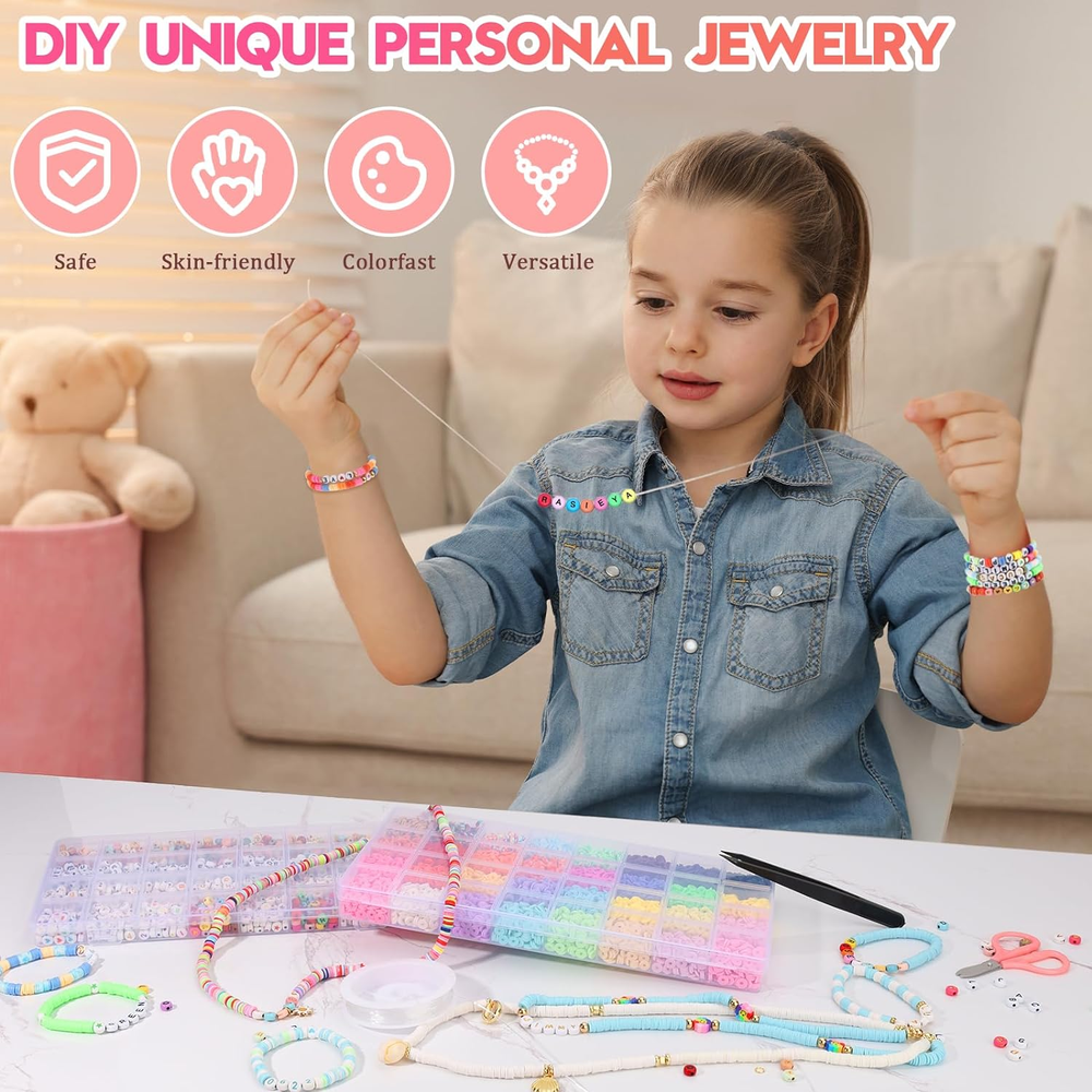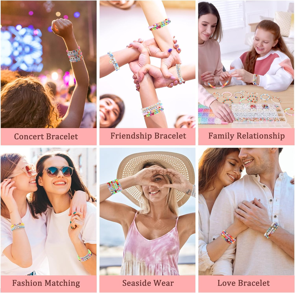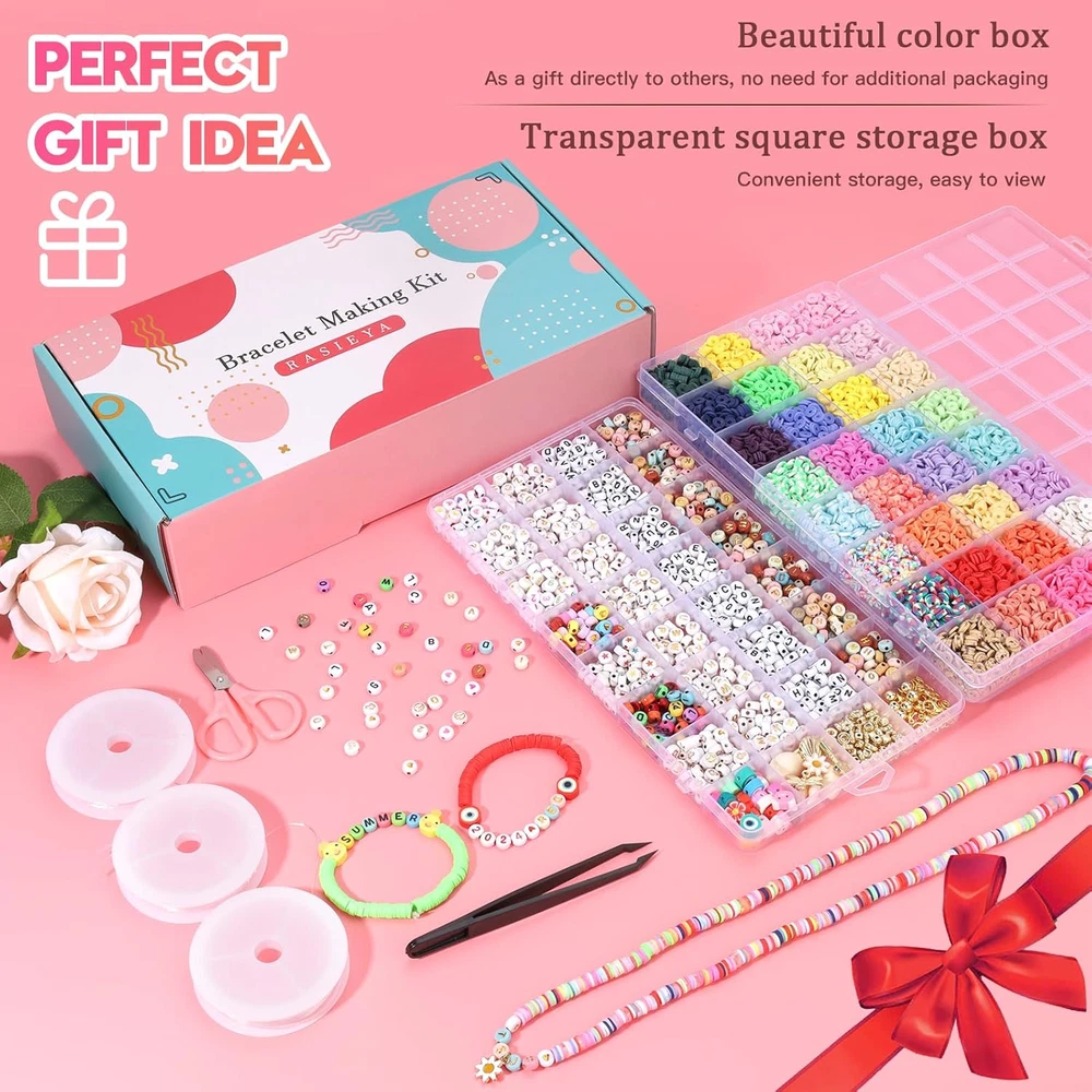 【Upgraded Complete Configuration - Meet All Your Needs】 Our bracelet making kit is unique in the market, offering a wide range of styles and colors for you to choose from, so you can mix and match.2 boxes, including 6080pcs of 32-color flat clay beads, 1260pcs of A-Z letter beads, 0-9 number beads, patterned beads (heart beads, star beads, cross beads, and peace beads), and a variety of spacer beads, pendants, shells, polymer clay beads and other ornaments. Also provided are 3 coils of elastic string, 1 pair of scissors and 1 pair of plastic tweezers. 【Valentines for Kids Classroom】Making DIY bracelets is a fun and creative Valentine’s Day activity for kids (Ages 6 and up) in the classroom! This craft allows children to create personalized Valentine gifts for friends and classmates, fostering creativity and hands-on skills. It’s a wonderful way to celebrate friendship and kindness, as students can exchange their handmade bracelets and share heartfelt messages. Not only does it promote teamwork and sharing, but it also creates lasting memories that kids can cherish and even share with their families! A perfect way to spread love and joy in the classroom this Valentine’s Day. 【Perfect Gift】 Handmade gifts often express personal feelings the best! Buy one now! You can either give the bead bracelet kit directly as a gift to DIY lovers, or you can make different bracelets by yourself to give people at special times such as birthdays, anniversaries, festivals(such as Valentine's Day, Halloween, Christmas Eve, Christmas Day), etc., so that the bracelet can connect with each other's emotions. Compared with other products, our bracelets kit is better in terms of color, style, quantity, quality and packaging,making the bracelet more beautiful! 【Ideal Fashion Accessories】This clay beads bracelet making kit is not only suitable for making bracelets but also for making necklaces, anklets, waist chains, cellphone chains, purse pendants,etc. The beads for bracelets provided in the bracelet kit not only follow current popular colors but also have smooth edges, clear holes, and non-fading surfaces, making the final product perfect for beach outings and shopping trips. 【Friendship Bracelet Making Kit】Swapping friendship bracelets has become an essential activity for fans at concerts. On the bracelet, you can use alphabet beads and number beads to spell out any meaningful words such as album name, song title, lyrics, person's name, birthday and other meaningful words. And then play to the imagination to add pattern beads, flat clay beads, gold spacer beads and other accessories to make a one-of-a-kind friendship bracelet. Each bracelet with friendship bracelet beads carries a symbol of the fans' love for the singer and their goodwill towards each other! Product Description