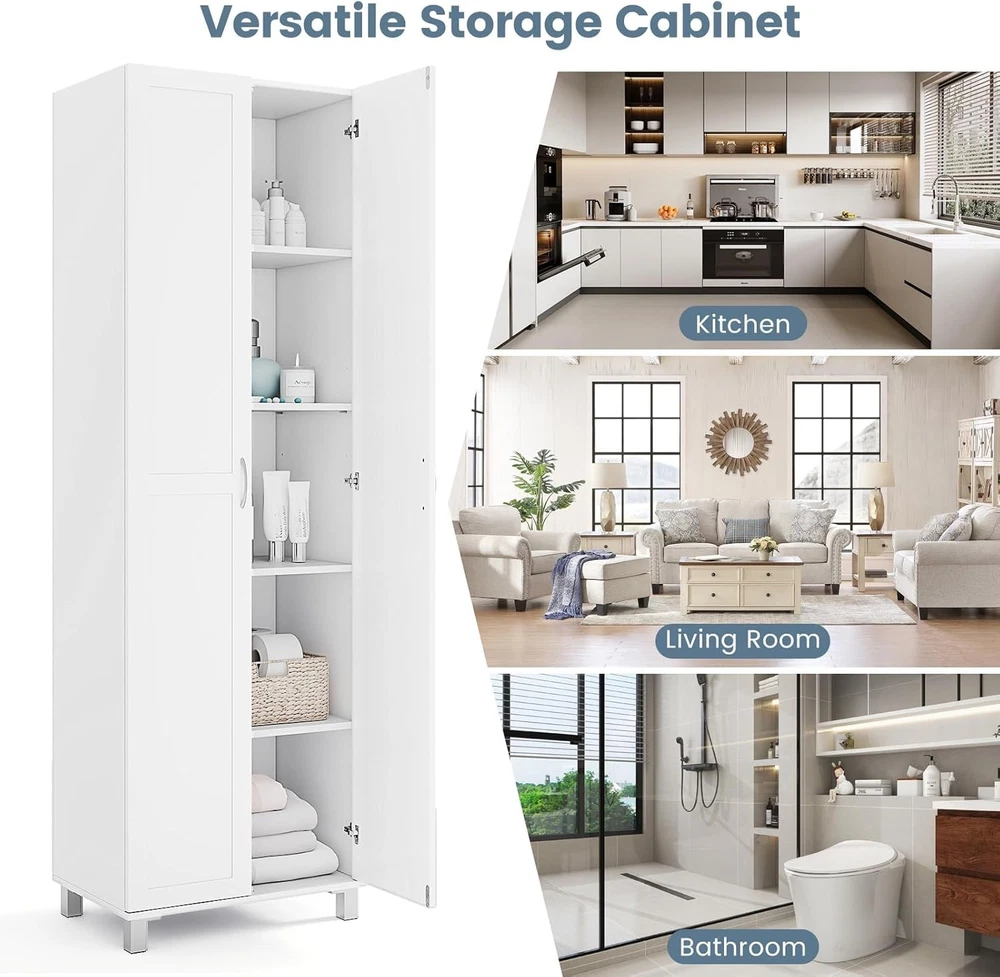 Product Description About this item Clutter-free Storage Solution: The storage cabinet features 5 storage shelves to enlarge storage capacity and classify daily supplies, such as books, documents, and kitchen utensils, capable of catering to different needs. Plus, this double door cabinet gives you ample private storage space, thus to keep a neat and tidy room. Customized Storage Space: The storage organizer comes with 3 fixed shelves and 1 adjustable shelf for flexible usage. Moreover, the shelf can be adjusted in 4 positions freely, which makes it easier to accommodate a variety of different sized items. And you can remove the partition to be a large storage shelf. Ultra Stable & Rugged Structure: Made of thick engineered wood and MDF, our floor cabinet shows perfect performance in lasting durability. Besides, equipped with anti-toppling device, the pantry cabinet can be fixed to the wall to prevent wobbling or tipping over. 4 heavy-duty support legs further enhance stability. Modern Style & Versatile Use: With modern style and elegant appearance, this freestanding storage cabinet adds refined sensation to your home and matches seamlessly with interior decoration. The utility storage organizer is an ideal choice for living room, bathroom, kitchen or any other space. All for Your Convenience: Metal handles are easy to open and close the door while magnetic door catch keeps the cabinet closed firmly. Under the detailed guidance of instruction, you can put all parts together effortless. The smooth surface will not take you too much time and effort in daily clean-up and maintenance.