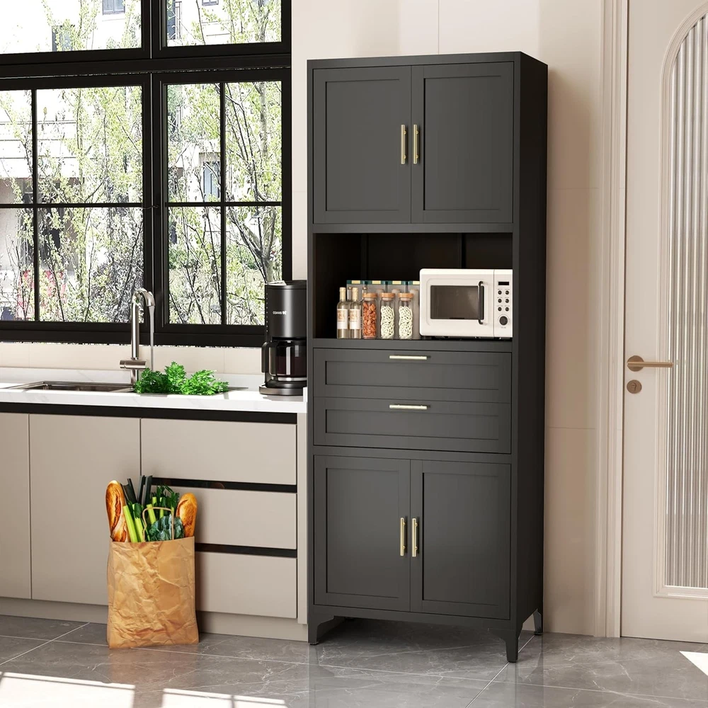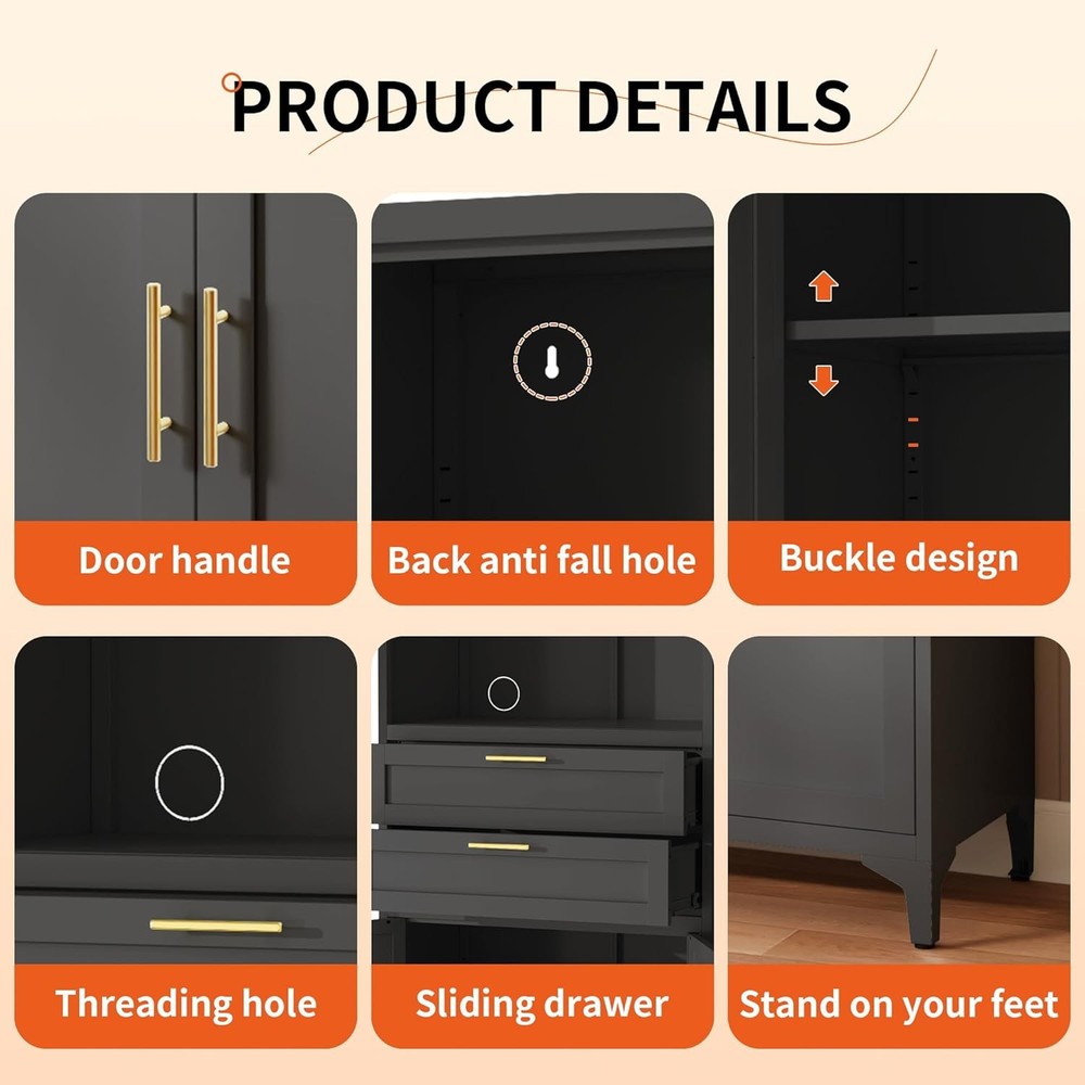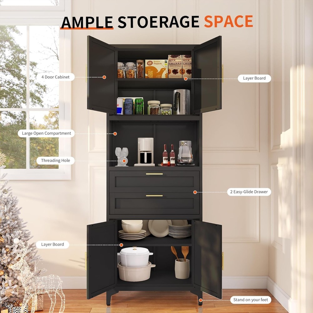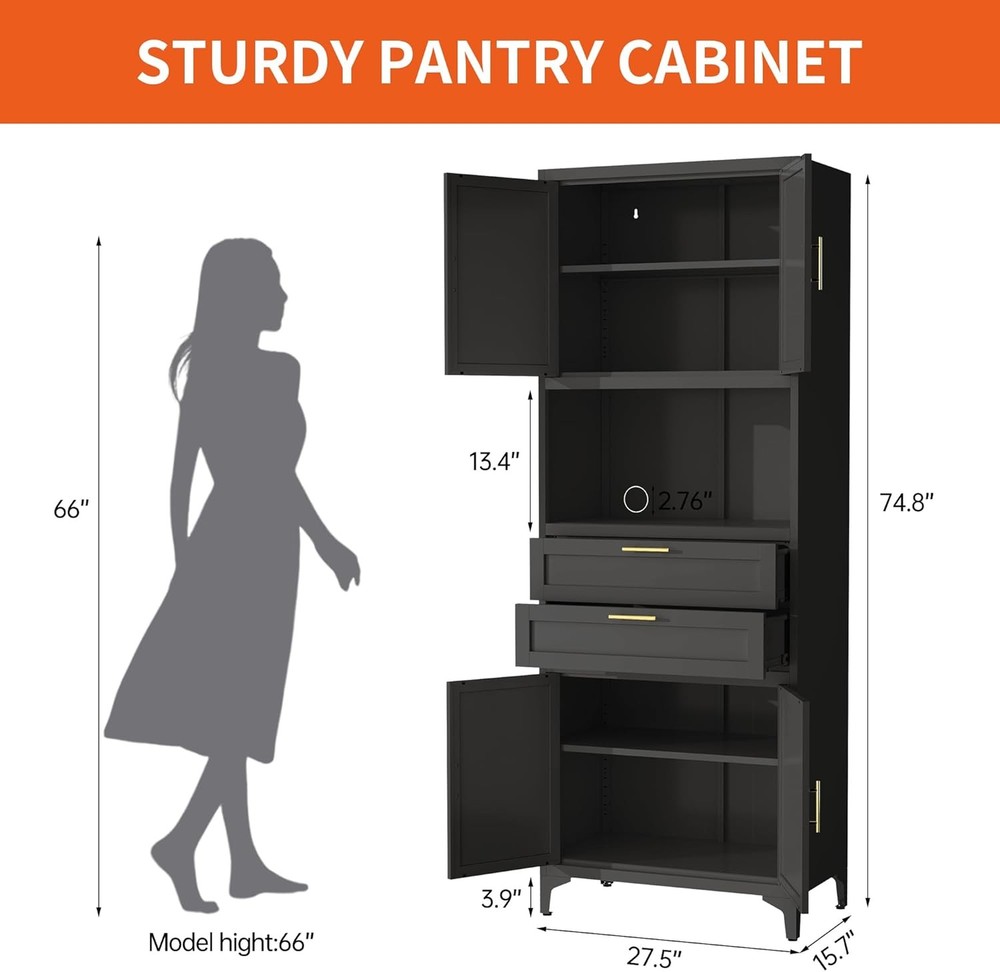 Product Description About this item [Smart Storage & Style]Our kitchen cabinet showcase versatile storage solutions, elegantly blending utility with aesthetics. Storage cabinet has a quiet drawers, an open countertop, and dual magnetic-closure cabinets. Inside, the adjustable metal storage cabinet empower you to tailor the layout to your needs. An open countertop with two cable management holes adds some workplace, ideally suited for kitchens, dining rooms as a buffet or microwave station, and living rooms as a console or coffee bar.This storage cabinet with doors and shelf is truly a chic and adaptable addition to any space [Robust & Safe Construction] The Garage storage cabinet is made of high-strength and cold rolled steel plate panels. This kitchen cabinet is covered in a scratch-resistant and matte black finish that's easy to clean and maintain. Bathroom storage cabinet's durable construction resists warping over time, ensuring longevity. Moisture-proof paint safeguards against humidity, making metal cabinet perfect for damp areas like bathrooms and kitchens. Enhanced with feet and pads, the black cabinet stands steady without damaging floors. Equipped with anti-tip wall mounting holes at the back, garage cabinets can be securely fastened to the wall using included hardware [Elegant Design, Space-Smart] Boasting a sleek and fashionable look, this office storage cabinet is adorned with elegant gold twin handles, harmoniously complementing diverse home decorations. Measuring 27.5"W*15.7"D*74.8"H, freestanding kitchen pantry efficiently conserves space while optimizing storage capacity, neatly accommodating dishes, small appliances, snacks, and more. Transform any space into an epitome of organized sophistication with this elegantly designed utility cabinet [Effortless Assembly, Instant Satisfaction] These storage cabinets with doors and shelves are supplied with full assembly instructions and all the necessary accessories (gloves and screwdriver) to ensure a smooth assembly process. Boasting a modular design, the assembly is straightforward and intuitive, empowering you to easily piece together your black storage cabinet without effort. Whether you're setting up a new home or enhancing your current space, the pantry cabinet serves as the ideal choice for instant enhancement [Premium Service, Efficient Aftercare]Dedicated to exceeding your expectations, we offer top-quality storage cabinets at affordable prices, backed by exceptional customer service. Should you have any queries about your cabinet, feel free to reach out, we pledge to respond within 24 hours, ensuring prompt and attentive support. Your satisfaction remains our ongoing commitment