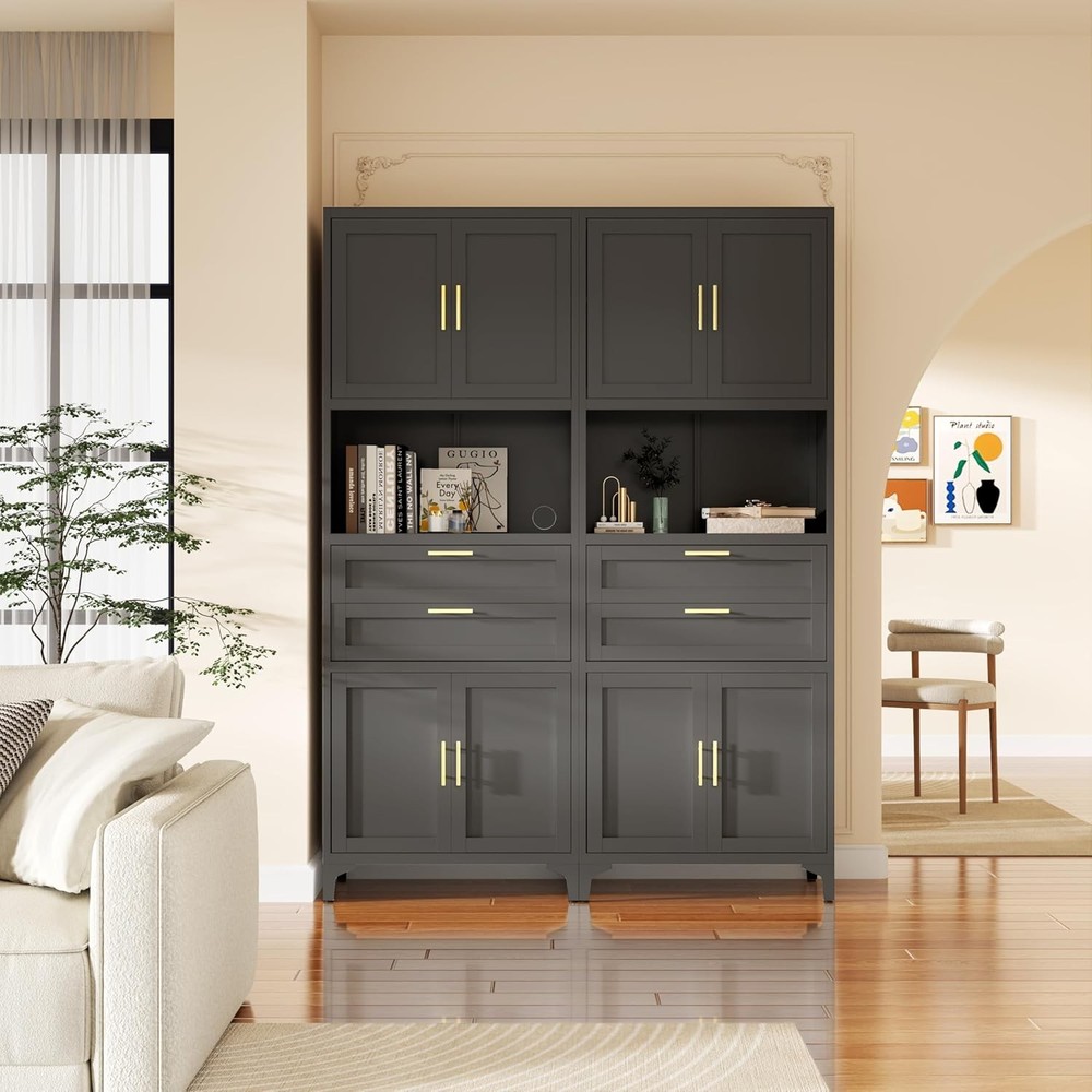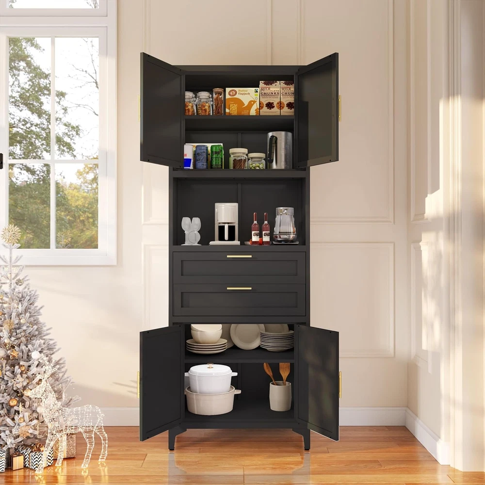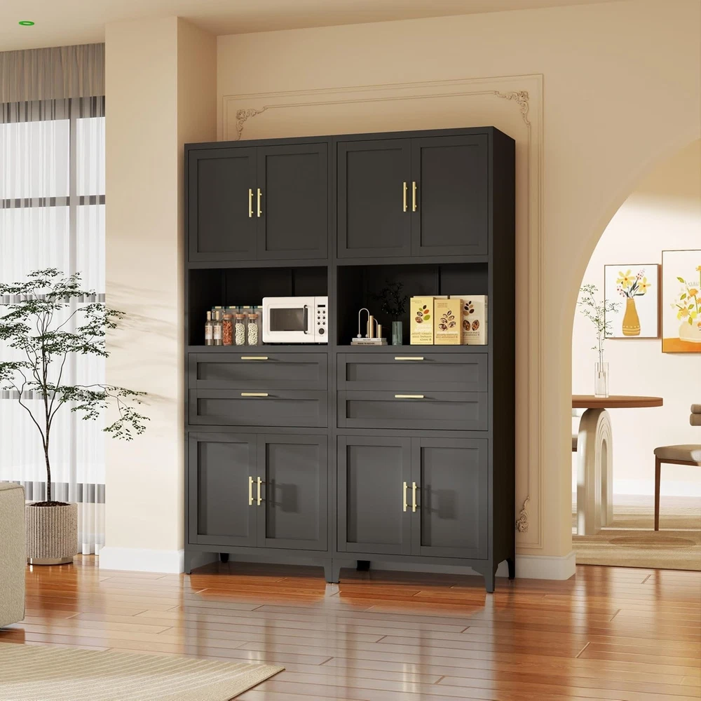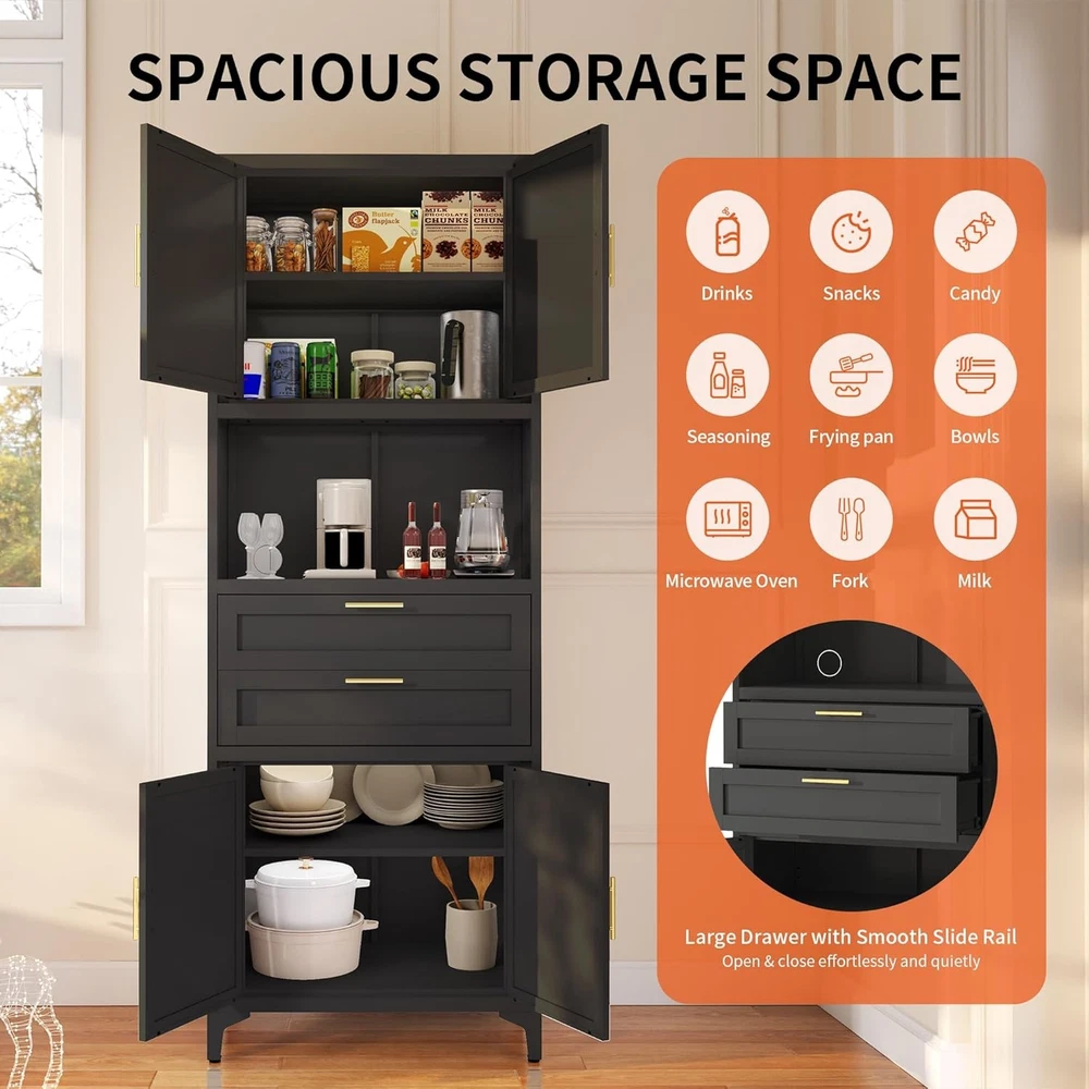 Product Description About this item [Smart Storage & Style]Our kitchen cabinet showcase versatile storage solutions, elegantly blending utility with aesthetics. Storage cabinet has a quiet drawers, an open countertop, and dual magnetic-closure cabinets. Inside, the adjustable metal storage cabinet empower you to tailor the layout to your needs. An open countertop with two cable management holes adds some workplace, ideally suited for kitchens, dining rooms as a buffet or microwave station, and living rooms as a console or coffee bar.This storage cabinet with doors and shelf is truly a chic and adaptable addition to any space [Robust & Safe Construction] The Garage storage cabinet is made of high-strength and cold rolled steel plate panels. This kitchen cabinet is covered in a scratch-resistant and matte black finish that's easy to clean and maintain. Bathroom storage cabinet's durable construction resists warping over time, ensuring longevity. Moisture-proof paint safeguards against humidity, making metal cabinet perfect for damp areas like bathrooms and kitchens. Enhanced with feet and pads, the black cabinet stands steady without damaging floors. Equipped with anti-tip wall mounting holes at the back, garage cabinets can be securely fastened to the wall using included hardware [Elegant Design, Space-Smart] Boasting a sleek and fashionable look, this office storage cabinet is adorned with elegant gold twin handles, harmoniously complementing diverse home decorations. Measuring 27.5"W*15.7"D*74.8"H, freestanding kitchen pantry efficiently conserves space while optimizing storage capacity, neatly accommodating dishes, small appliances, snacks, and more. Transform any space into an epitome of organized sophistication with this elegantly designed utility cabinet [Effortless Assembly, Instant Satisfaction] These storage cabinets with doors and shelves are supplied with full assembly instructions and all the necessary accessories (gloves and screwdriver) to ensure a smooth assembly process. Boasting a modular design, the assembly is straightforward and intuitive, empowering you to easily piece together your black storage cabinet without effort. Whether you're setting up a new home or enhancing your current space, the pantry cabinet serves as the ideal choice for instant enhancement [Premium Service, Efficient Aftercare]Dedicated to exceeding your expectations, we offer top-quality storage cabinets at affordable prices, backed by exceptional customer service. Should you have any queries about your cabinet, feel free to reach out, we pledge to respond within 24 hours, ensuring prompt and attentive support. Your satisfaction remains our ongoing commitment