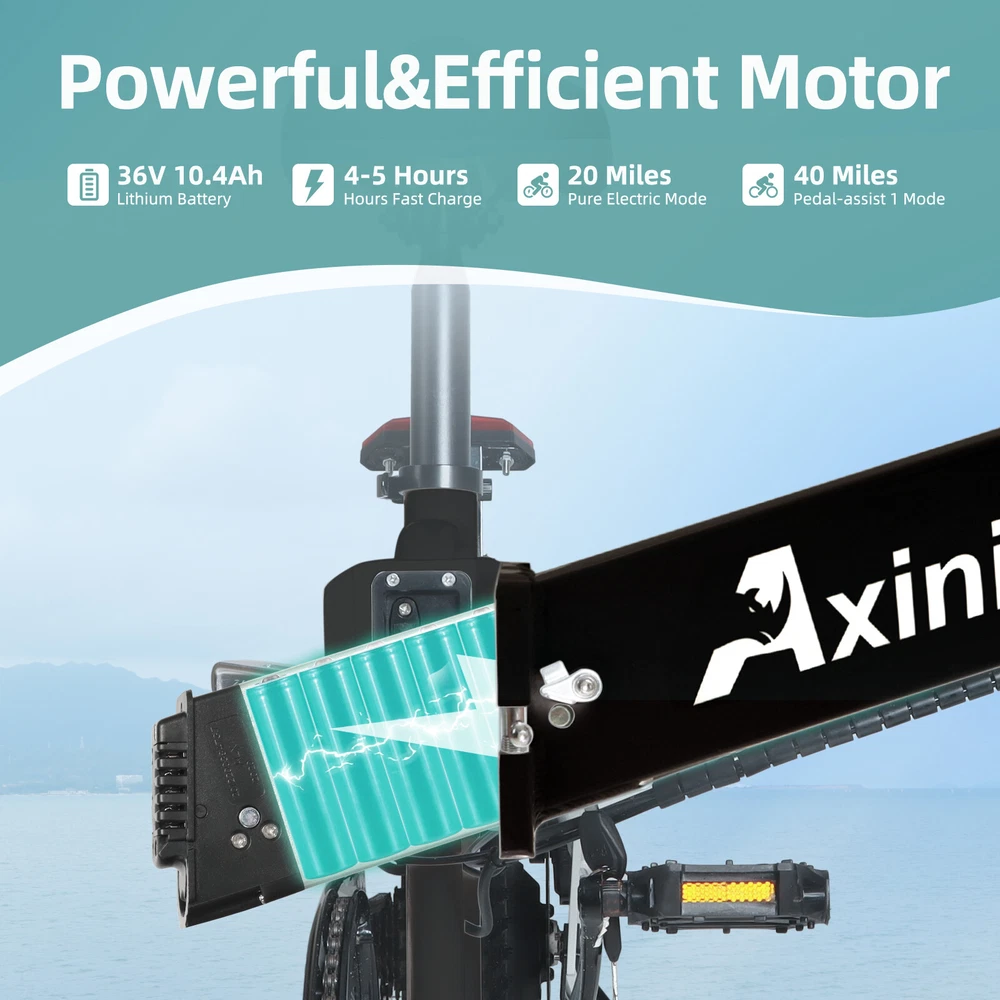 About this item: 【4 WORKING MODES】 - Our Electric Bike is a powerful and cost-effective road e-bike. 1. Pedal Assist Mode 2. Fully Electric Mode 3. Pedal Mode 4. Walk Mode.Four riding modes switch easily for enjoying a long time travel, and also exercise. 【INTELLIGENT LCD DISPLAY DESIGN 】Our Electric Bike has an intuitive, readable LCD display shows you the speed, battery, mileage and more. The LCD display visualizes your riding data, providing your navigation with more confidence and fun.With its adjustable seat, and step-thru frame, it allows different sized riders to use the bike easily. 【POWERFUL MOTOR & REMOVABLE BATTERY】 Our Electric Bike is equipped with a 750W brushless motor, provide enough power for your daily outings.Up to 25mph Top Speed. 36V 10.5AH large removable battery is strong enough for these activities. The ebike can ride 40 miles by pedal assist after charging 4 - 6 hours, long battery life. 【COMFORT MEETS STYLE & RICH CONFIGURATION】 Our Electric Bike made of high-strength carbon steel frame and superior bike paint. Ergonomic and stylish step-thru design, enlarged comfortable seat. LED Headlights and rear reflectors for safe riding.Please note every new bike has gone through road testing before packing, there may be some dust on the tires. 【 Axiniu 7-SPEED & 20'' ELECTRIC BIKE】 Our Electric Bike with 20" inch puncture resistant tires. Axiniu 7-speed drive-train provides accurate and smooth shifting to ensure safer travel. Cityscape lets you get across city like never before! The high-quality dual disc brakes make your cycling safer. 【EASY TO INSTALL,READY TO GO】 Our Electric Bike is 85% pre-assembled with instructions and tools included.The installation video is attached to our product page.Our electric bike is the perfect electric bicycle for beginners because of its intuitive and accessible design. Our warehouses and after-sales centers in CA,USA to ensure the fastest delivery and quickly solving your problem. 3 years warrantly /12 hours fast reply. The item is UL 2849 certified Features: 36V/10.5Ah Removable Built-in Lithium-ion Battery 750W Powerful Brushless Motor Large Intuitive LCD Display & Adjustable handlebar Light: 20W front headlights+tail lights with brake lights Package Included: 1 X 20'' Electric Bicycle with Battery 1 X Battery Charger 1 X Free U-lock Kit