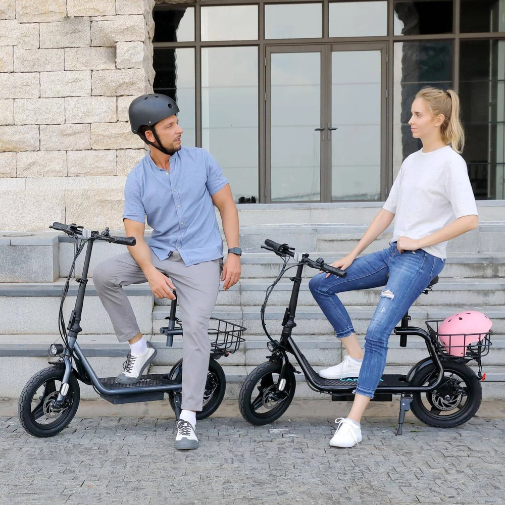Product Description About this item đ´ăPowerful Motor & Long Battery LifeăCaroma electric scooter adults with a 750W(Peak 1200W) electric brushless hub motor allows for speeds up to 20mph. This adult electric scooter has a capacity 48V battery with a max travel range of up to 30 miles under specific conditions and a maximum load of 300 lbs. đ´ăSmooth & Safe RidingăE scooter for adults with Larger 14" rubber pneumatic tires increases shock absorption from bumpy city riding, bringing a smooth ride. Caroma escooter electric for adults with a 9.5" wide deck and adjustable saddle make it more comfortable even on a long-range commute. Disc brake & E-ABS, ensuring an effective braking distance and safety. đ´ăDesign for CommutersăEletric scooter for adults comes with a basket above the rear wheel, perfect for shopping trips and short errands around the block. Built-in spot headlight makes the road visible and safe to ride at night. đ´ăFoldable & Easy to CarryăElectric scooter with seat for adults has a folding design. The compact folded size makes it easy to store in car trunks and other tight spaces, detachable scooter seat is included. Electric Scooter with Seat & Basket